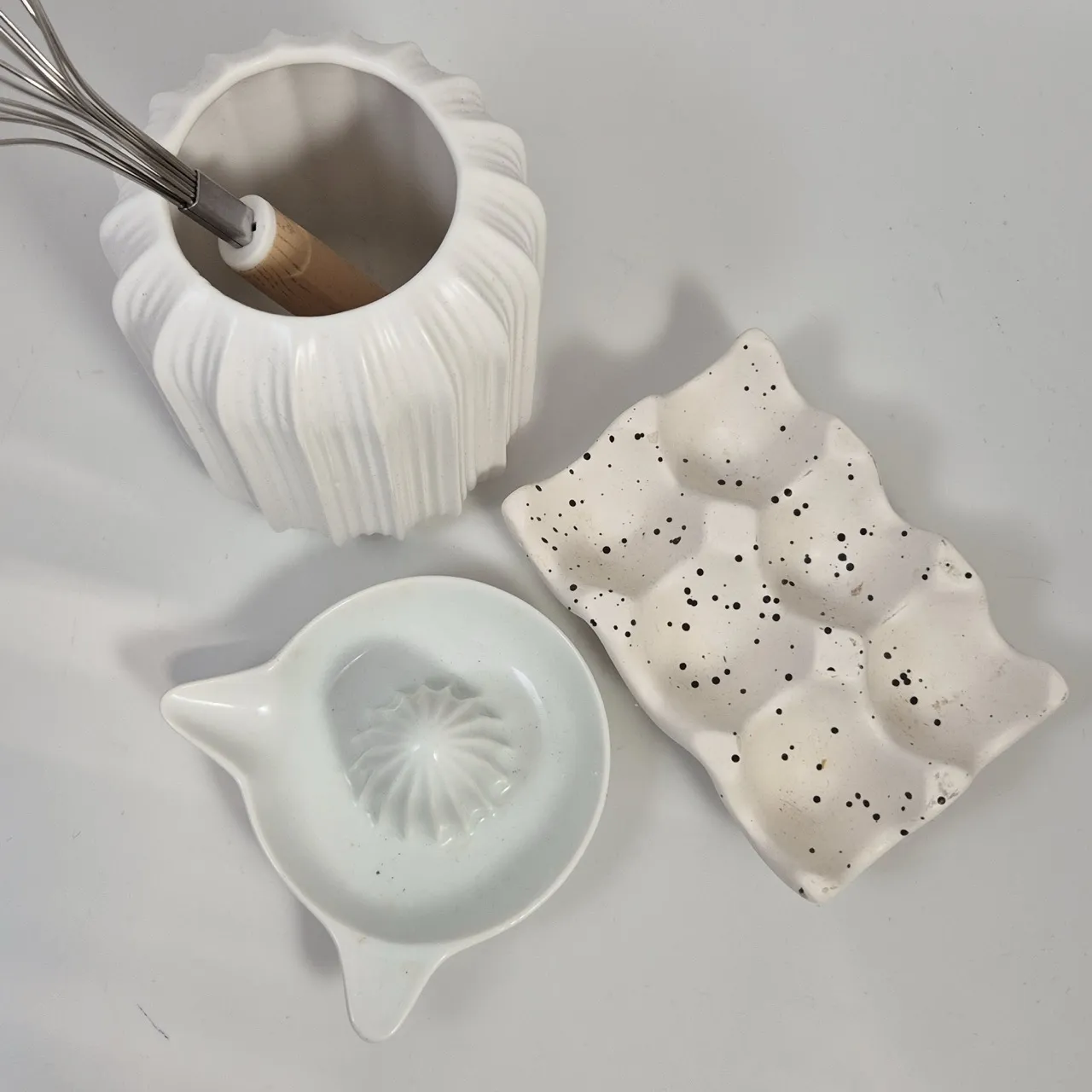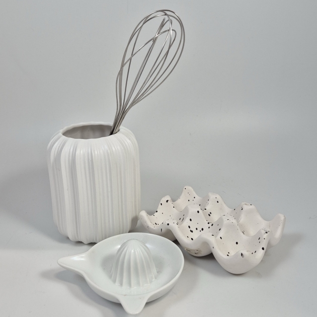 Ägghållare keramik, citruspress porslin, visp, vas