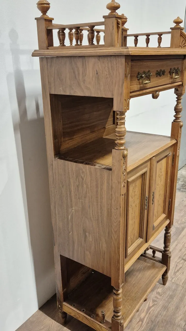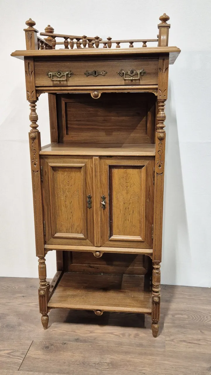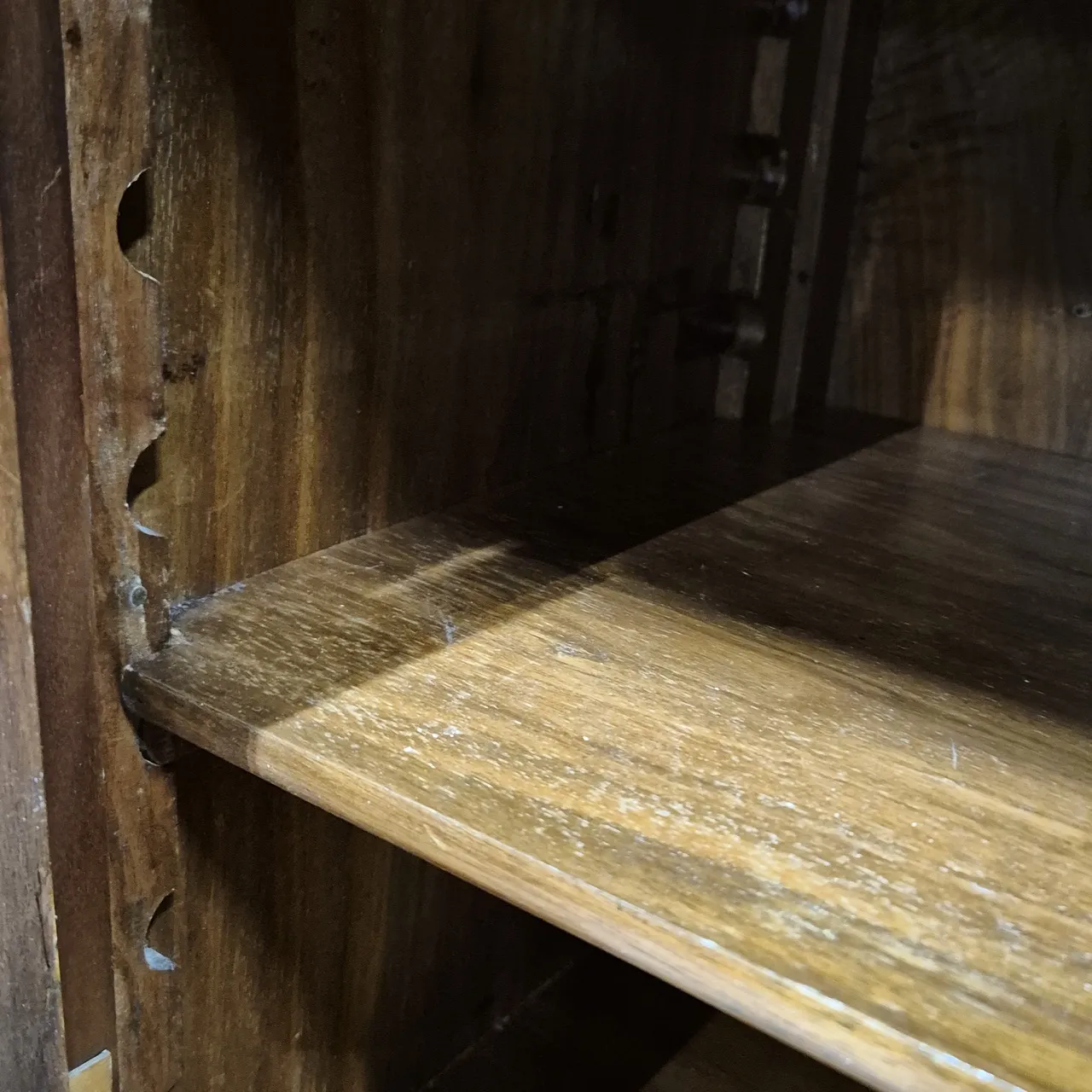 Smäcker hylla med skåp. Nedre list fattas . Diverse reservdelar finns.  Saknas vissa delar. Flyttbart hyllplan i skåpet . H.149cm 68x40cm