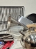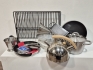 Diskställ, stekpanna, matlådor i glas, springform, kastrull, visp, vitlökspress, örthackare, sil, rivjärn, mått, tekittel , kylskåpspoesi