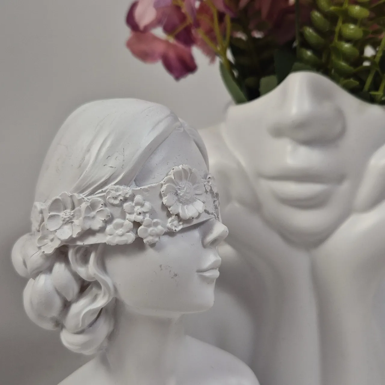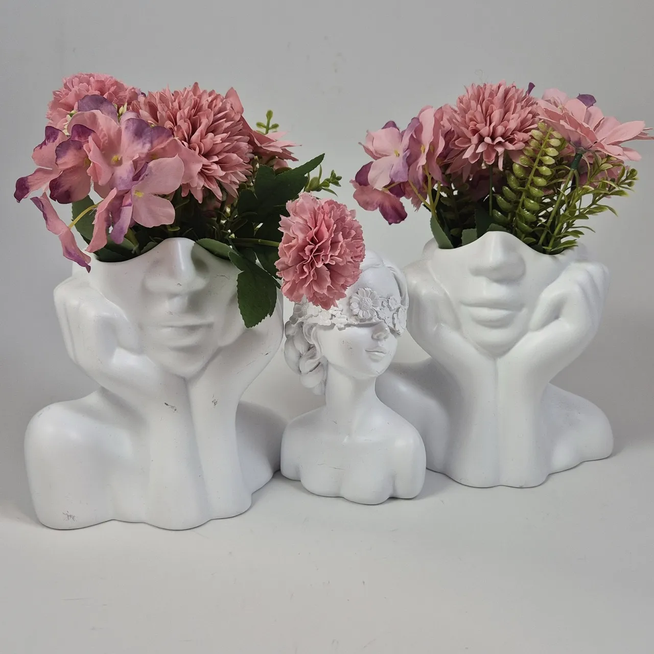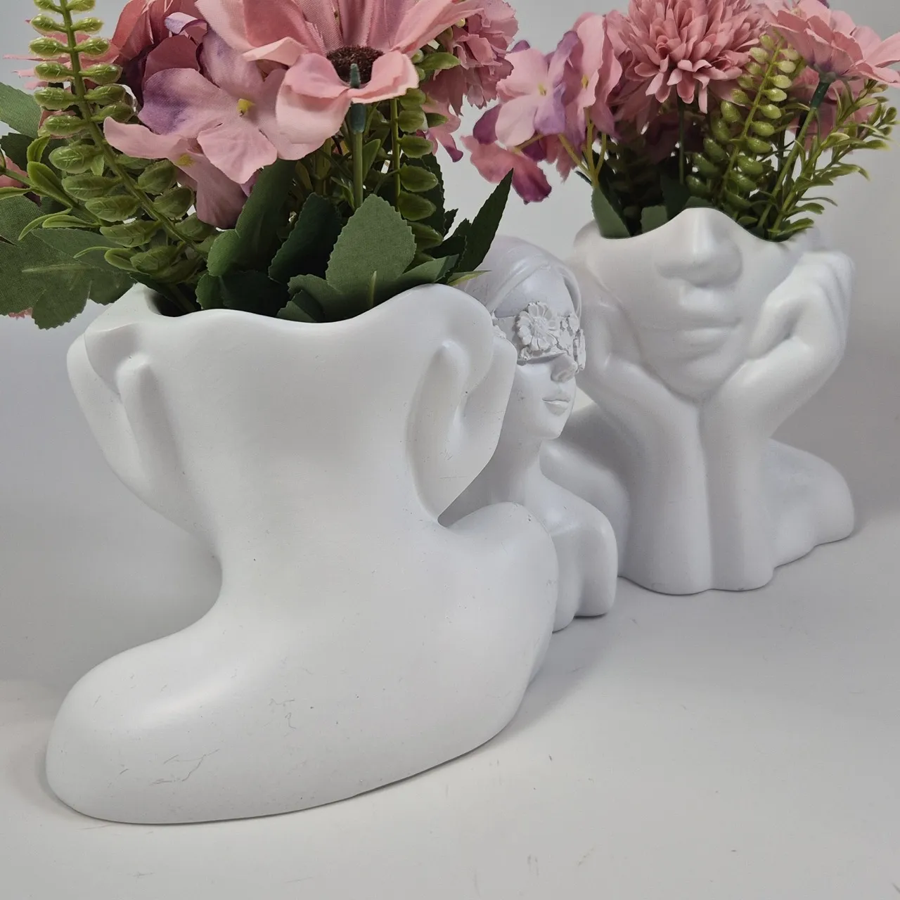 2st "ansikts"vaser H.13.5cm och 1 dekoration. Konstgjorda växter