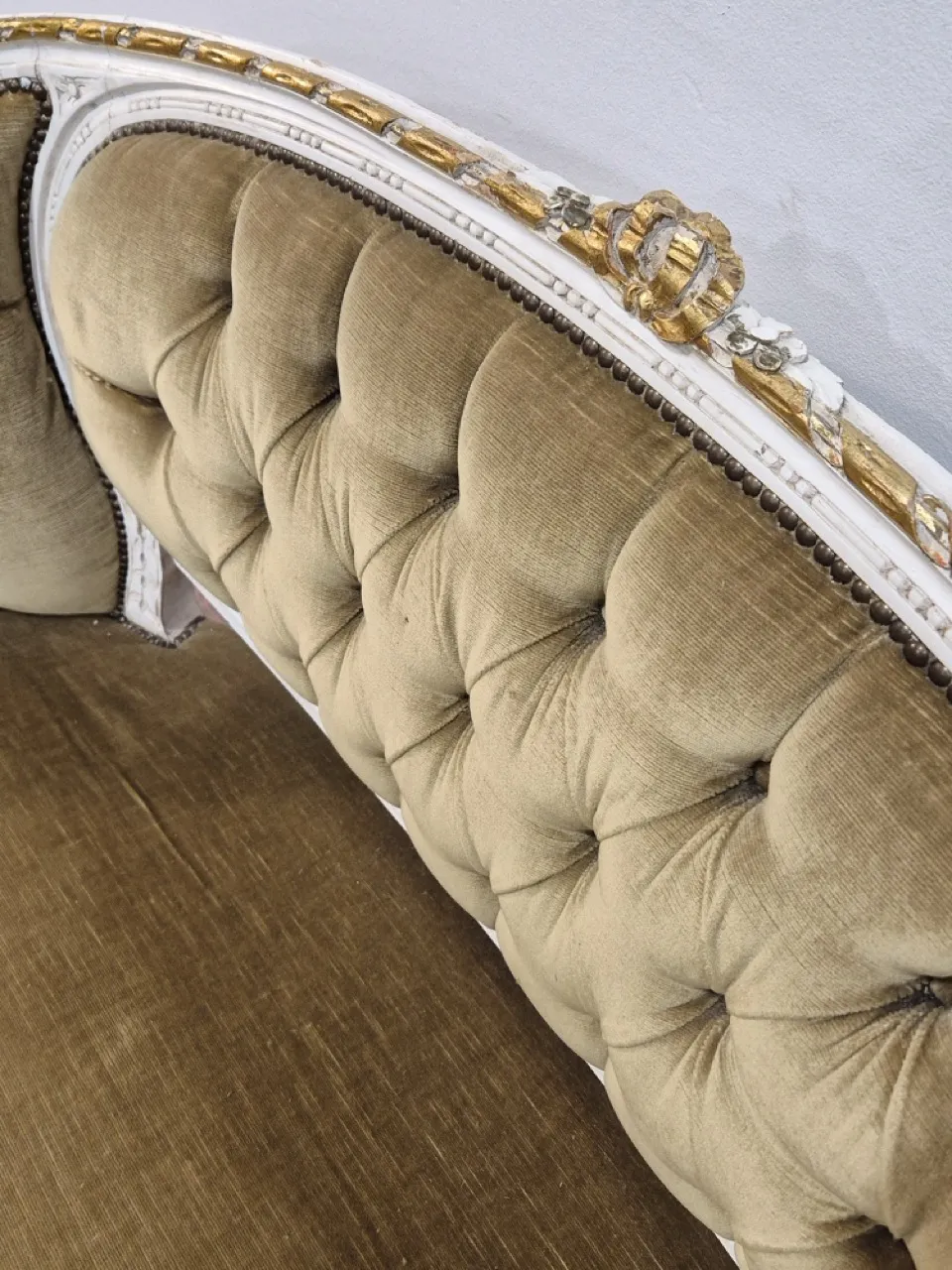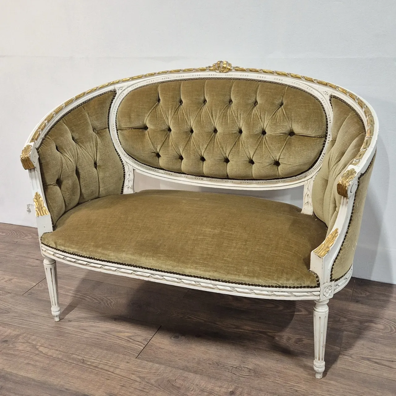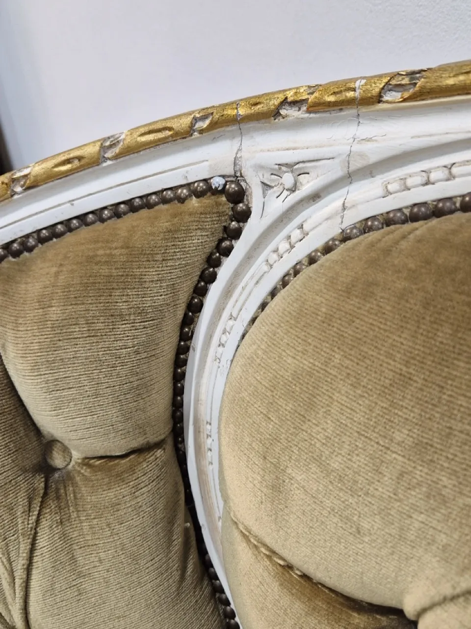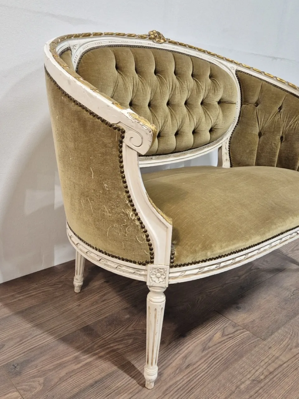 Anik liten soffa. Klöst på sidorna. Skev stoppning . Flagor/skavd färg . L. 118cm