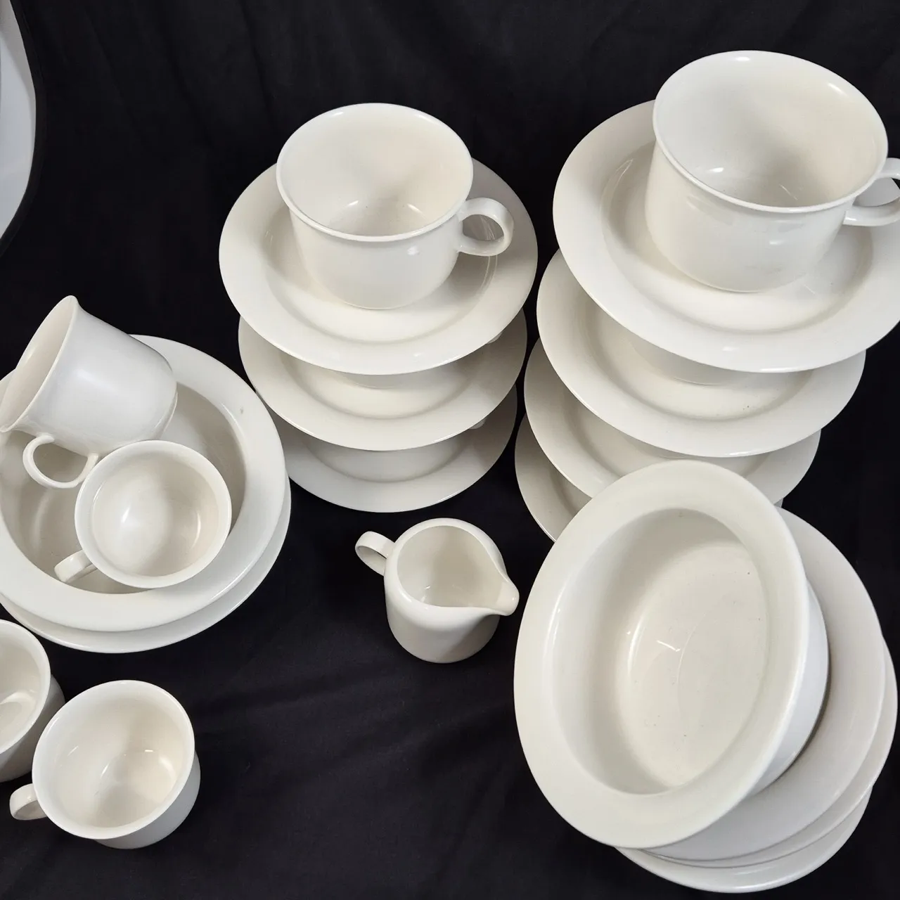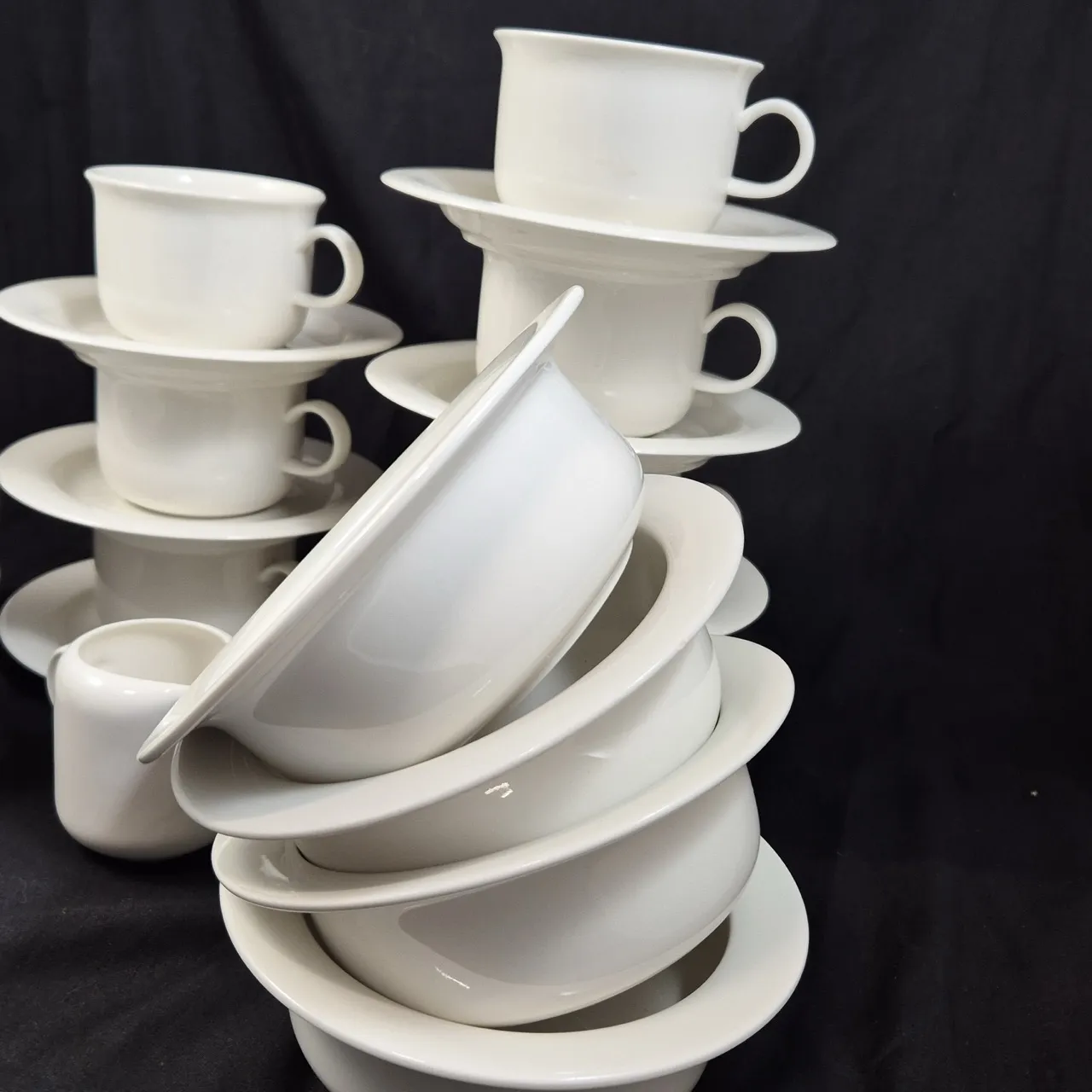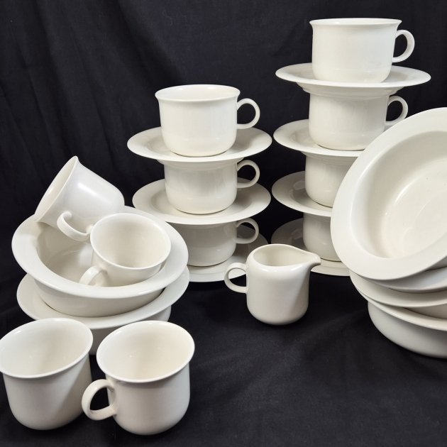 6st skålar, 7st tekoppar med fat, 1st gräddkanna, 4st kaffekoppar utan fat