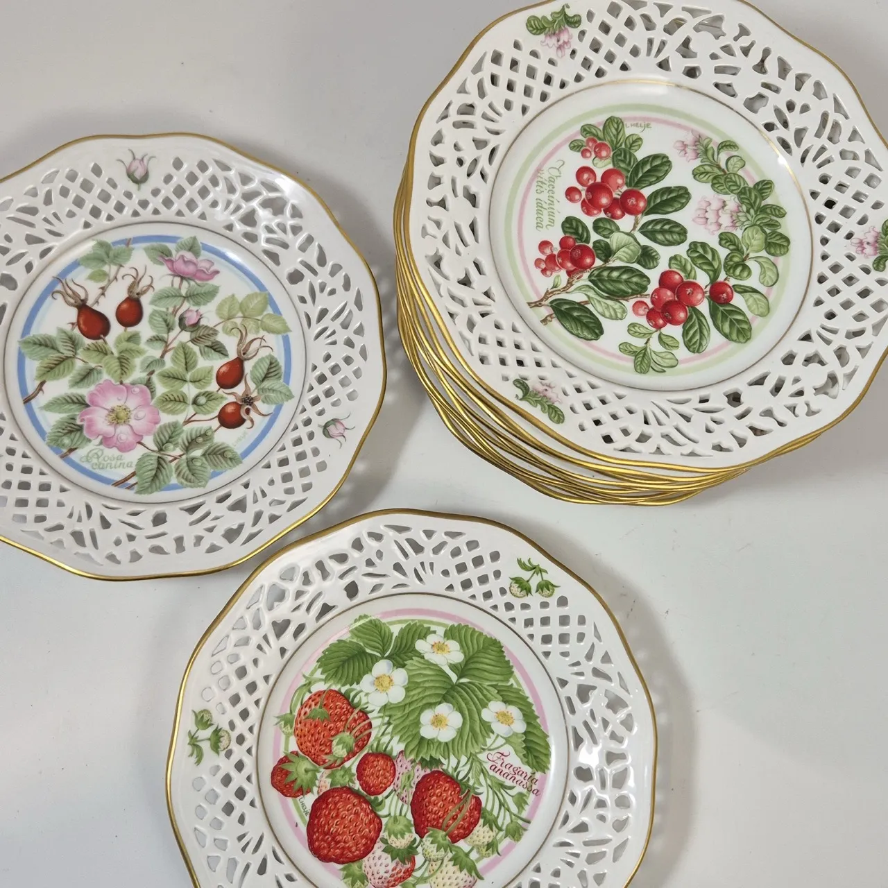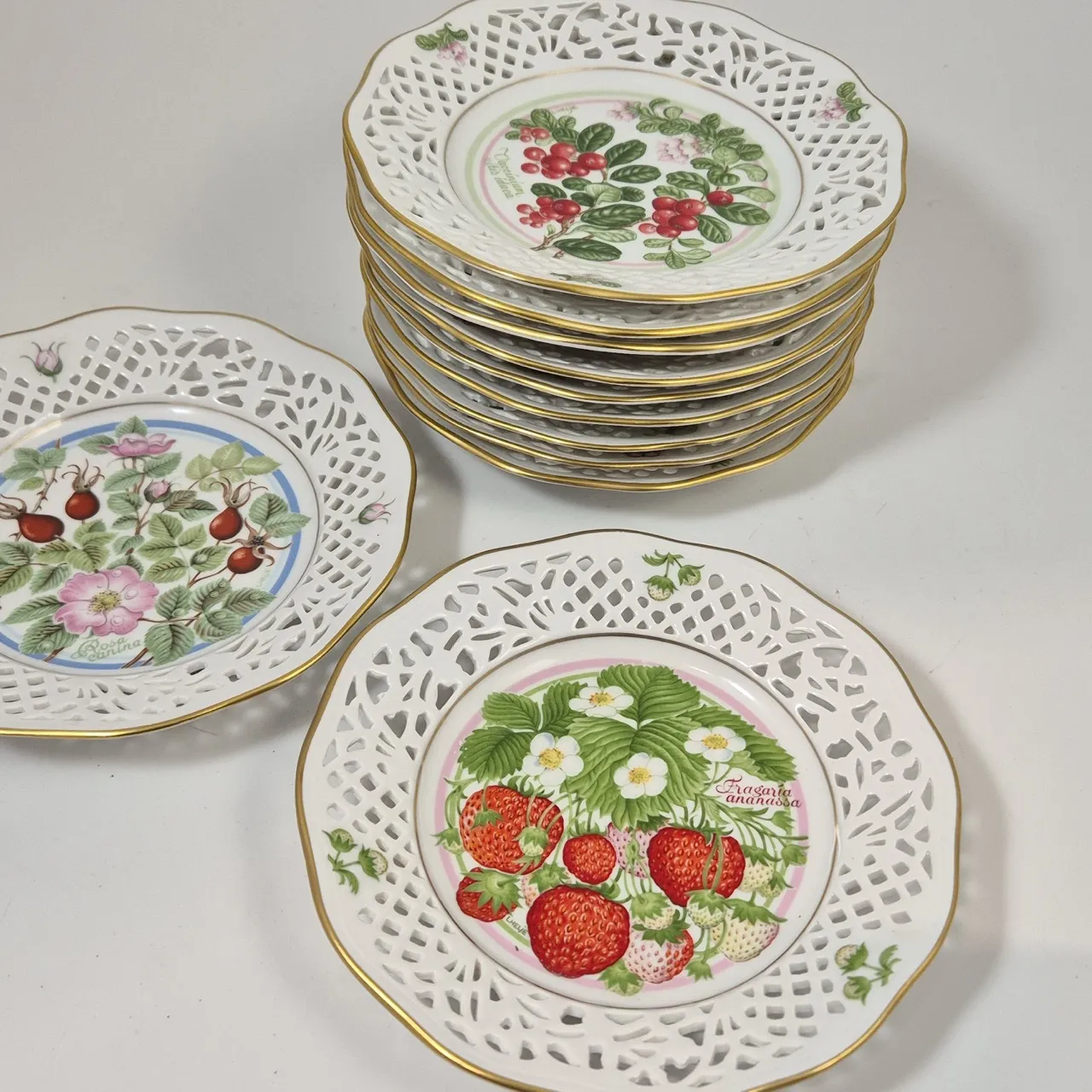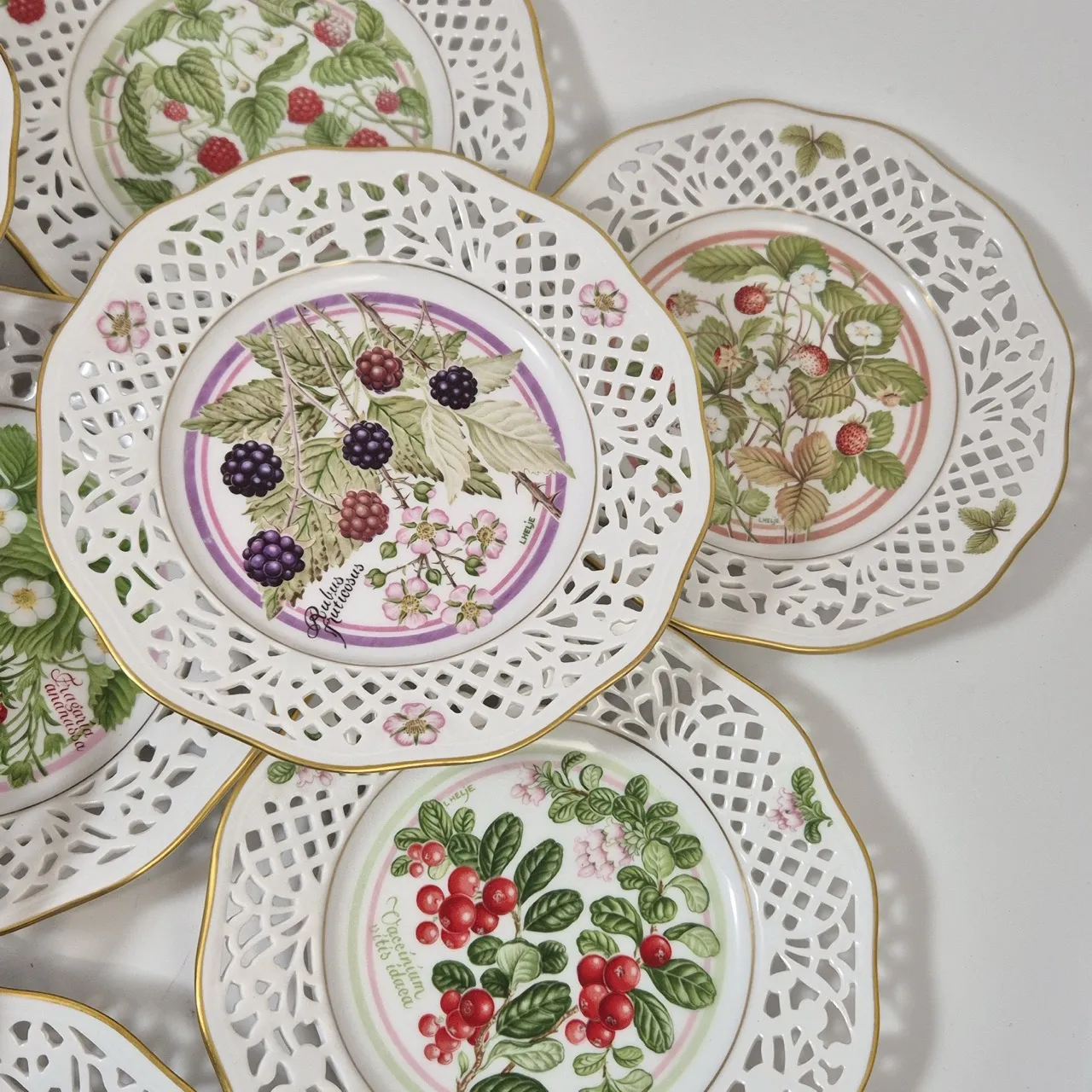 Assietter med gallerkant och bärmotiv 11st olika. D.19cm