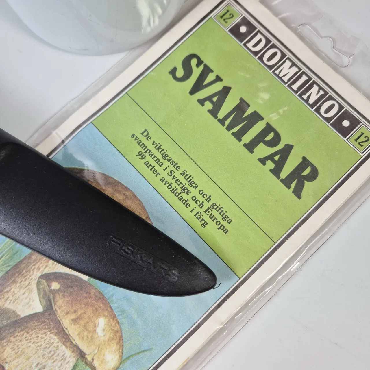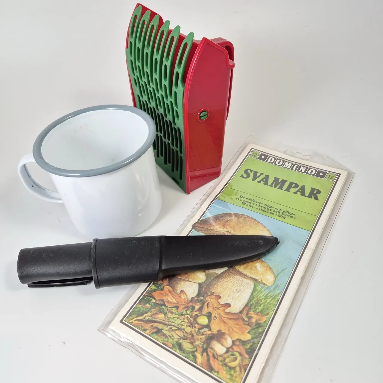 Emaljerad mugg, bärplockare, kniv från fiskars, svampinformation