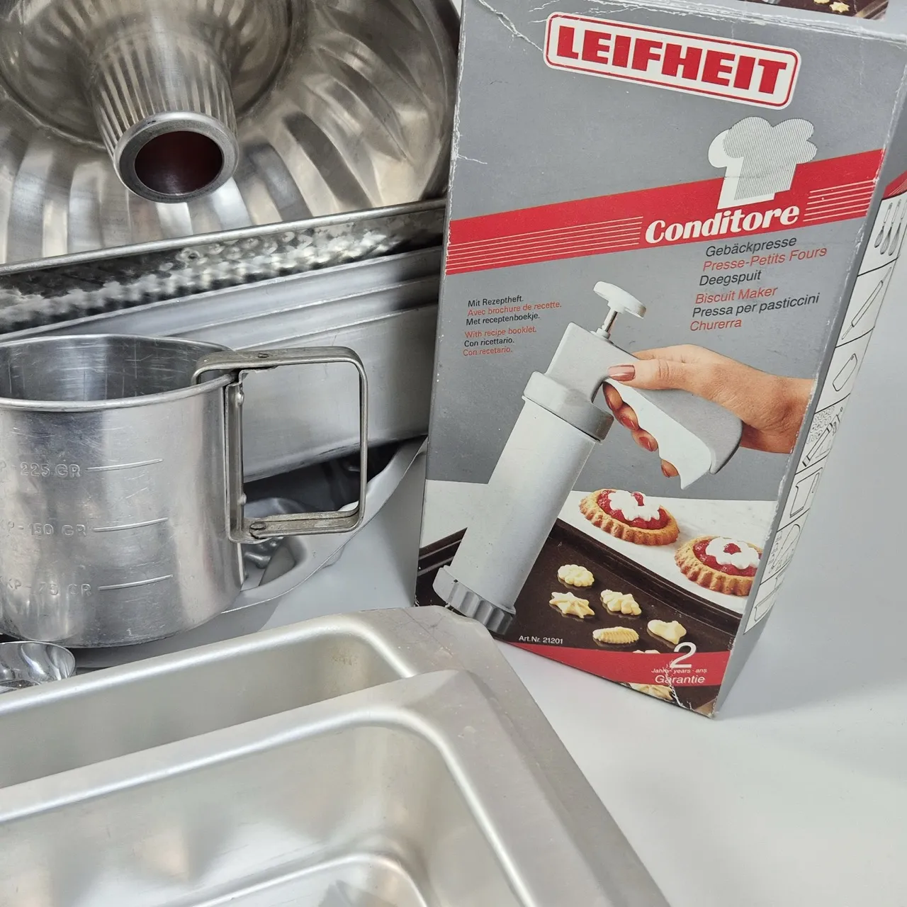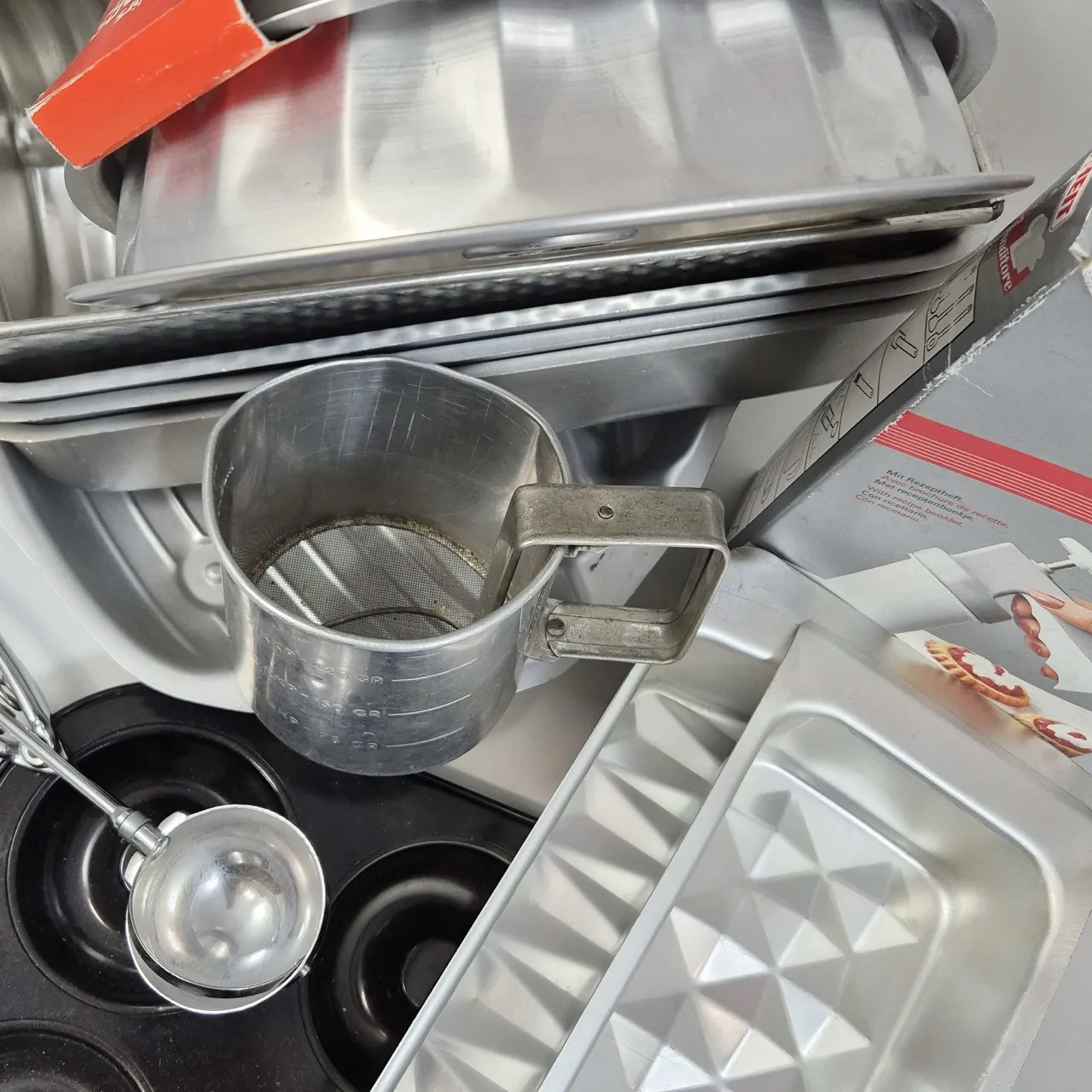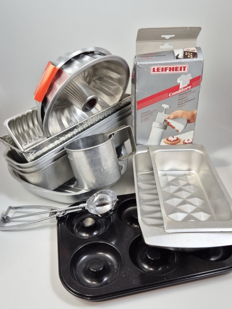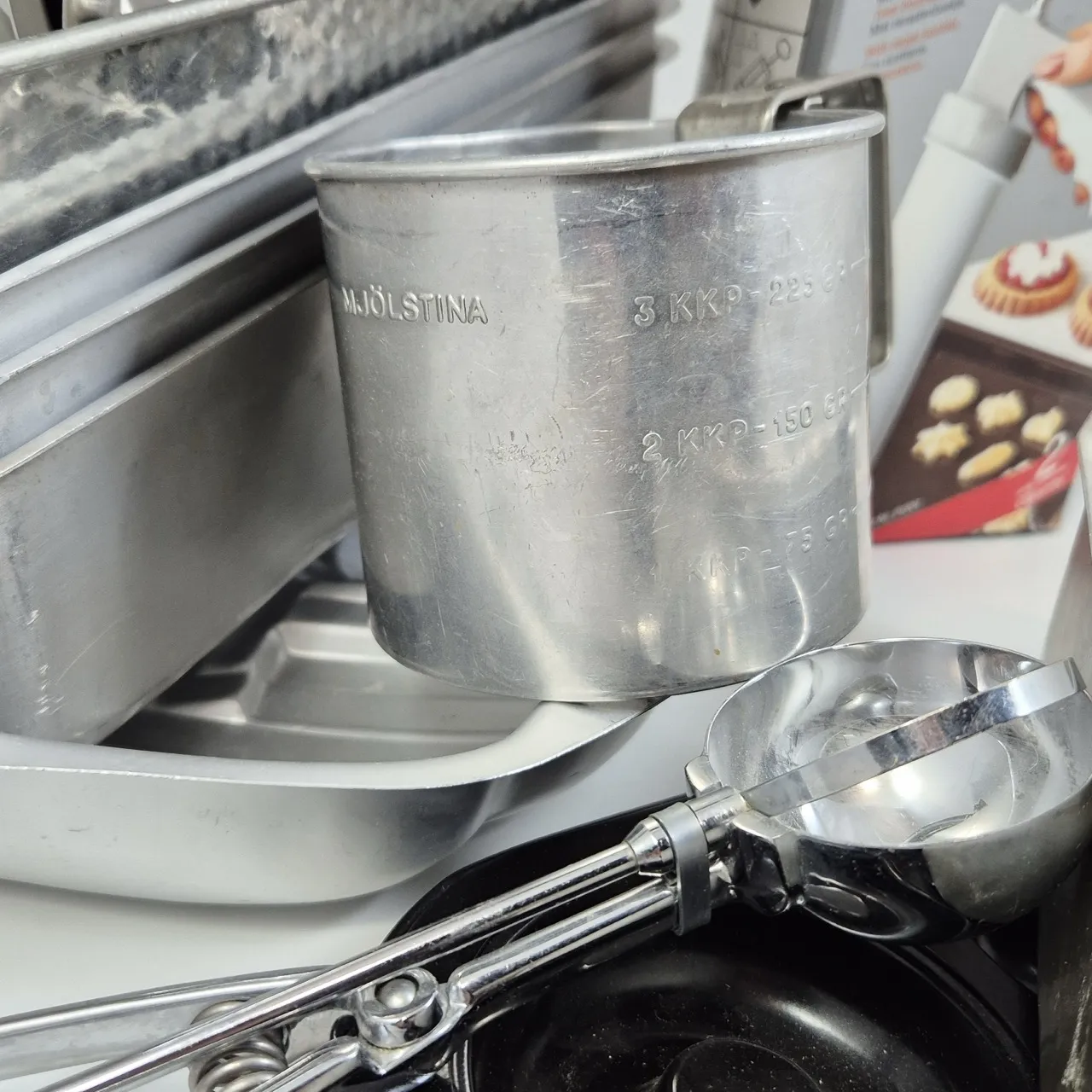 Ett helt gäng olika bakformar, siktare mjöl-stina, degcupa, kaksprits