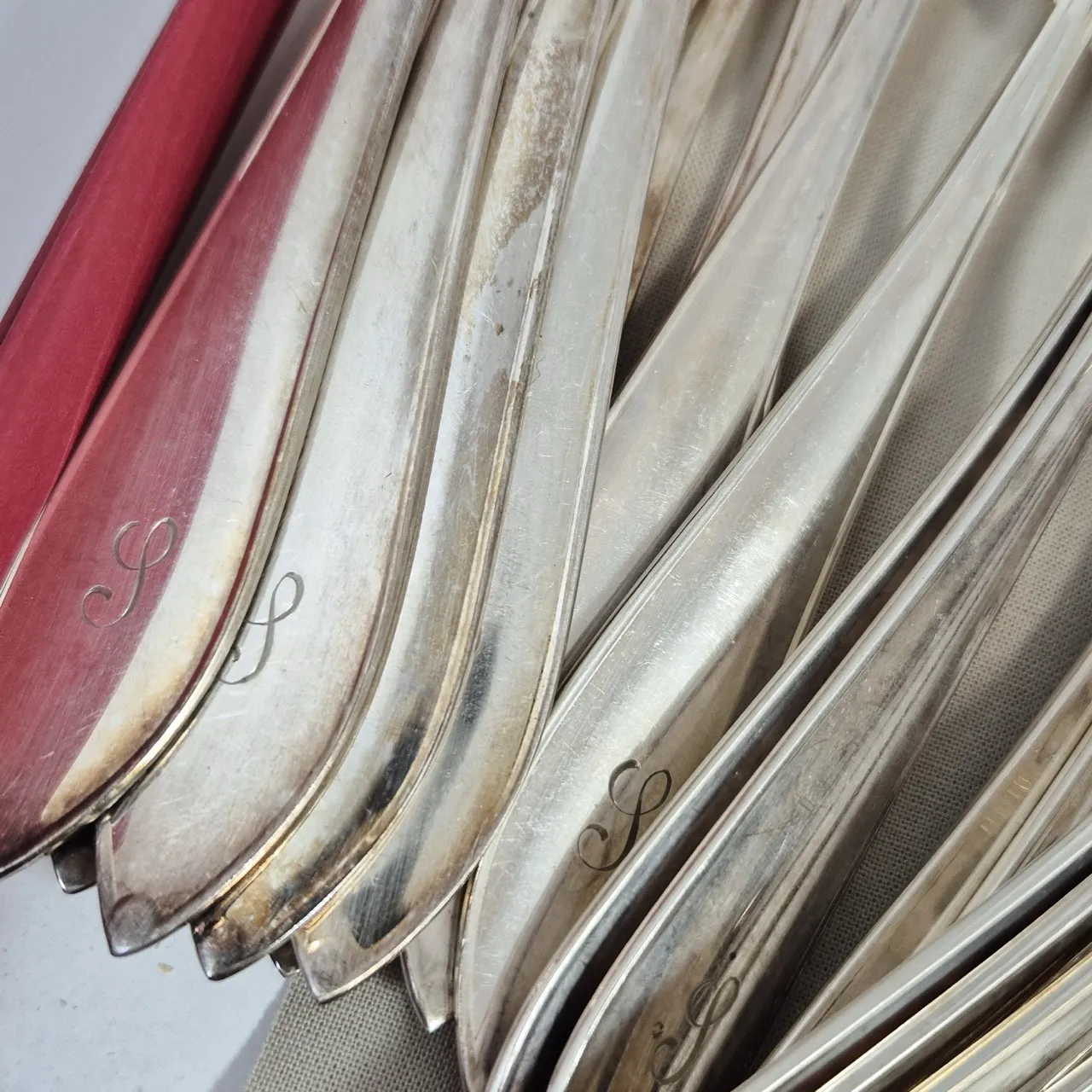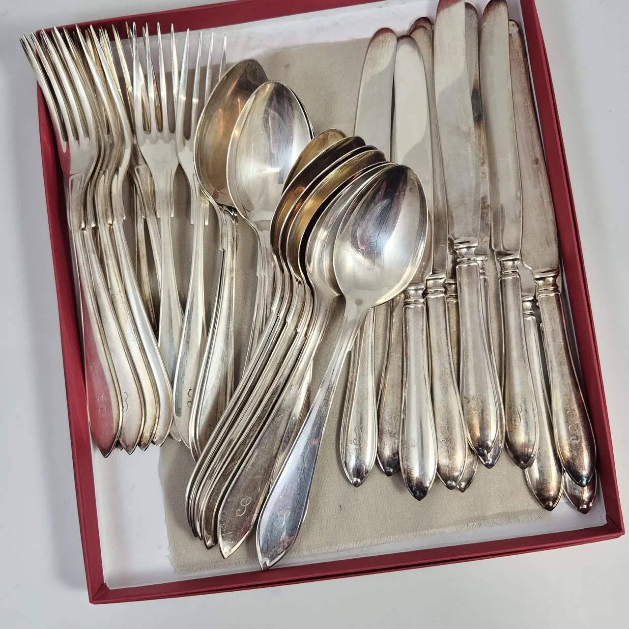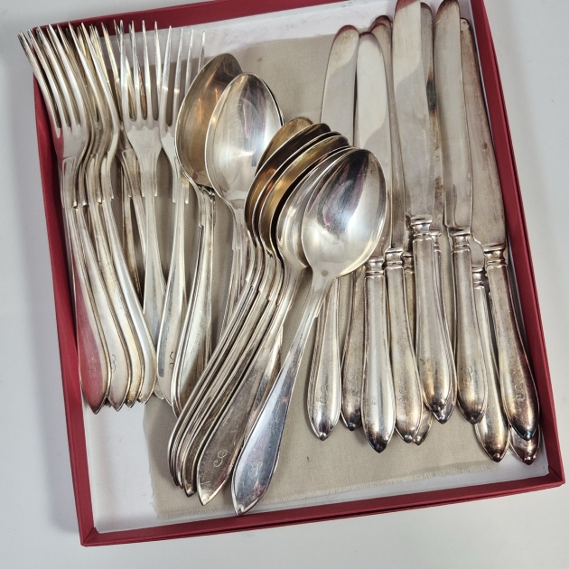Bestick med graverat I . Knivar 12st, Gafflar 12st, Matskedar 12st.