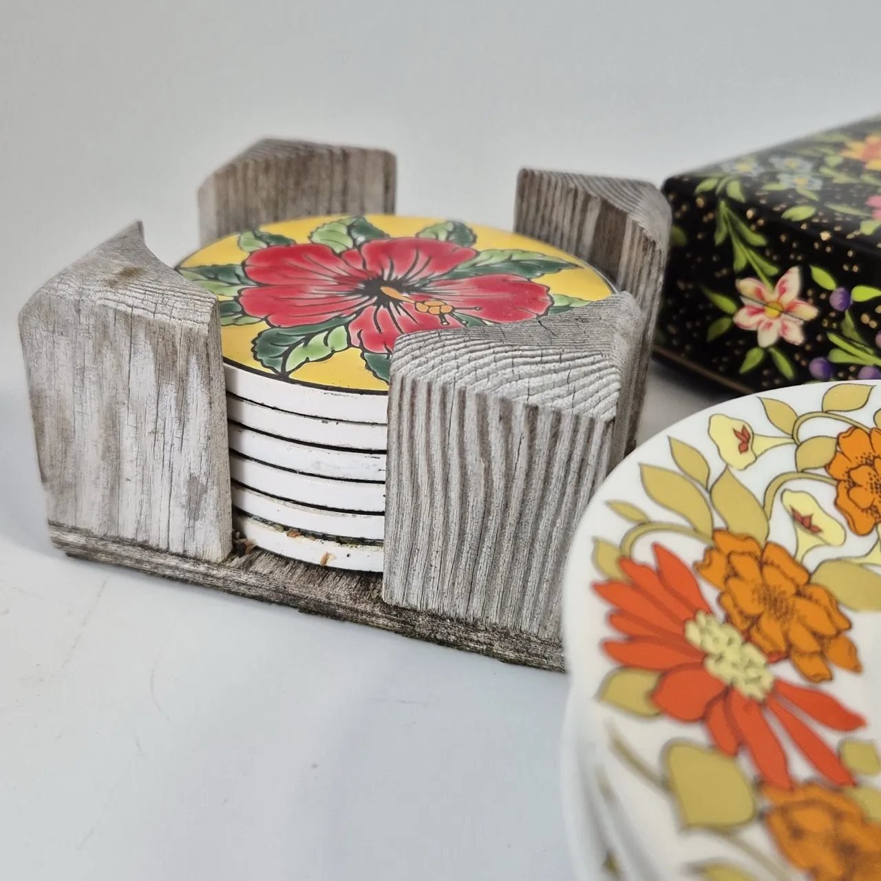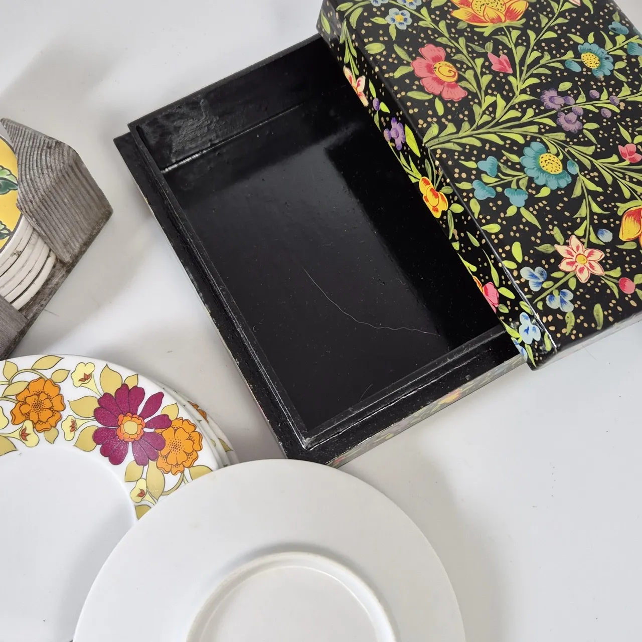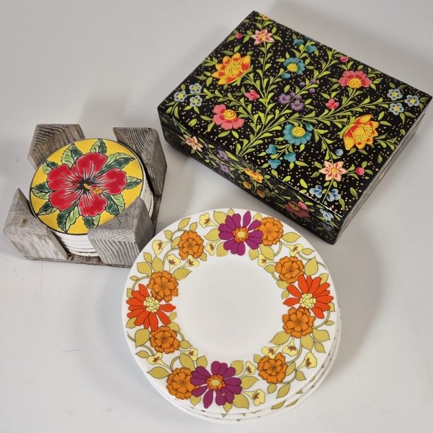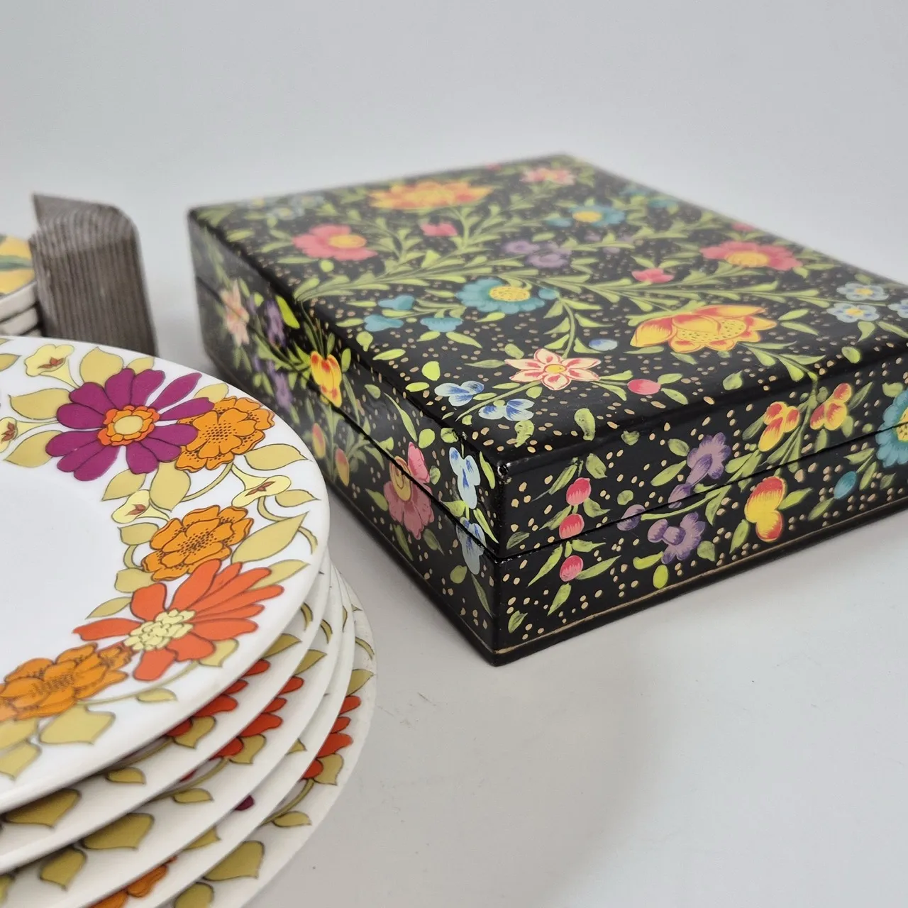 Små assietter/kakfat 5st , coasters, låda