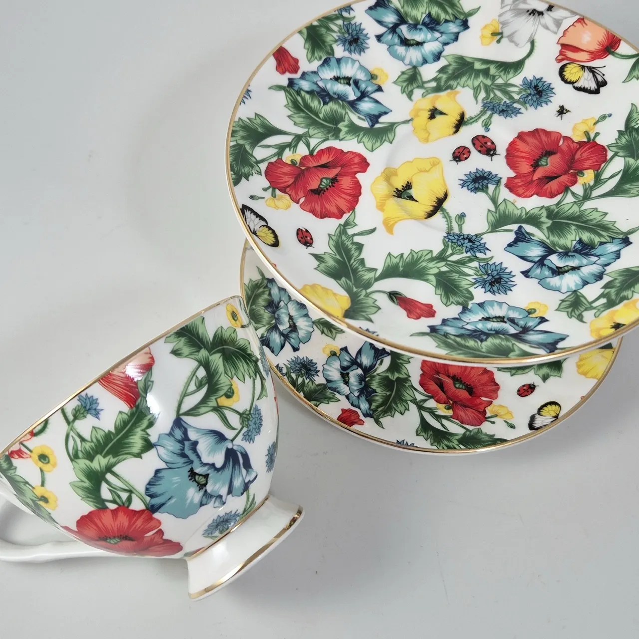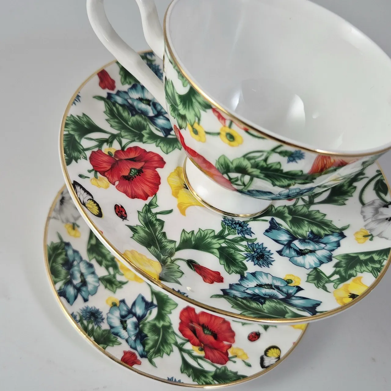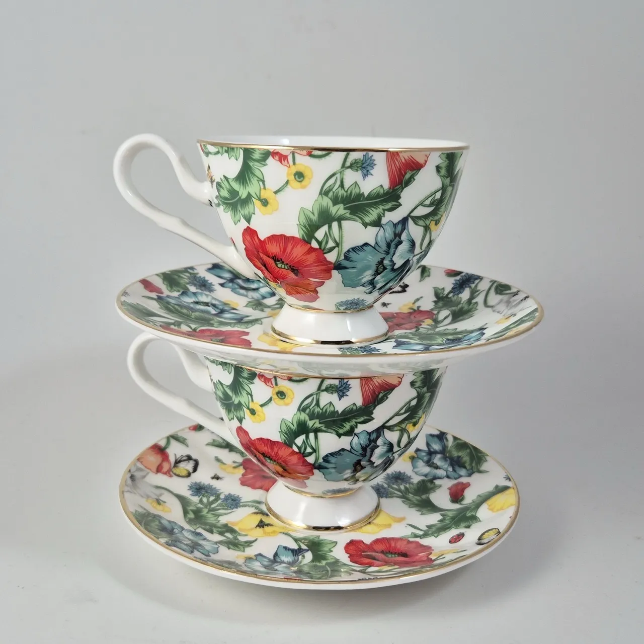 2st tjusiga blomsterkoppar med fat. D.9.5cm
