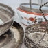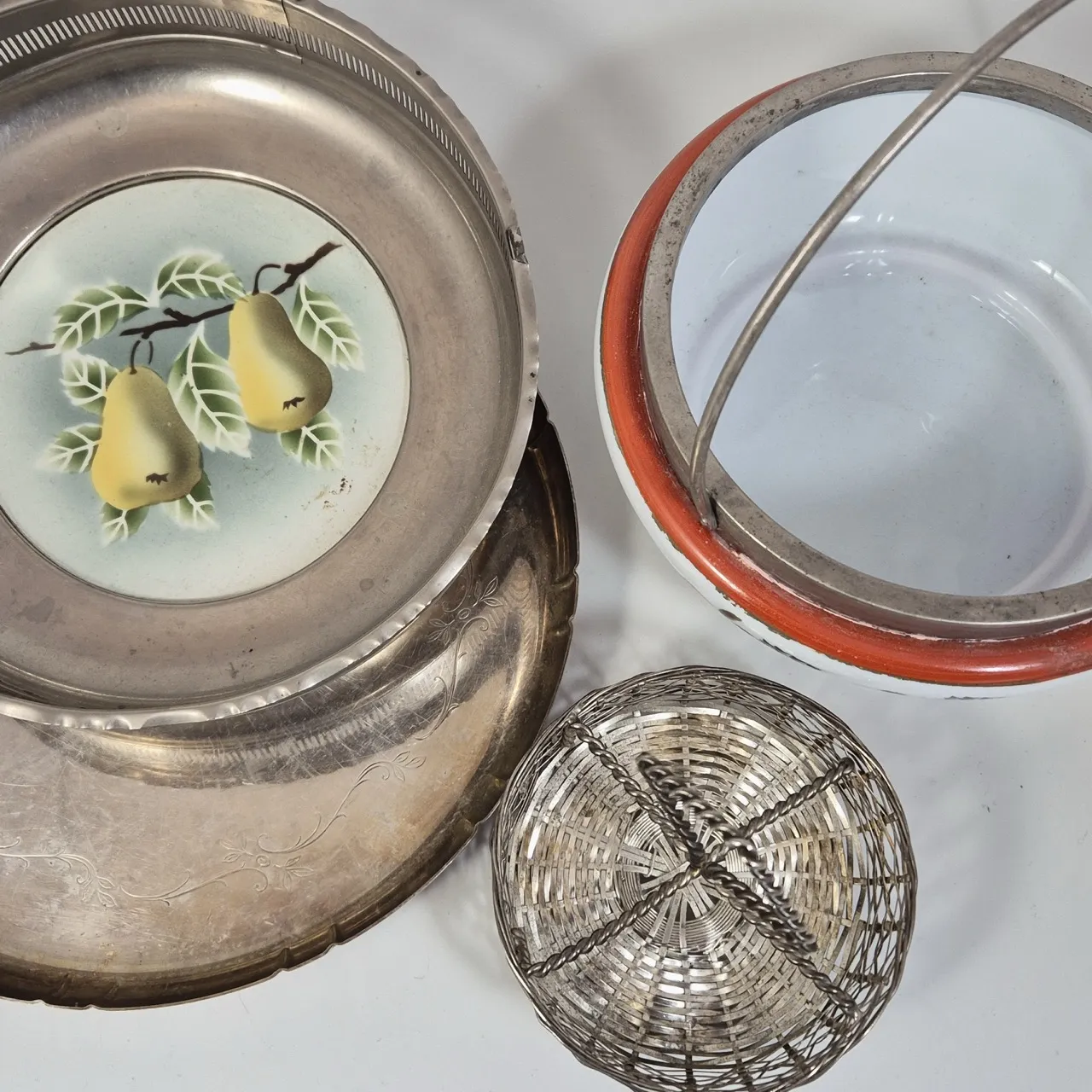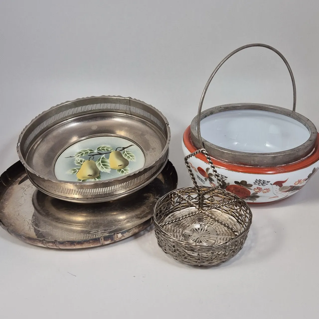 Fruktskål med pärondekor i botten, skål med handtag, bricka D.27cm