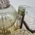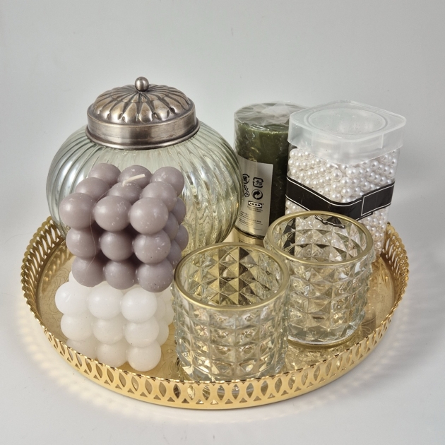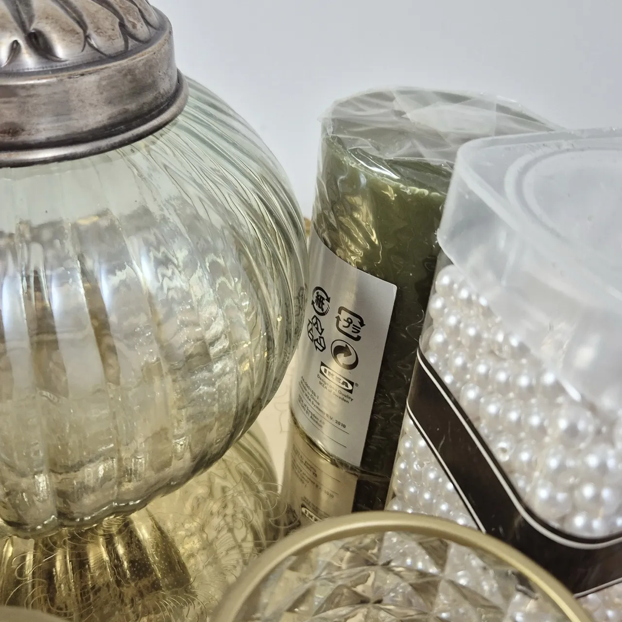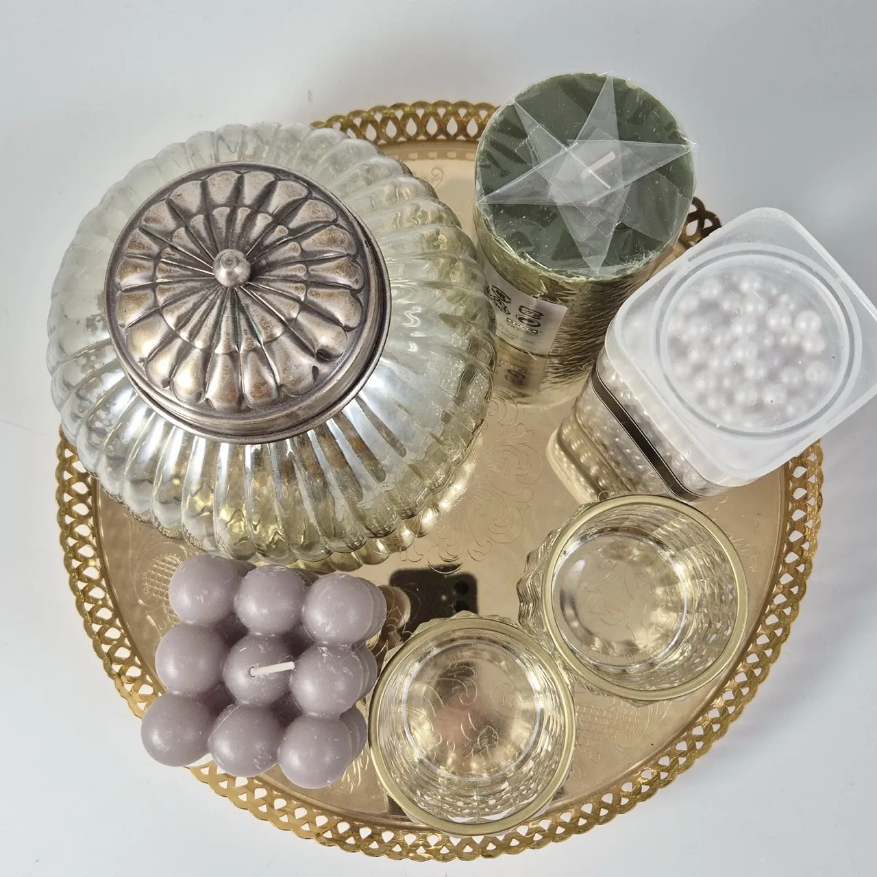 Guldig bricka , burk med metallock, 2st ljuslyktor, pärlor, 3st ljus