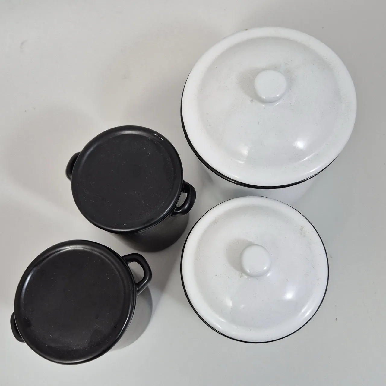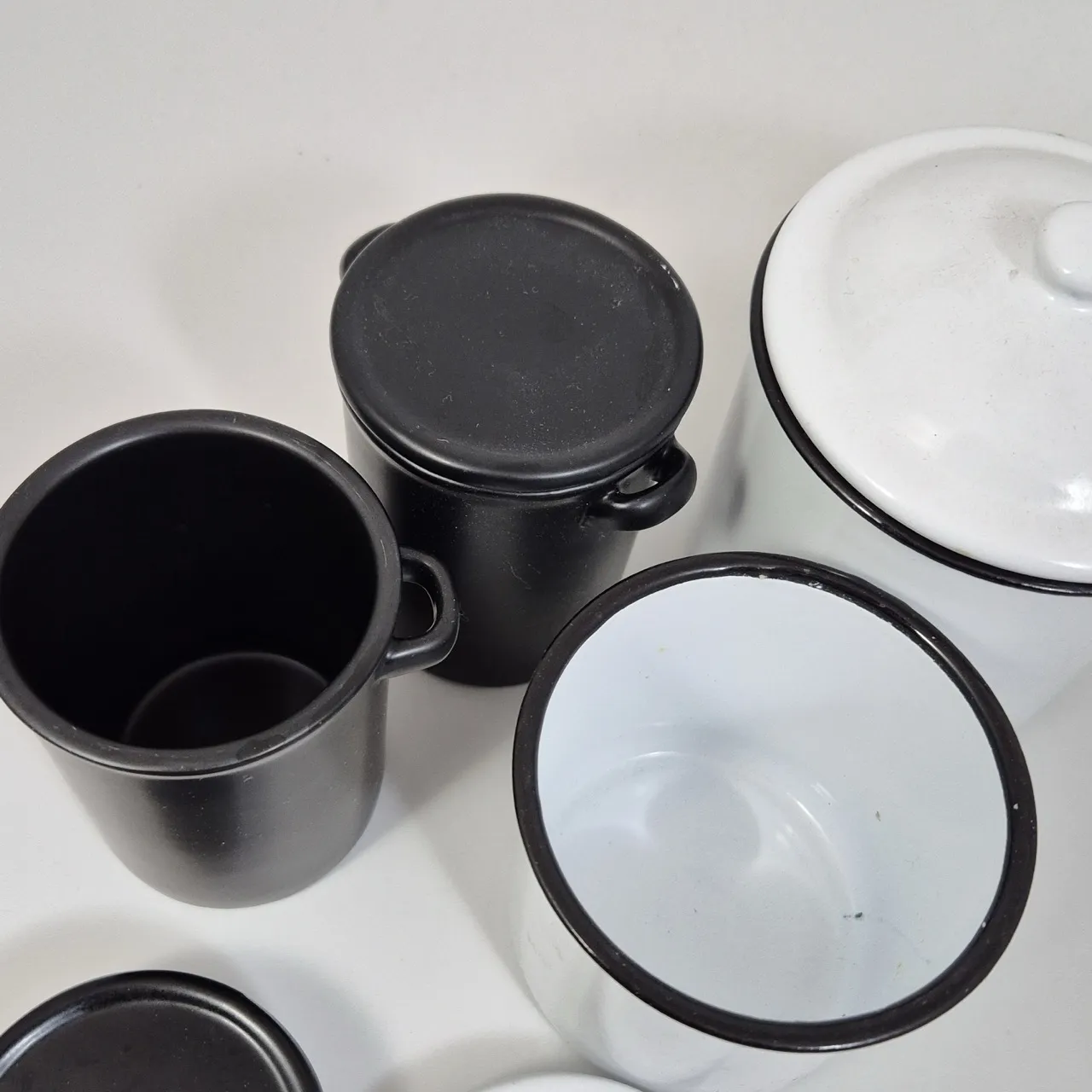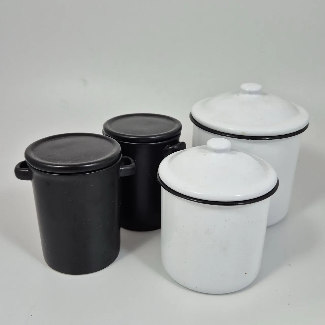 2st metallburkar, 2st porslinsburkar i svart H.9.5cm