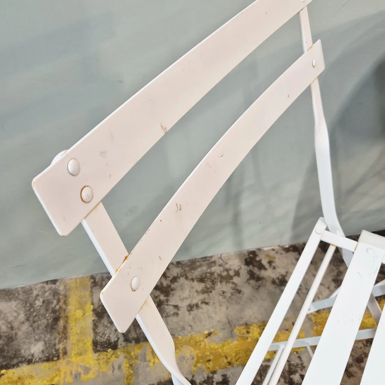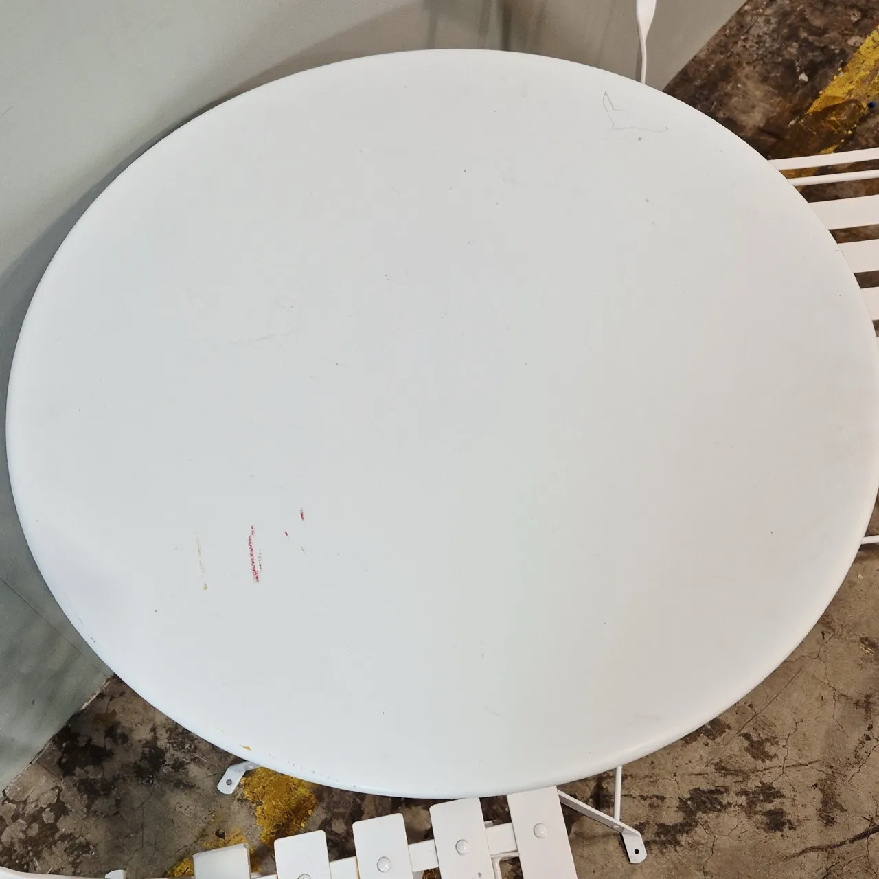 Rostfläckar finns i skarvar, plastplupparna under stolarna saknas . Rött skrapmärke på skivan, vi har ej testat att ta bort det.