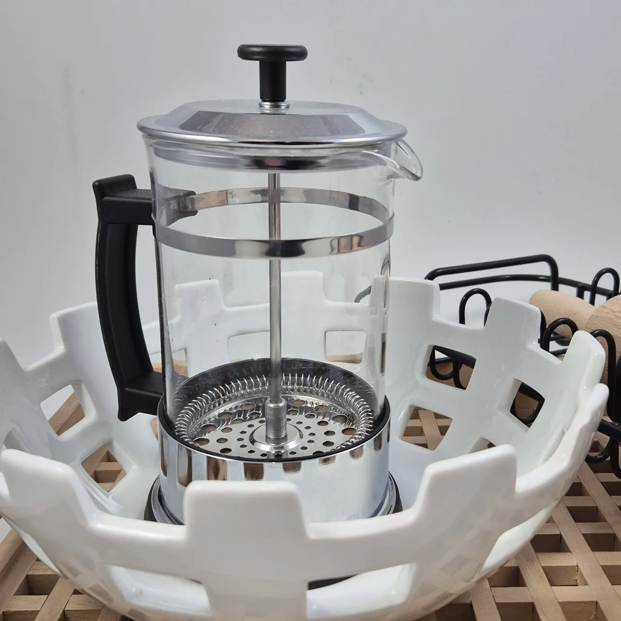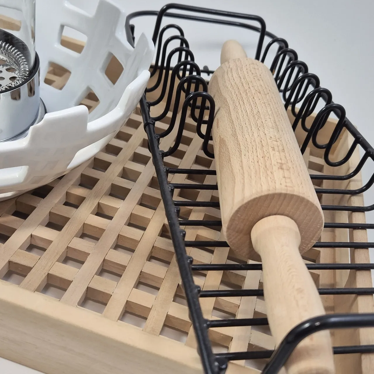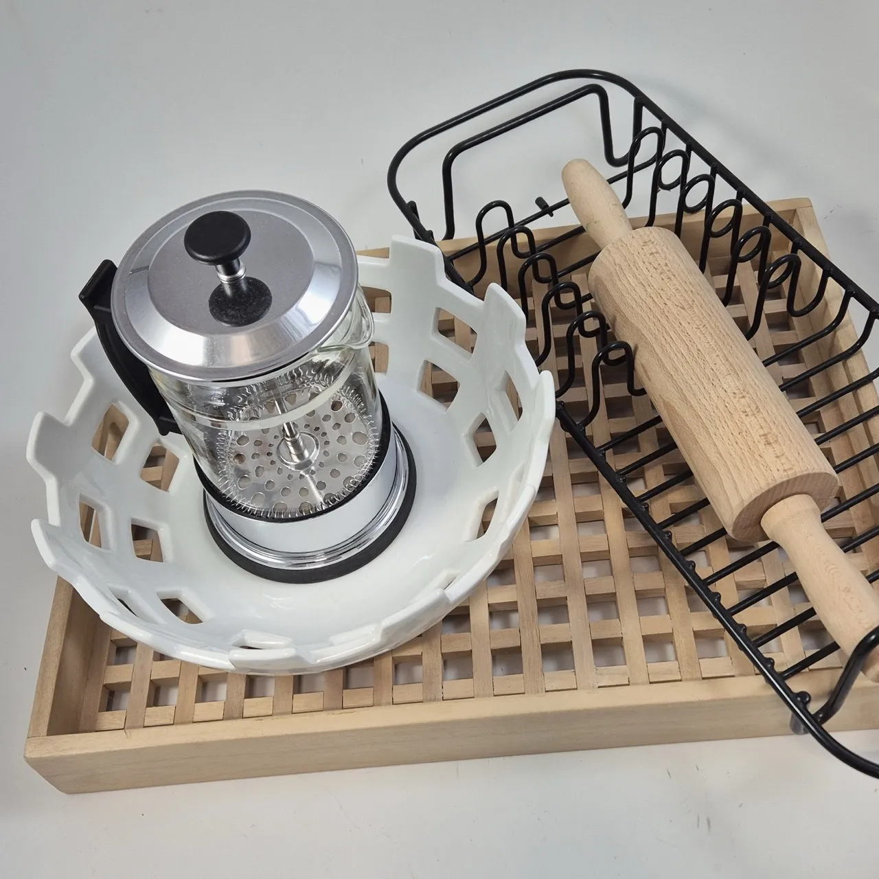 Stor presskanna, kavel, bricka i trä, Diskställ, fruktskål