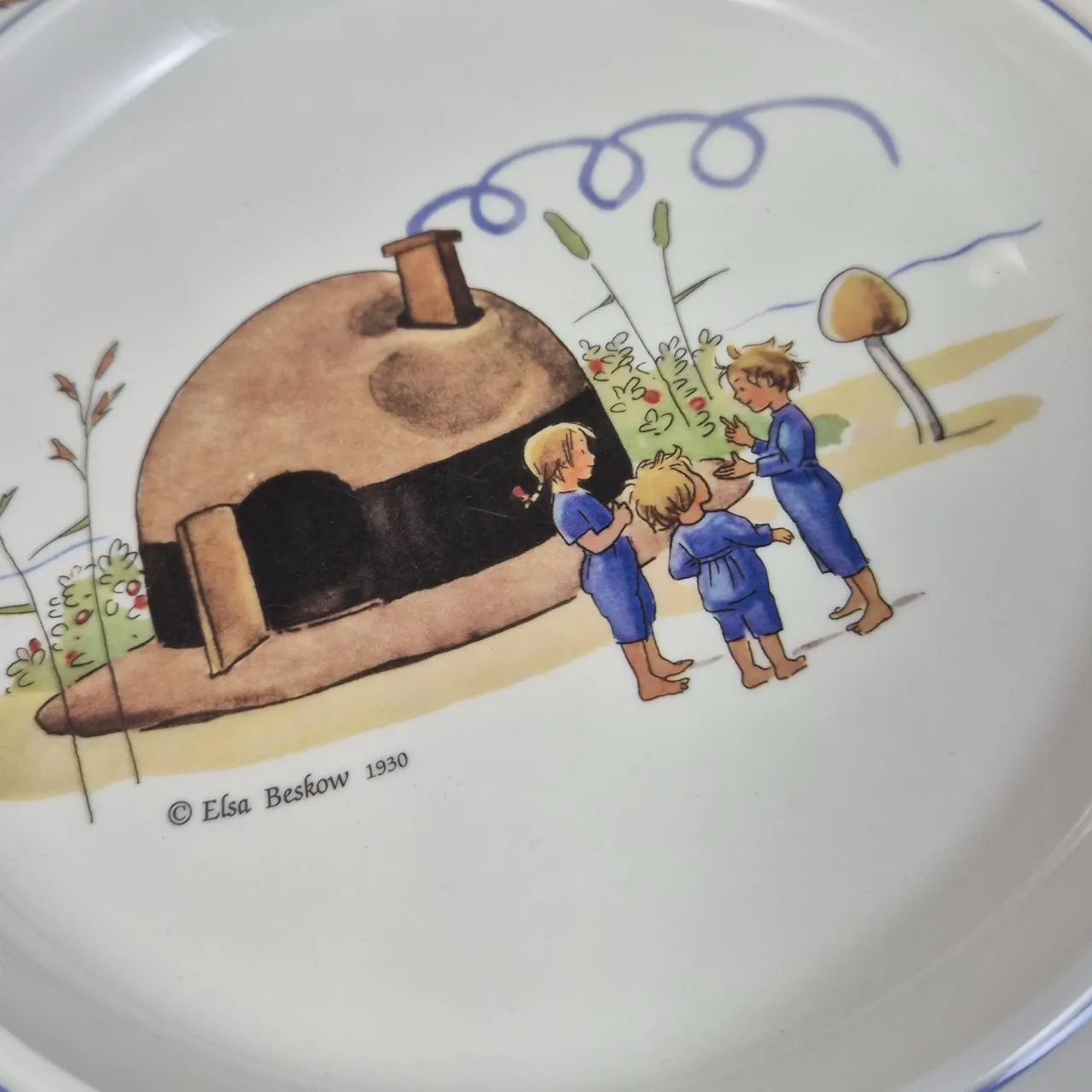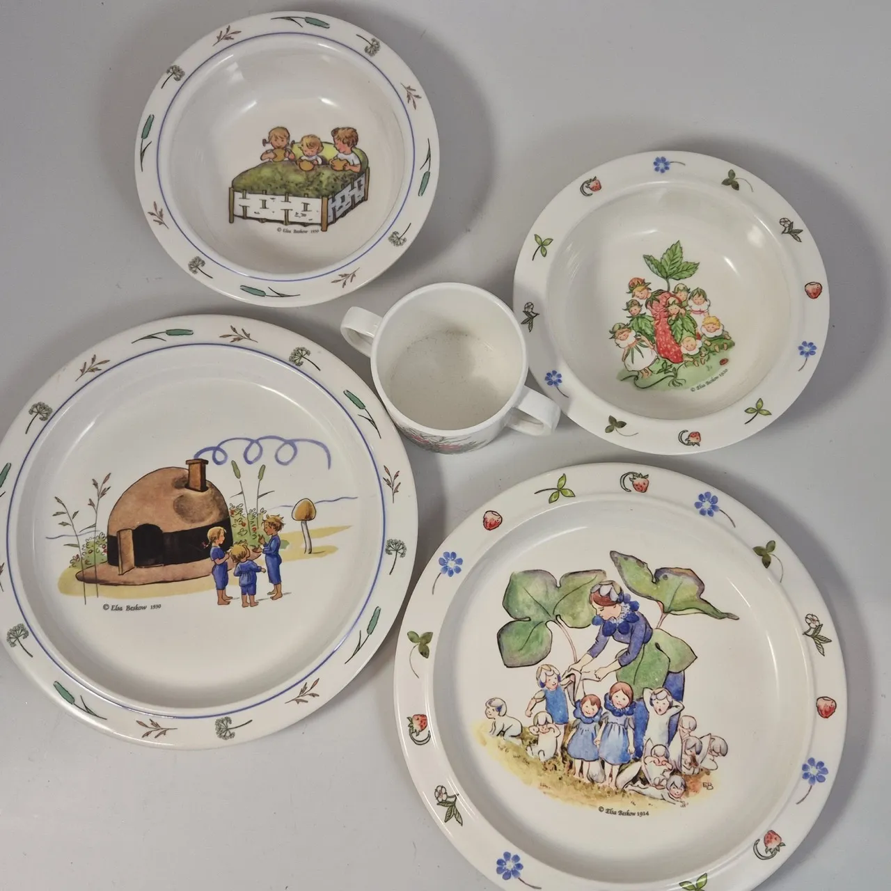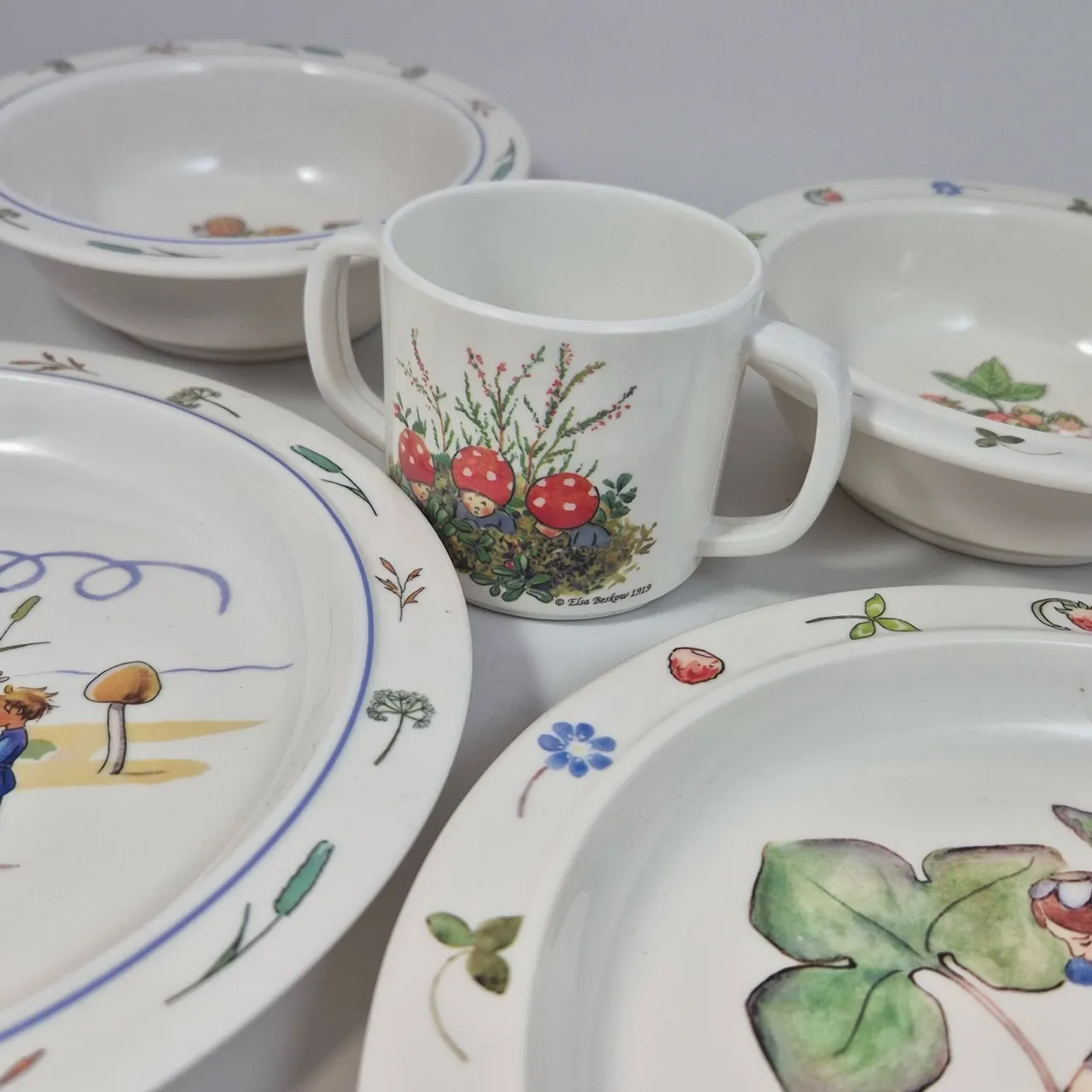 2st tallrikar, 2st skålar, 1st mugg i melamin. Elsa Beskow motiv