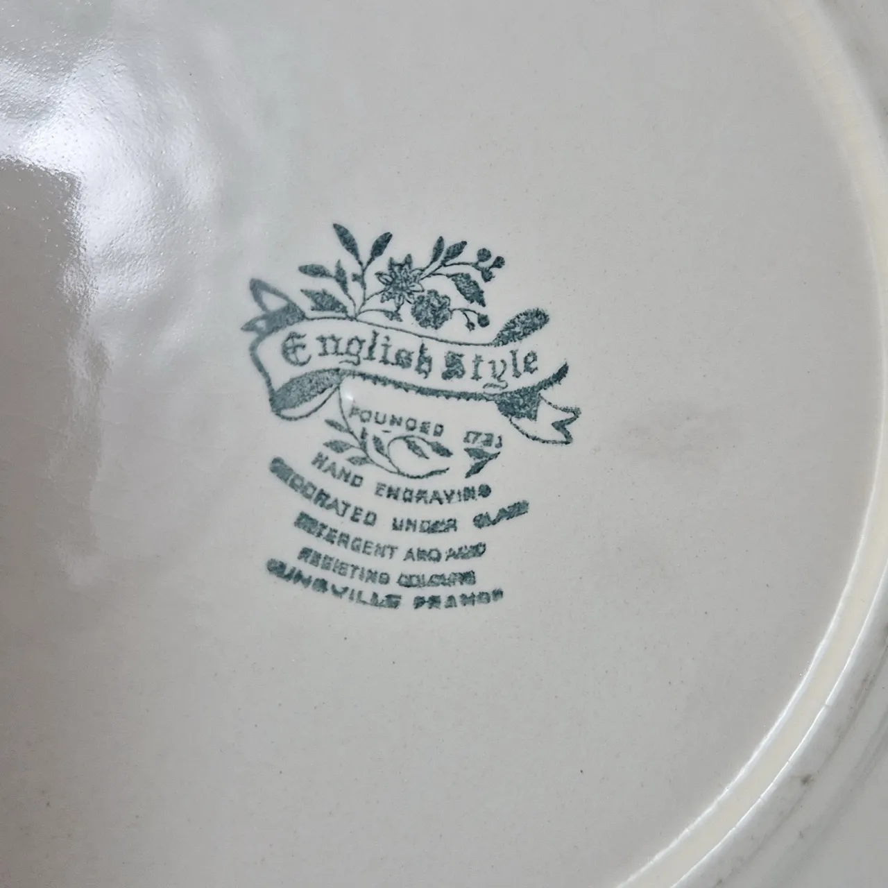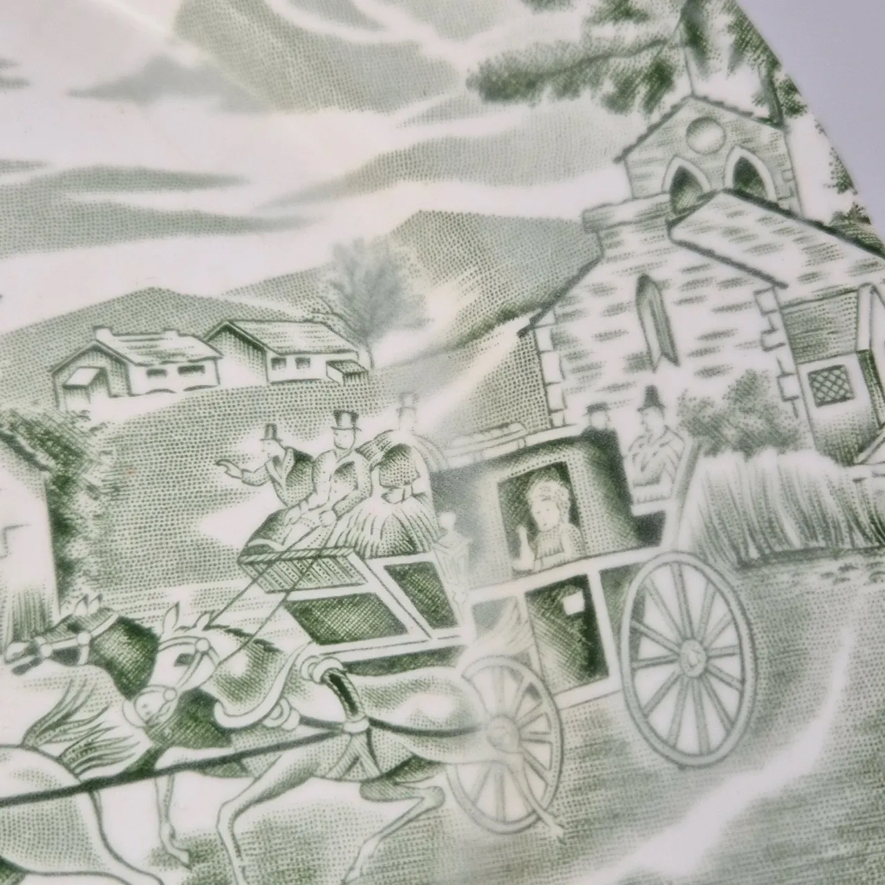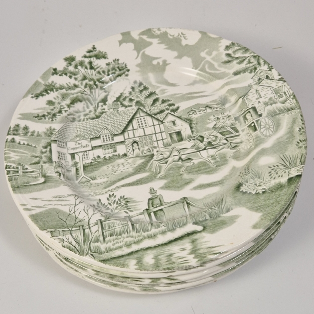 6st engelska tallrikar i grönt. 2 nagg på undersida annars fint bruksskick.