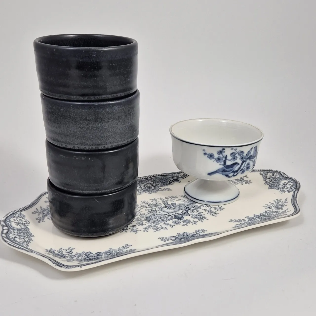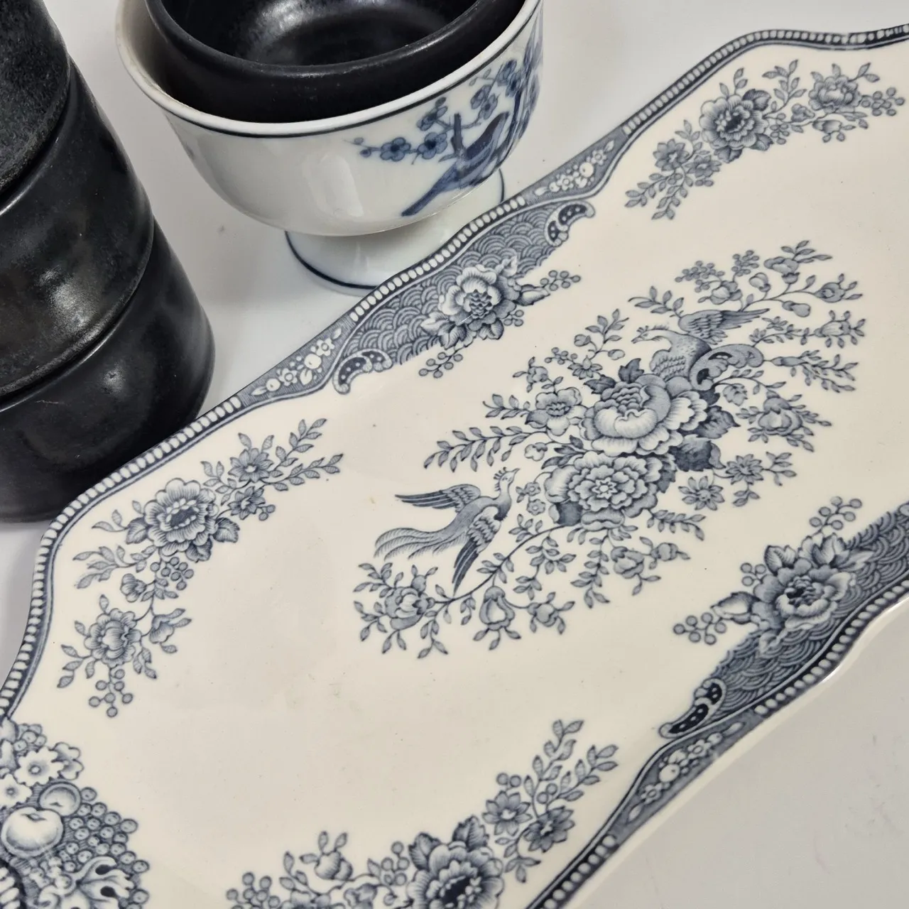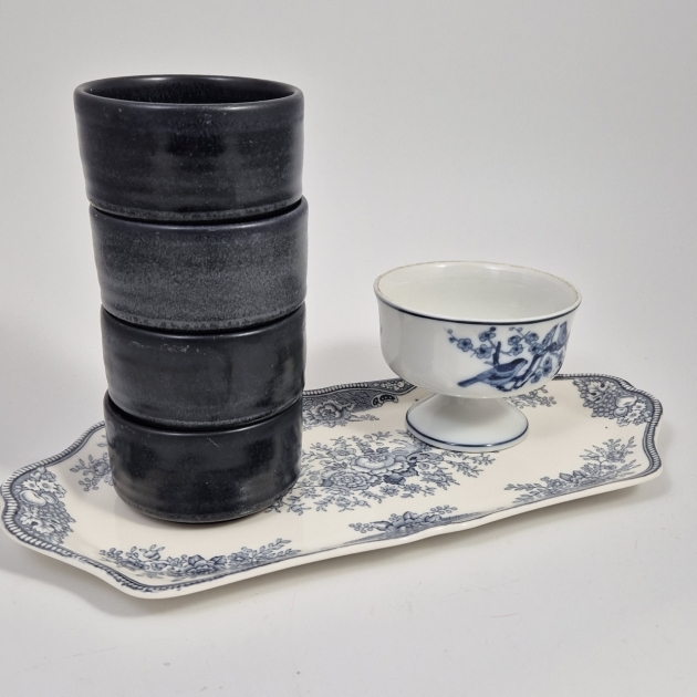 Engelskt fat 32x14cm  , 4st små skålar, 1st skål på fot