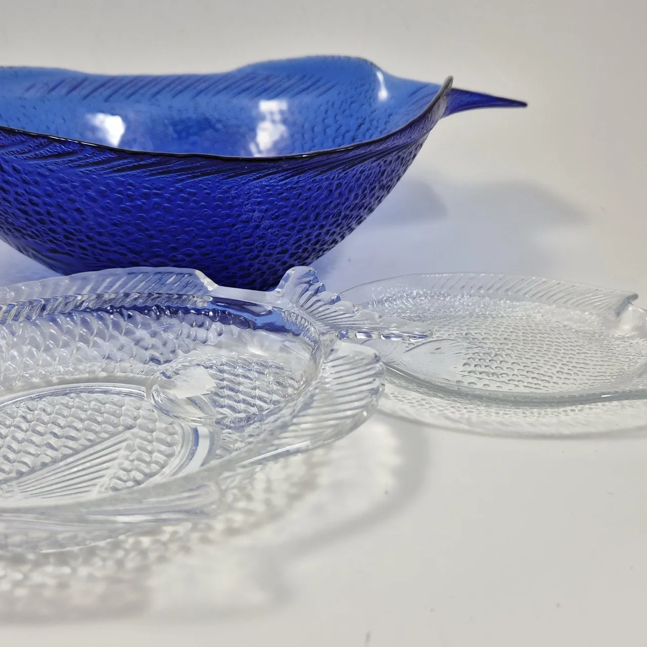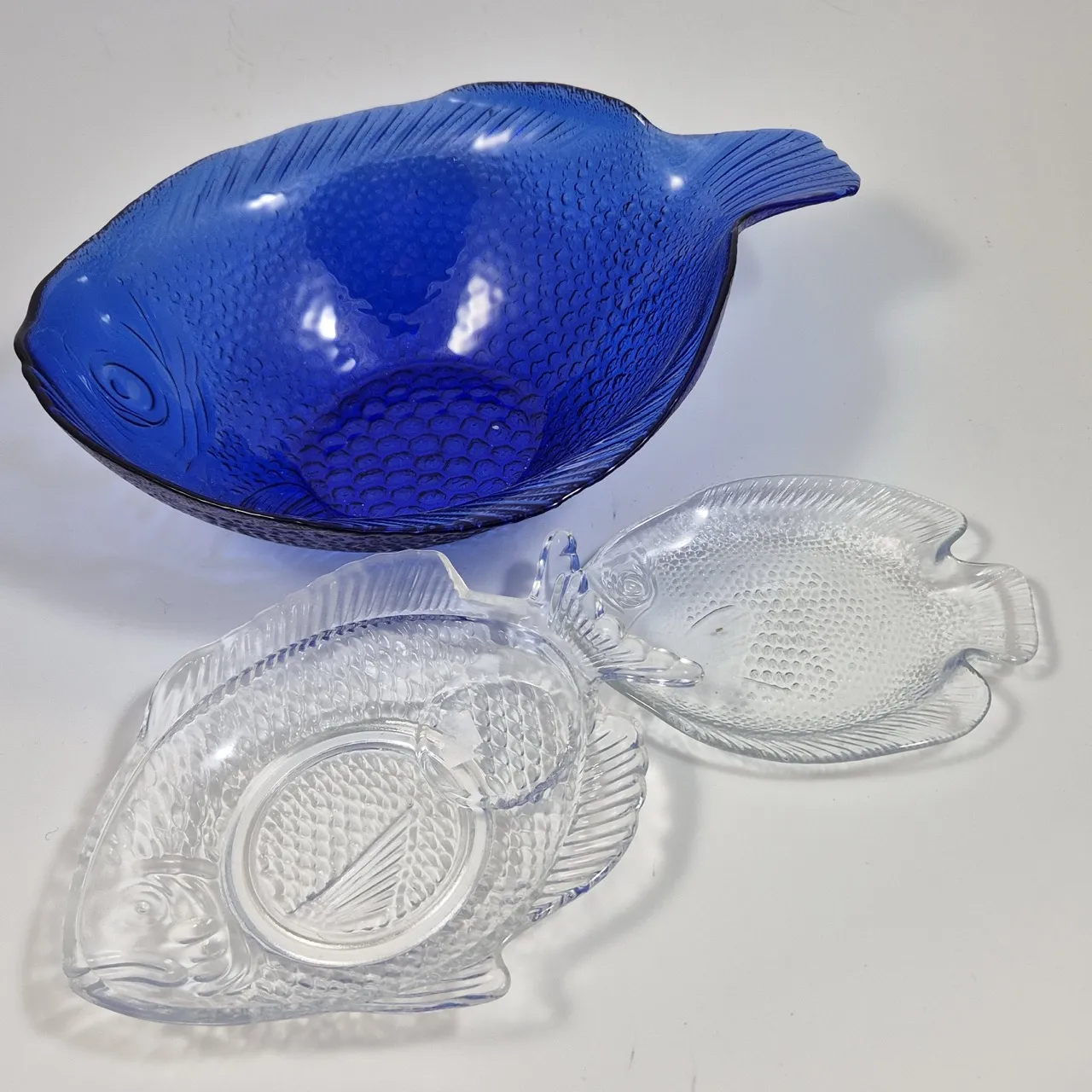 Stor fiskskål D ca 25cm , 2st mindre fiskfat ett nagg på nosen