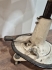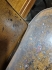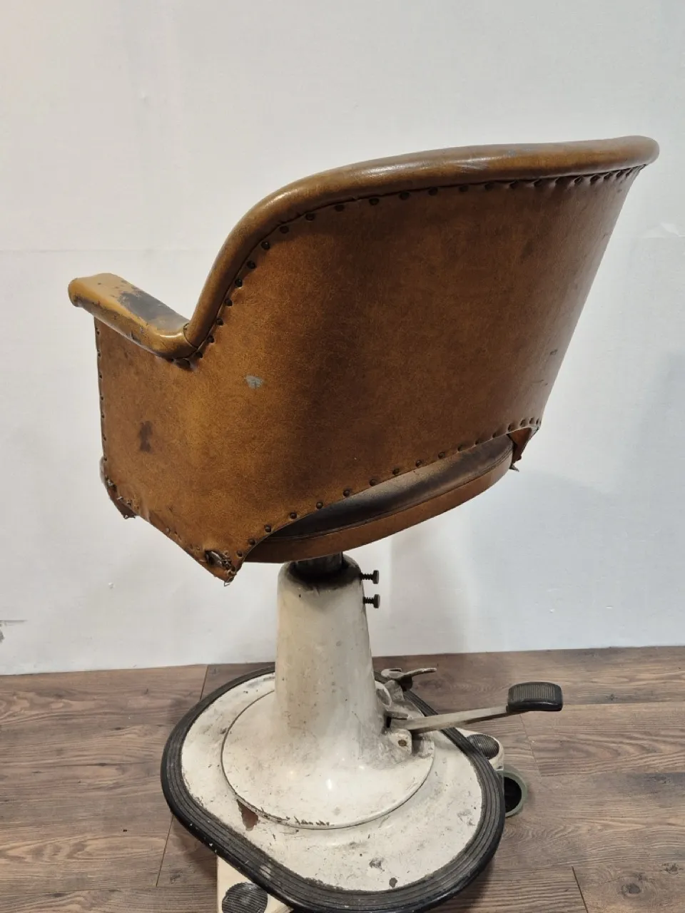 Äldre frisörstol, Skavanker loch slitage i sömmar. Ryggstödet sitter inte riktigt fast