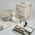 mini-äggvärmare, tekopp , plåtburk, 2st smörknivar L.11.5cm