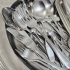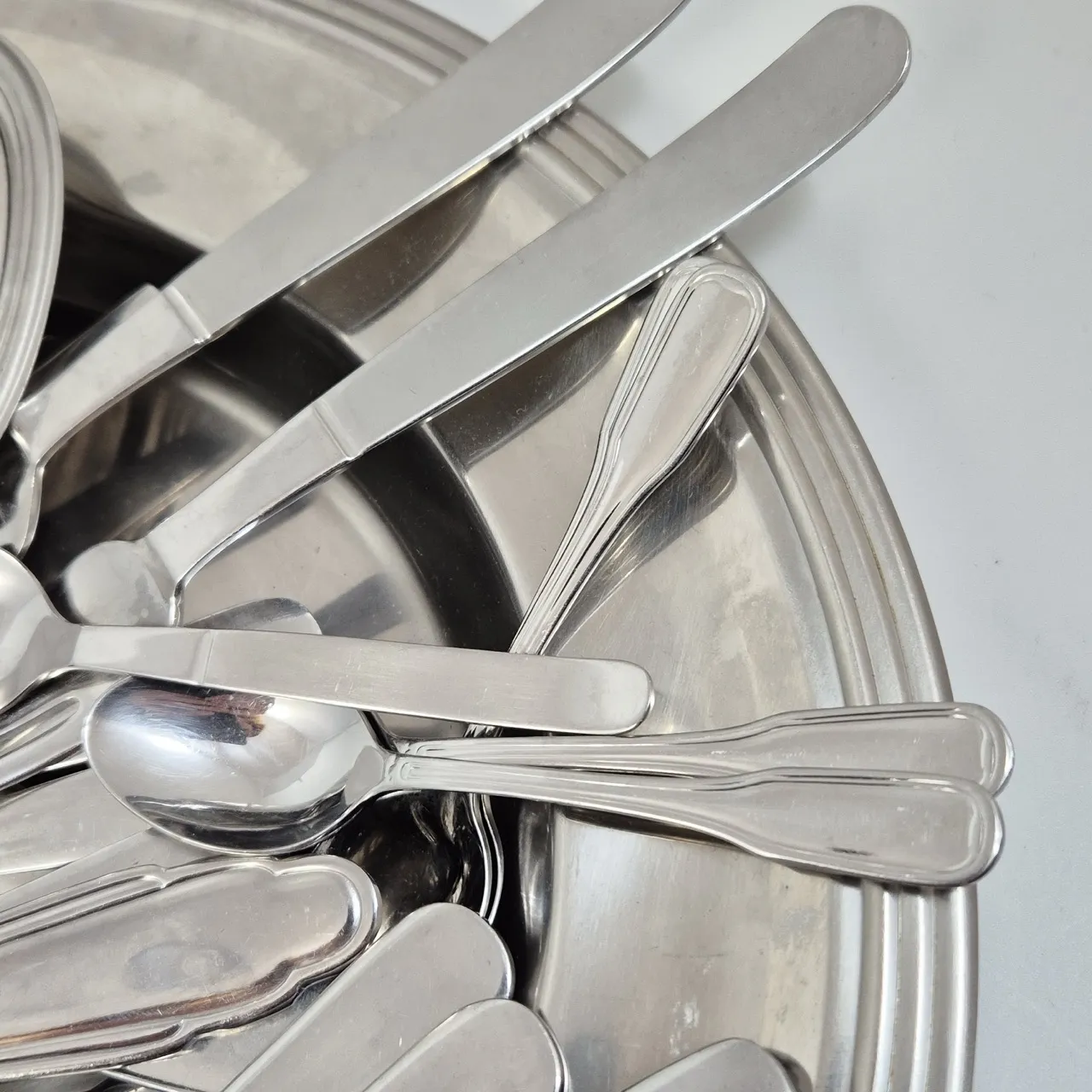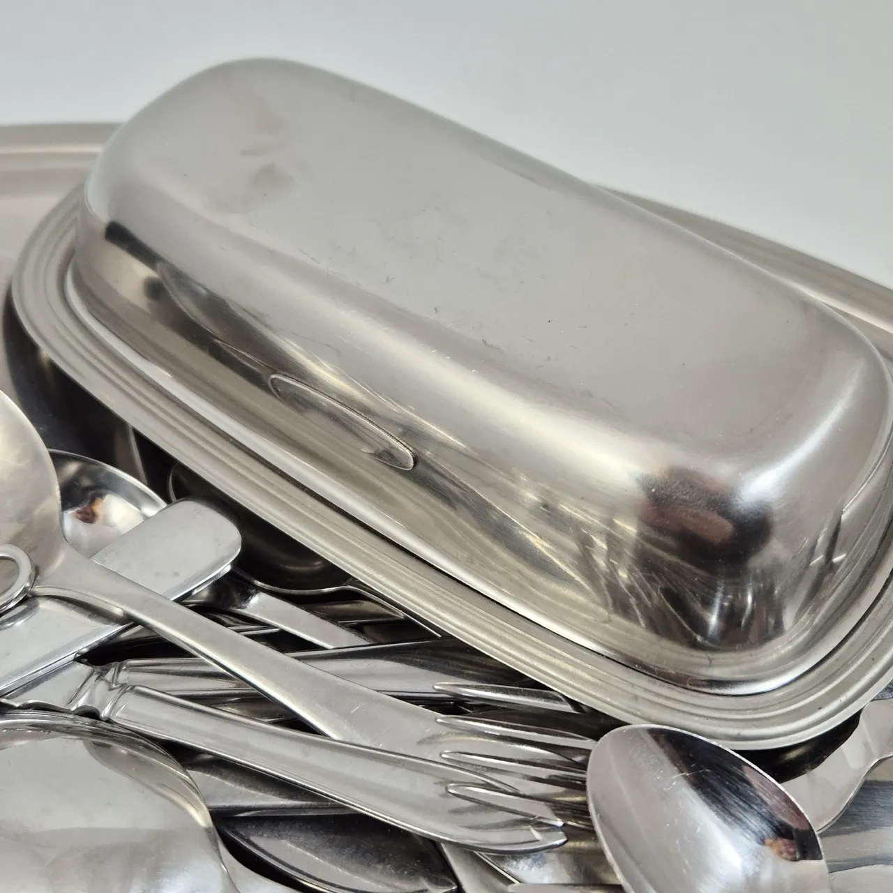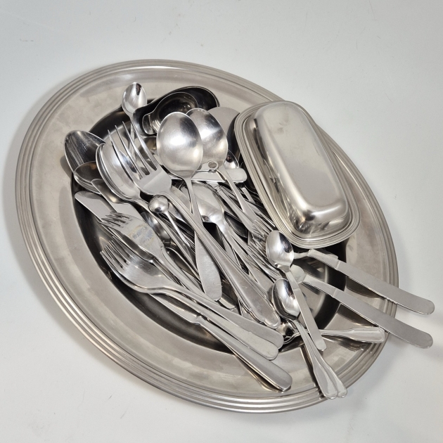 Olika sorter Gense bestick. Bricka.