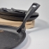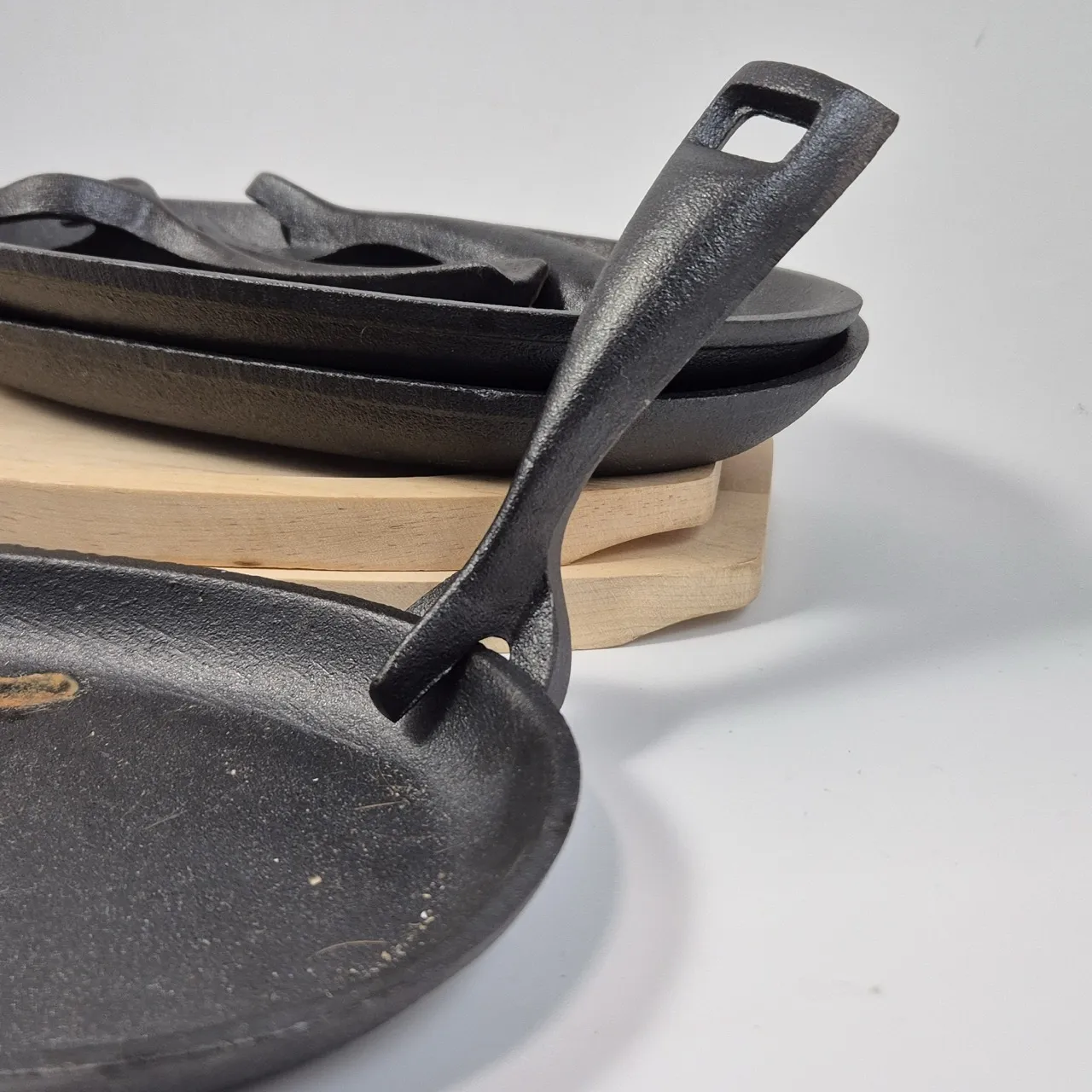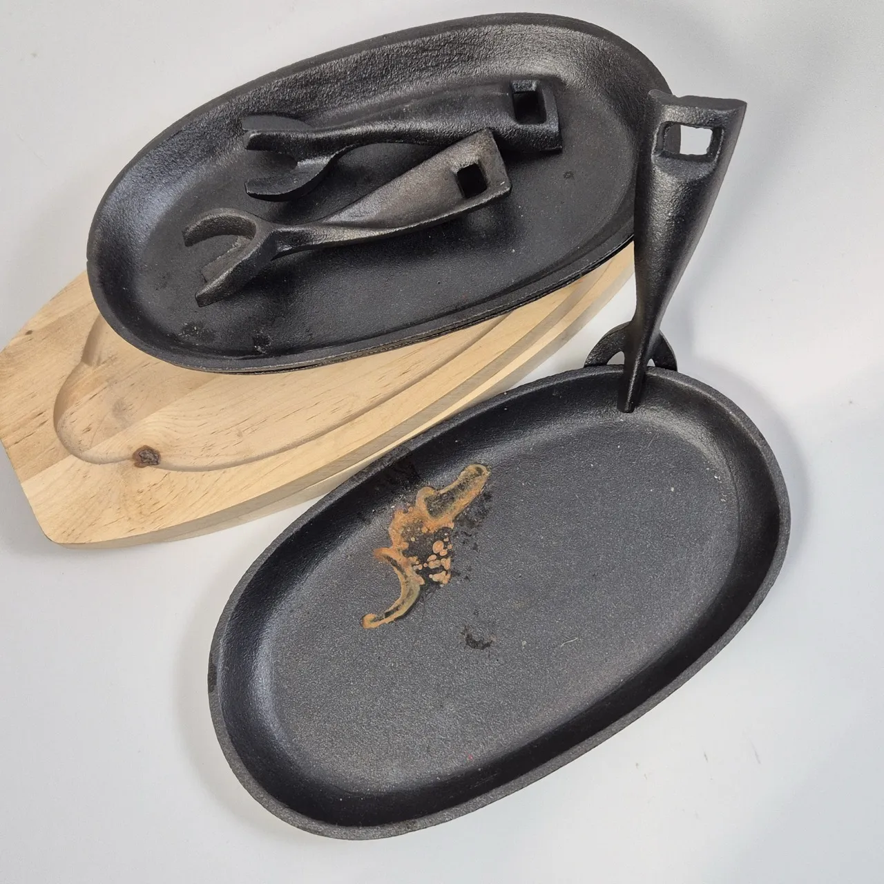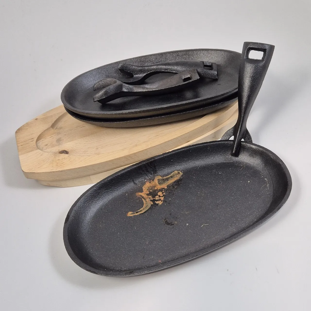 3st gjutjärnsfat L.24cm med "handtag", 2st underlägg i trä . ett fatr har ytrost