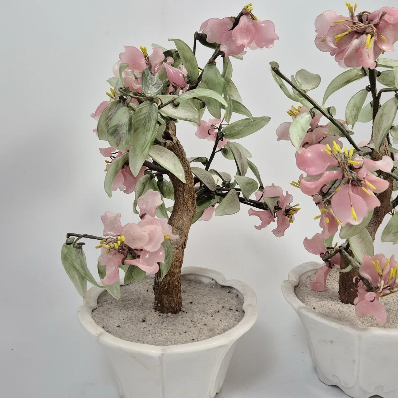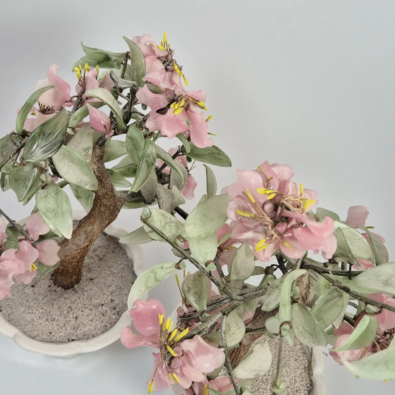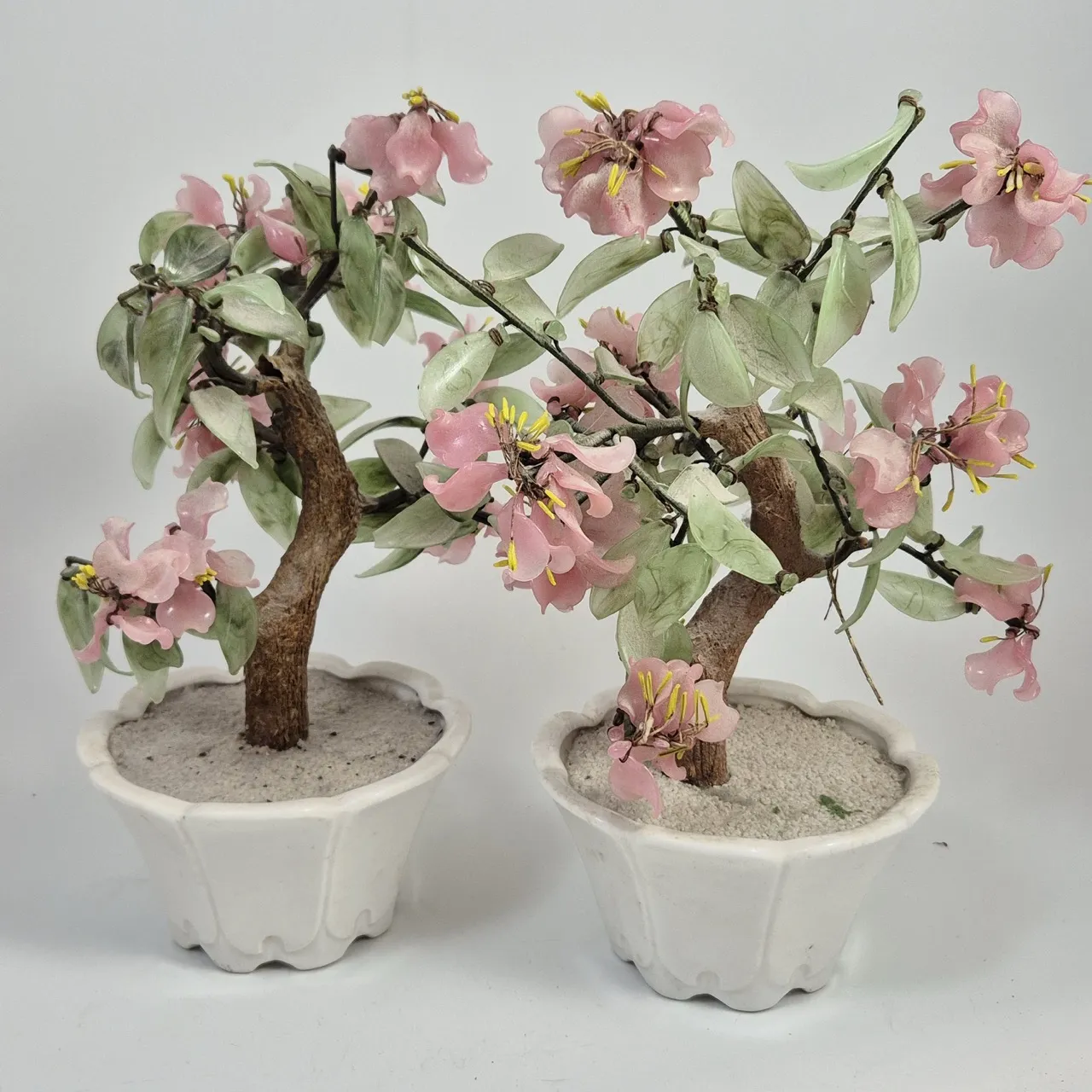 2st bonsaier i glas. Behöver dammas av men fina :). Ståltråd så det är lätt att justera blommor och grenar