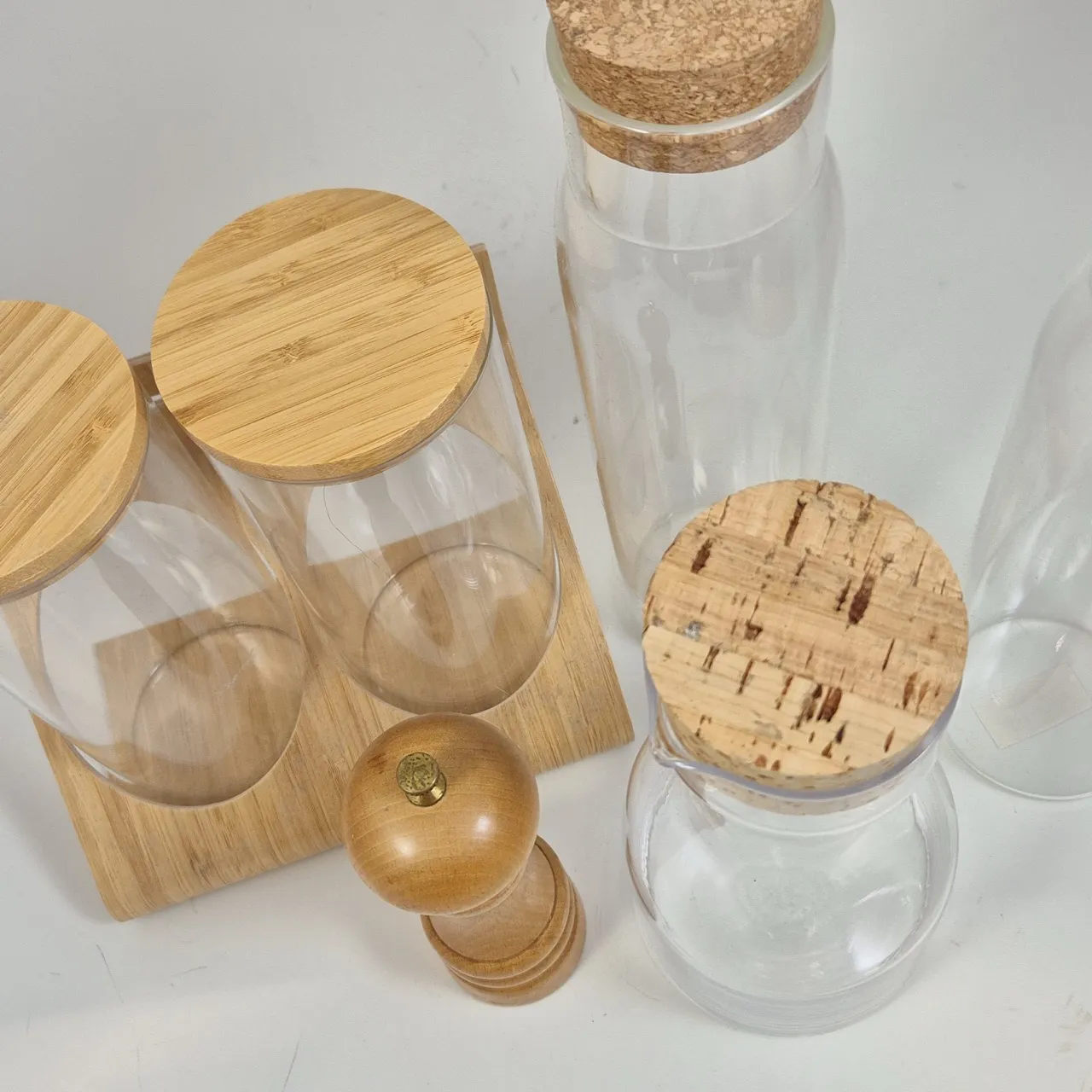 2st glasburkar med korklock 1 liter. träställning med 2st glasburkar. Pepparkvarn. Karaff med korklock