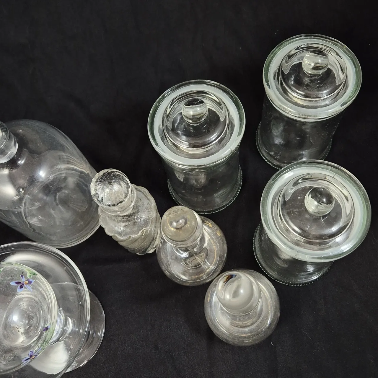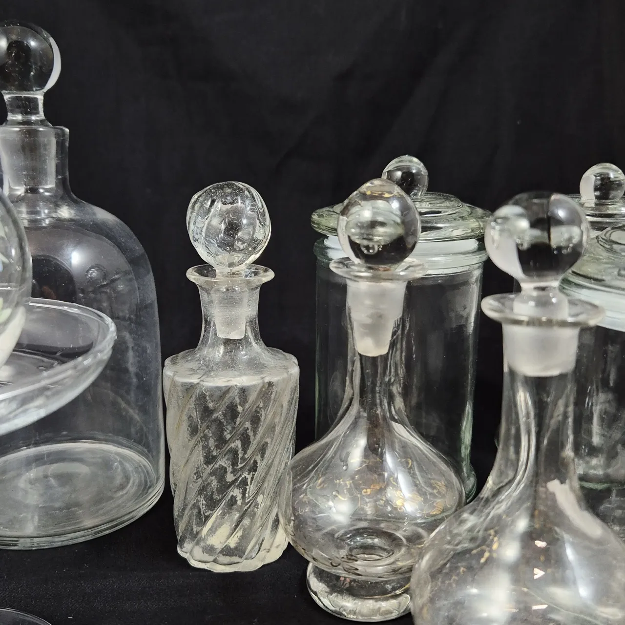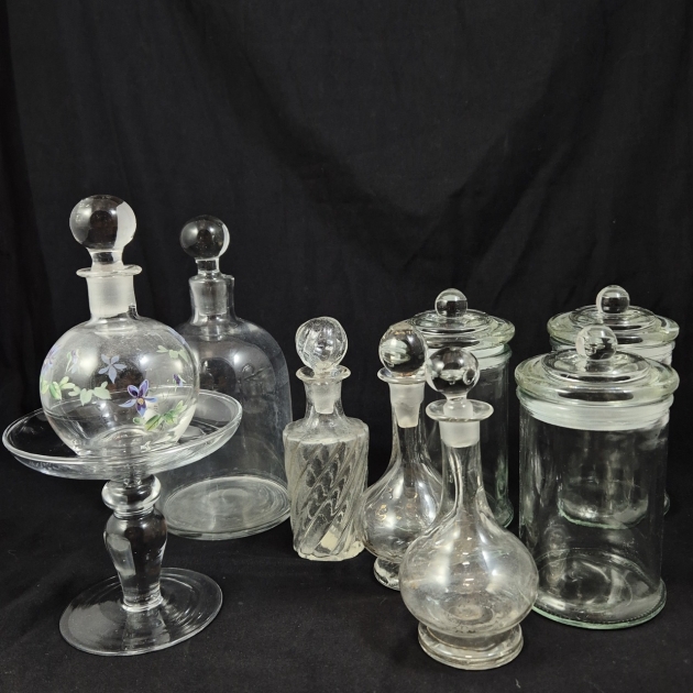 Karaffer och små glasburkar. Skavd dekor, immiga