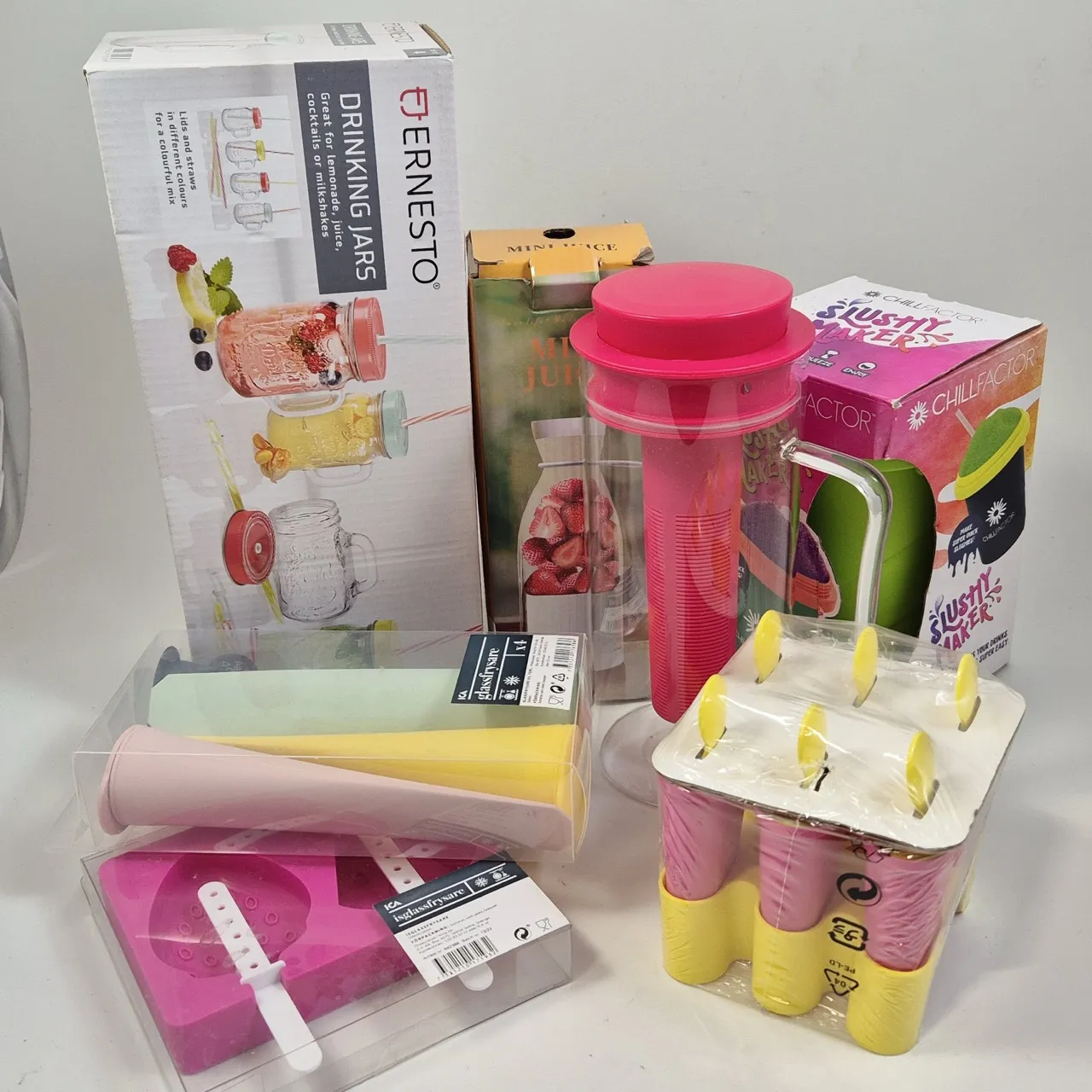 Glassformar, Juicer, Kanna, burkglas med sugrör, slushymaker