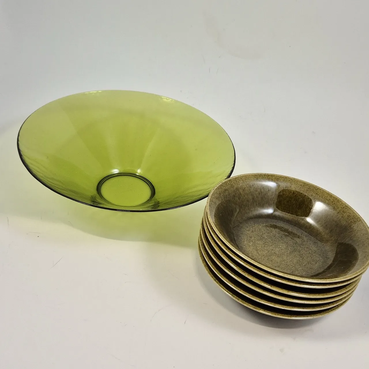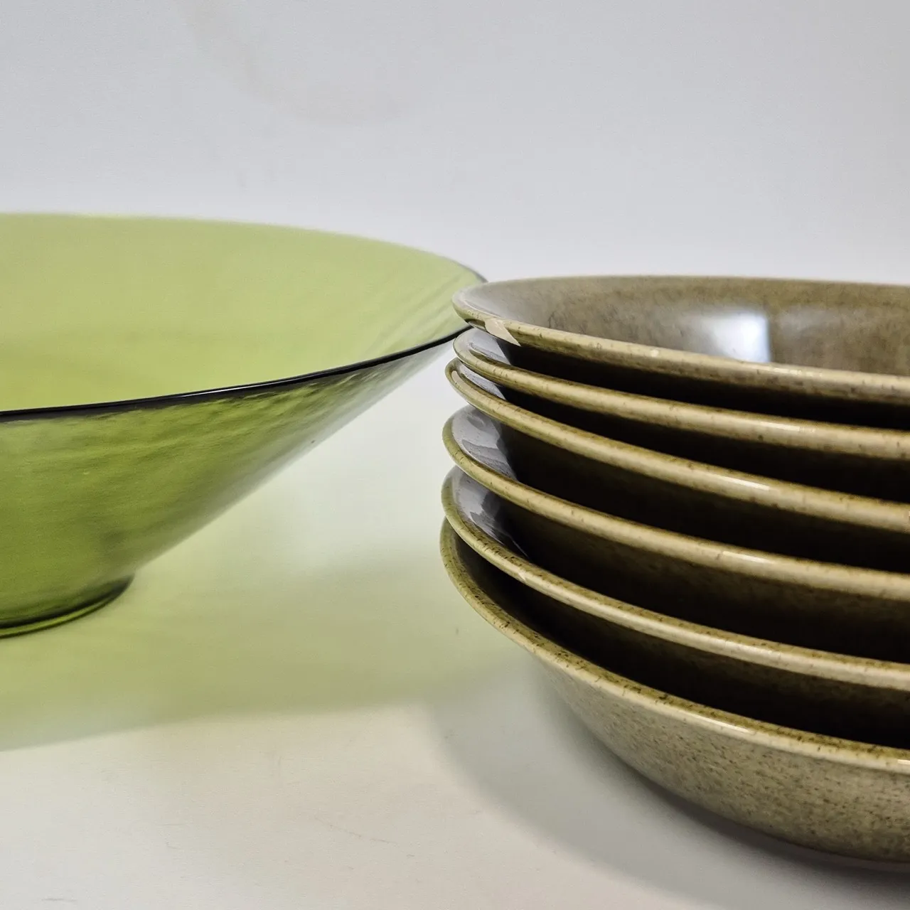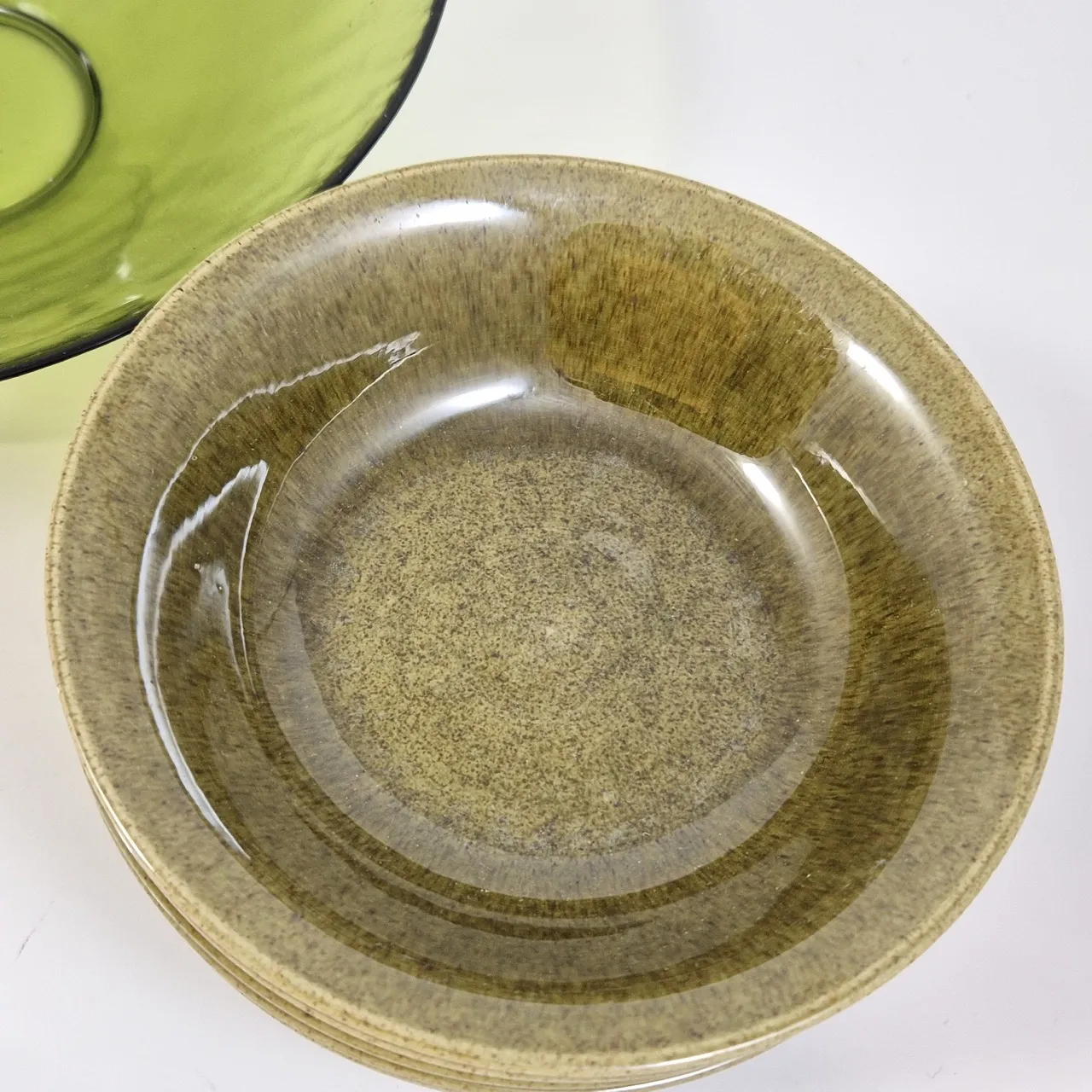 6st Gröna skålar, Deco.  keramik, repor i botten, en har nagg på undersidan. D. 17cm