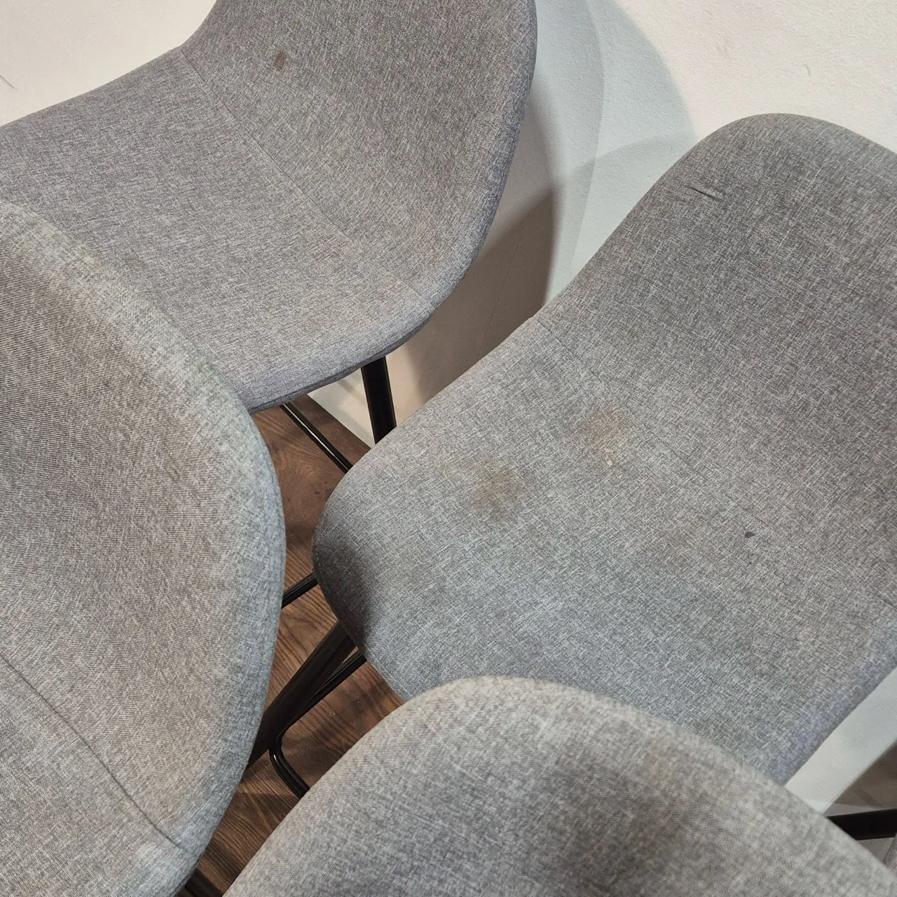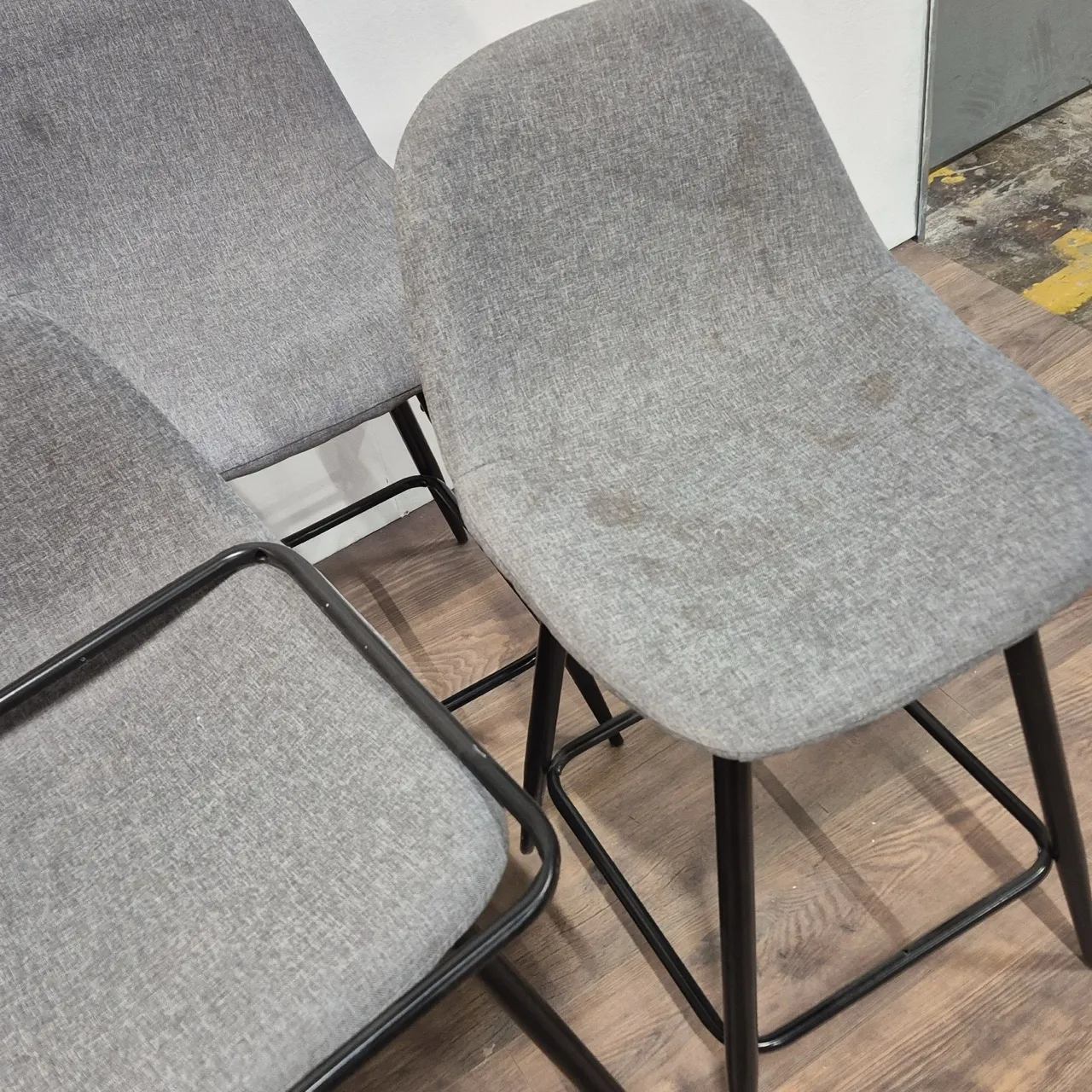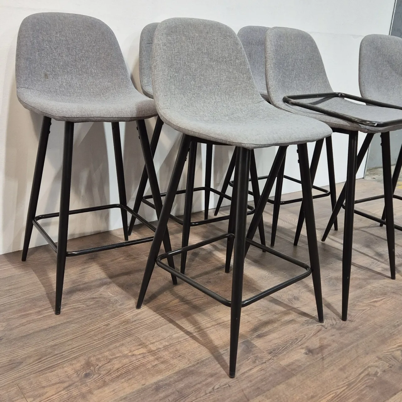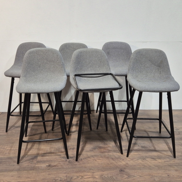 6st höga stolar, fläckar på sitsarna. En saknar skruvarna till fotpinnen. Sitthöjd 64cm