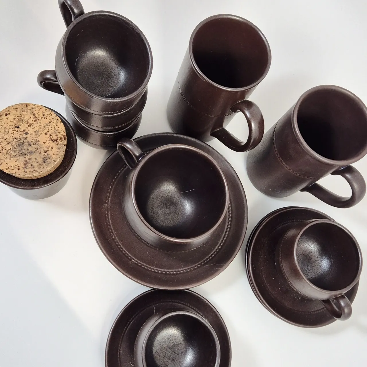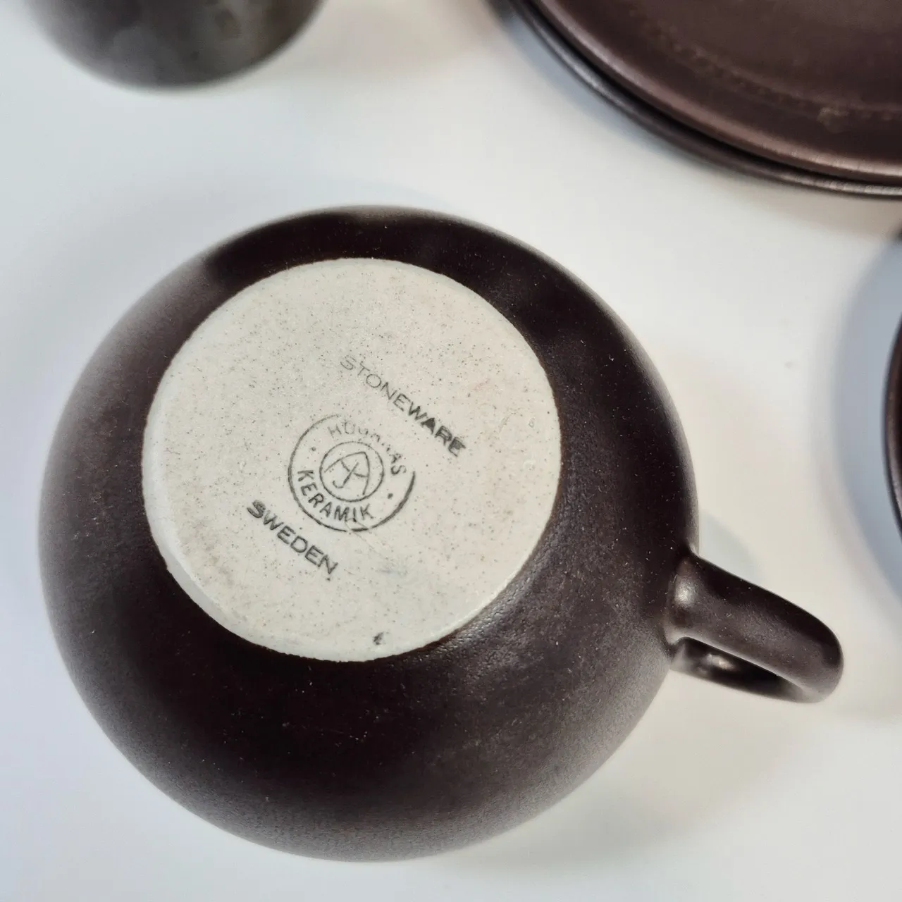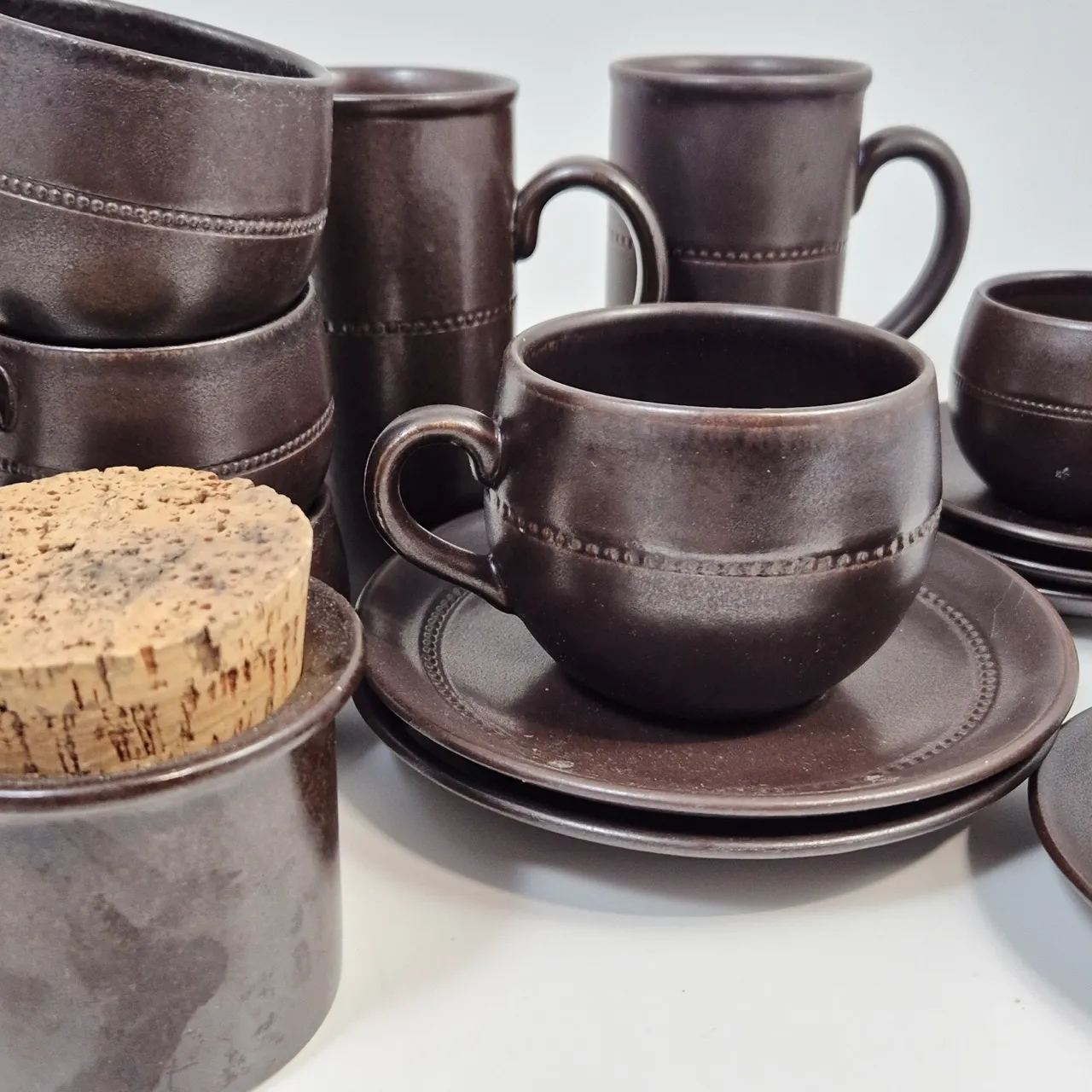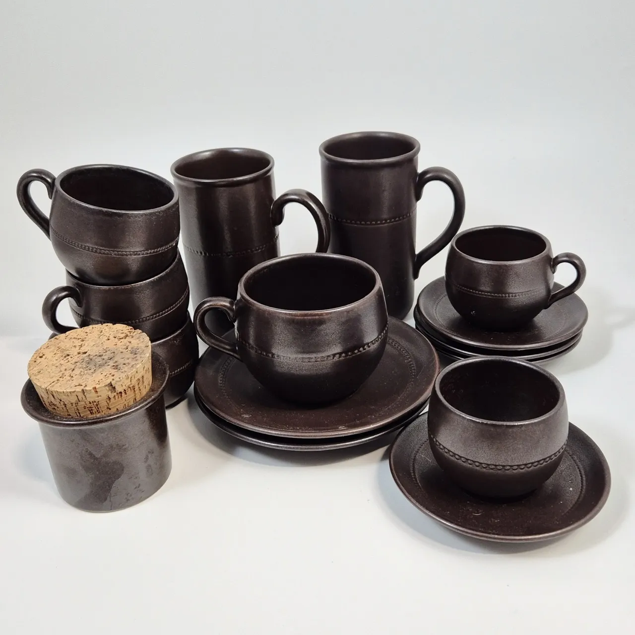 Höganäs. 1st tekopp, 2 st hög mugg, 5st kaffekoppar med 4st fat. 1st burk med korklock