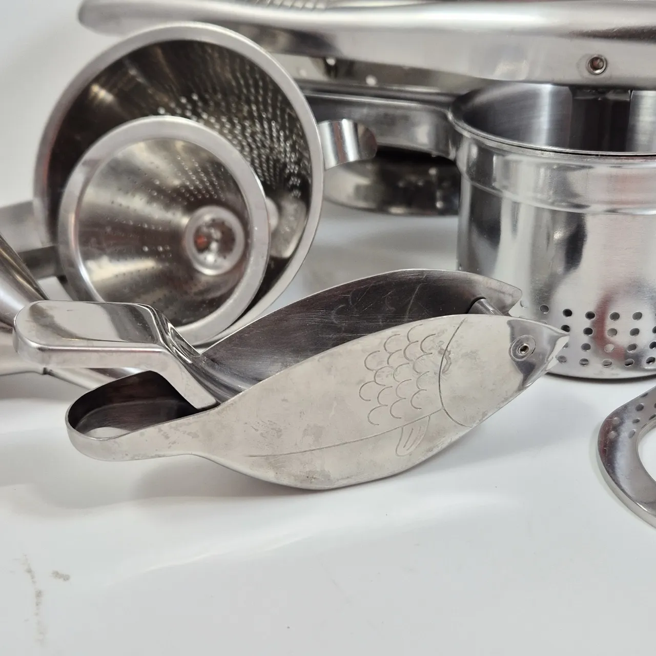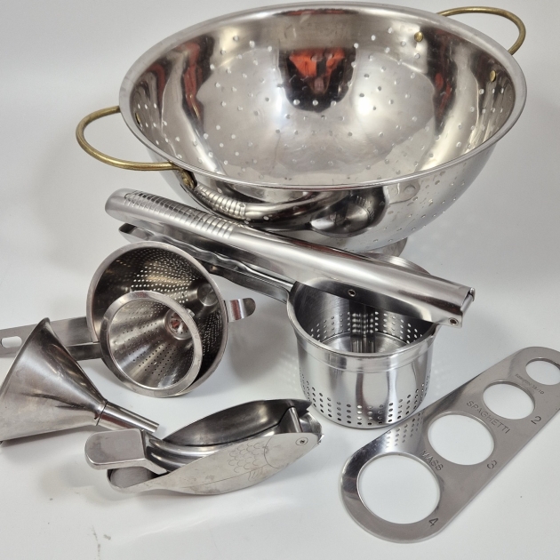 Durkslag D.28cm , tratt, silar, citronpress, potatispress, spagettimått