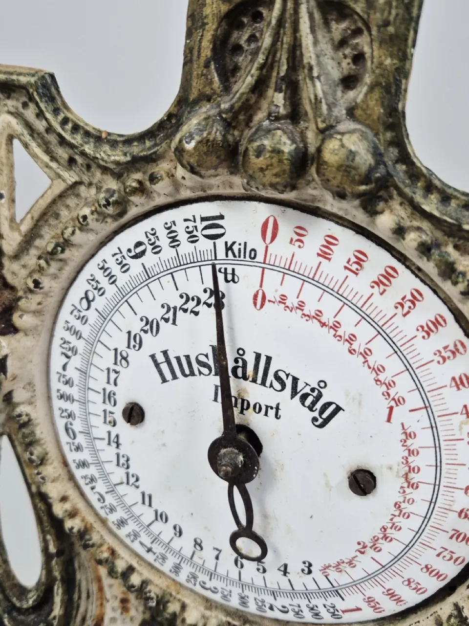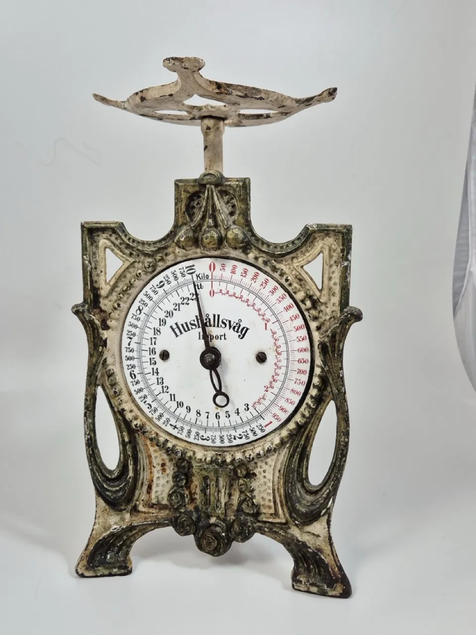 Äldre urtjusig hushållsvåg i metall. H. 31cm