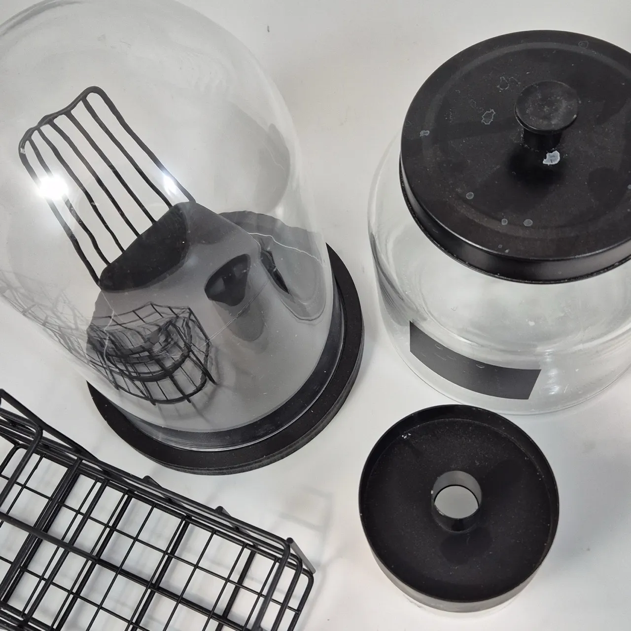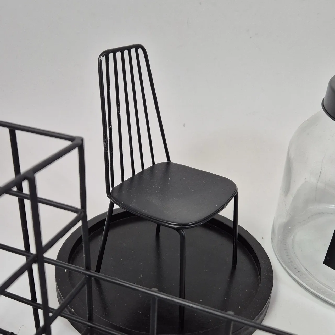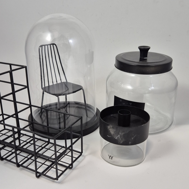 Glaskupa H.24.5cm , liten stol, bestickställ, burk, ljusstake