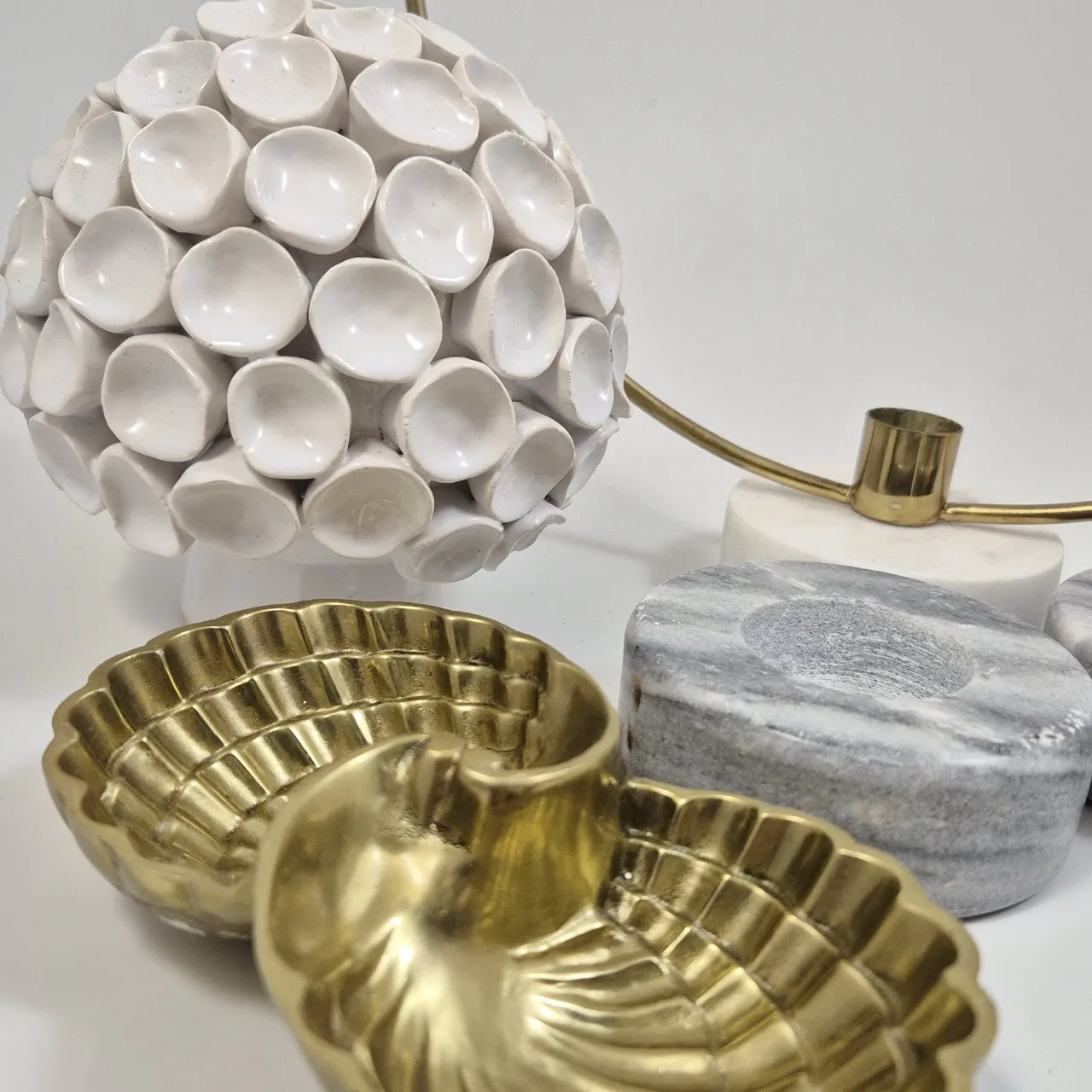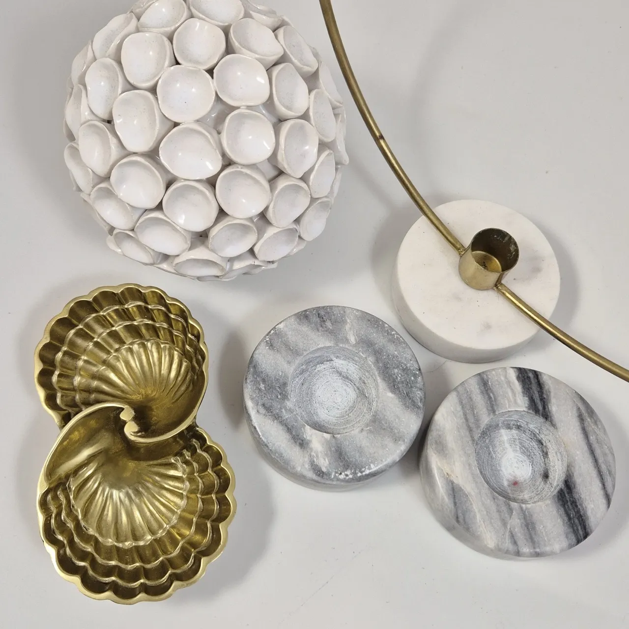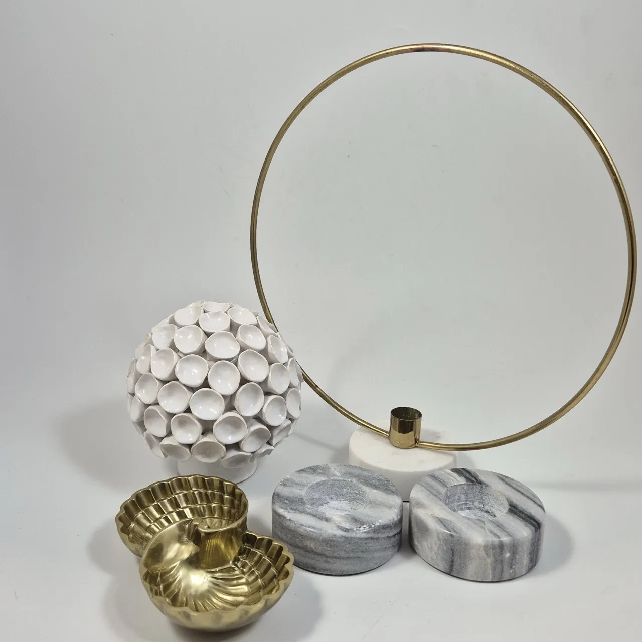 Ljusstake med marmorfot. 2st ljuslyktor marmor. Keramikdekoration, guldiga skålar