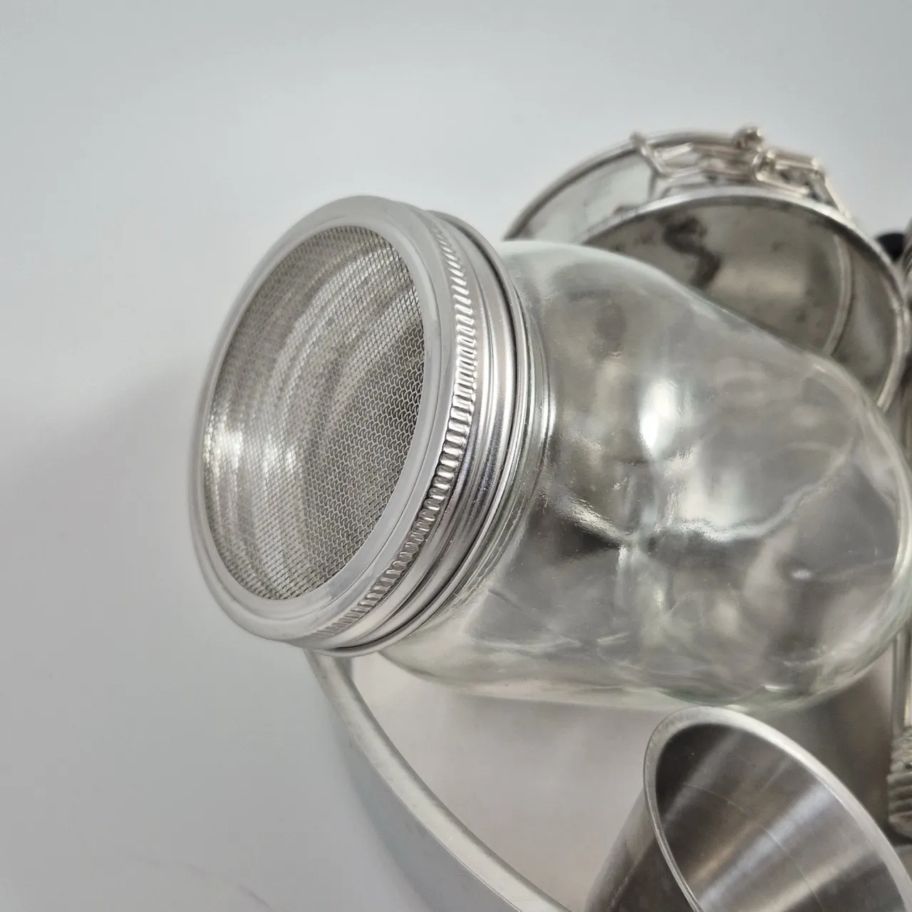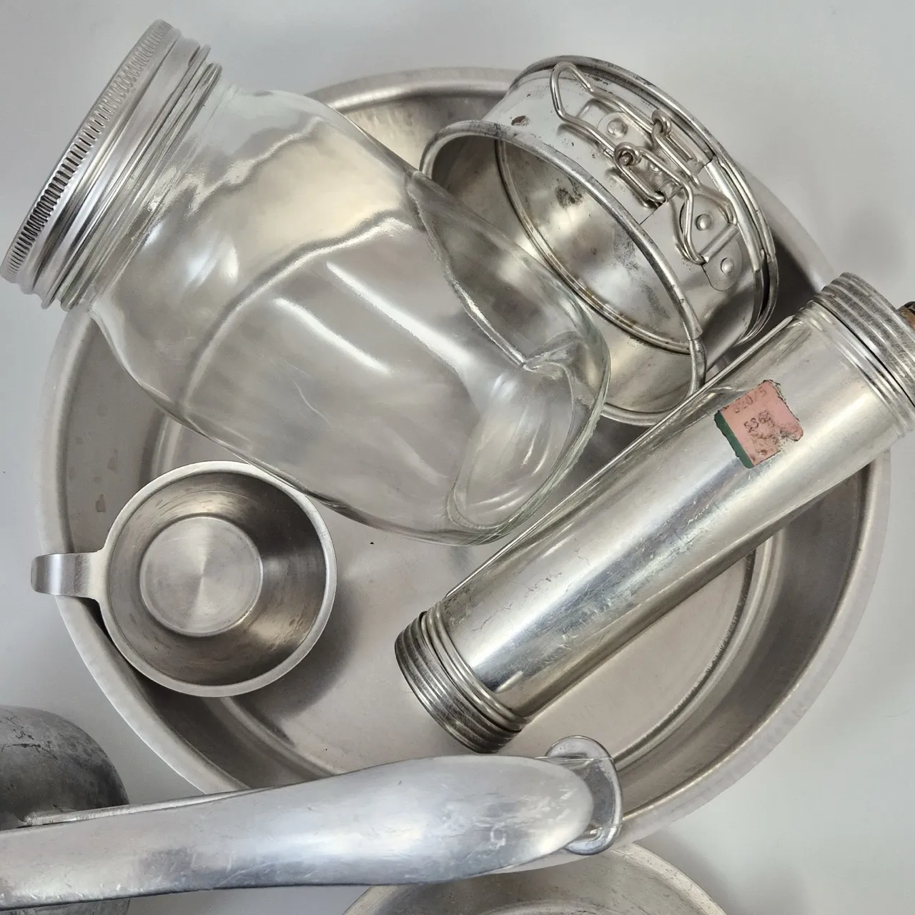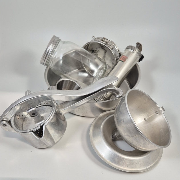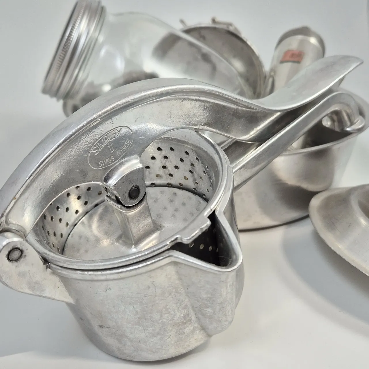 Juicepress, kaksprits, tratt som stänger sig när man tar bort de, mini-springform, mjölsiktarburk , låg bunke/form, dlmått
