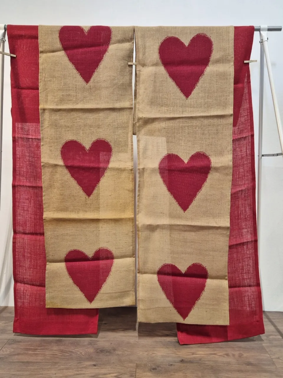 2st röda paneldardiner, 2st naturfärgade med hjärtan panelgardiner. 200cm långa