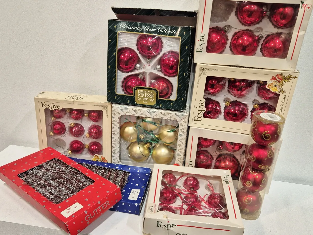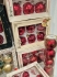 Julkulor och glitter i röda toner