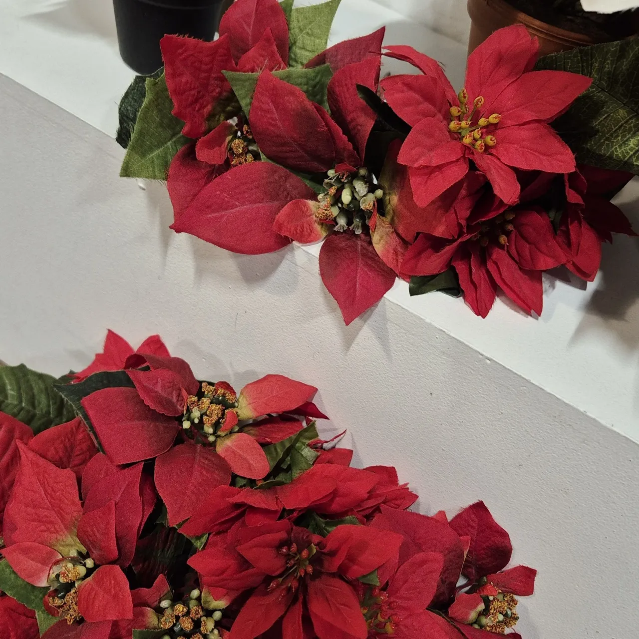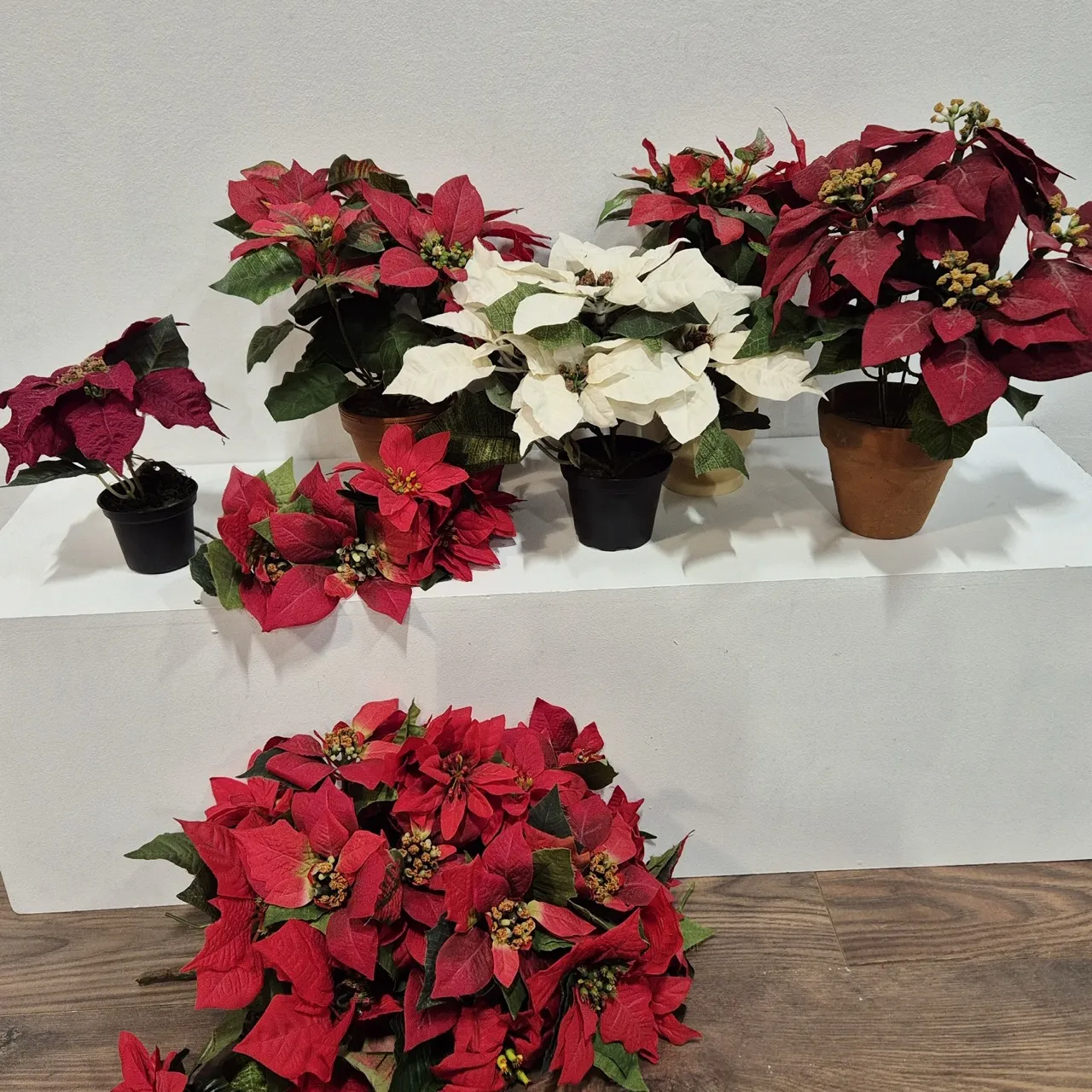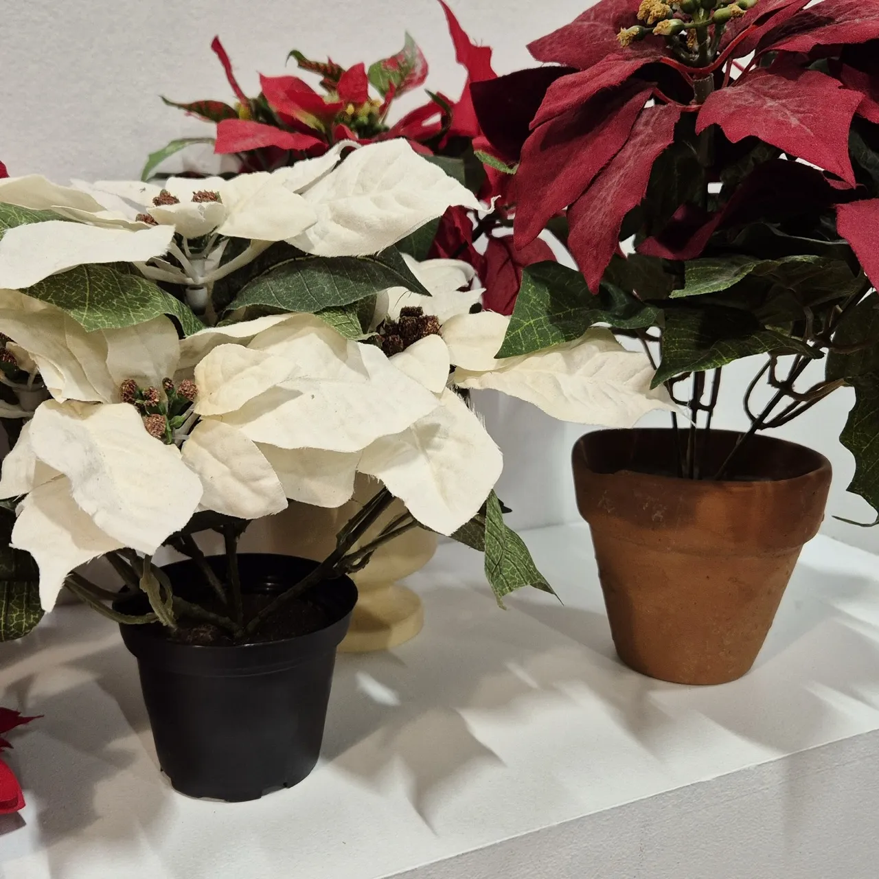 Julstjärnor i olika storlekar och färger i konstmaterial.