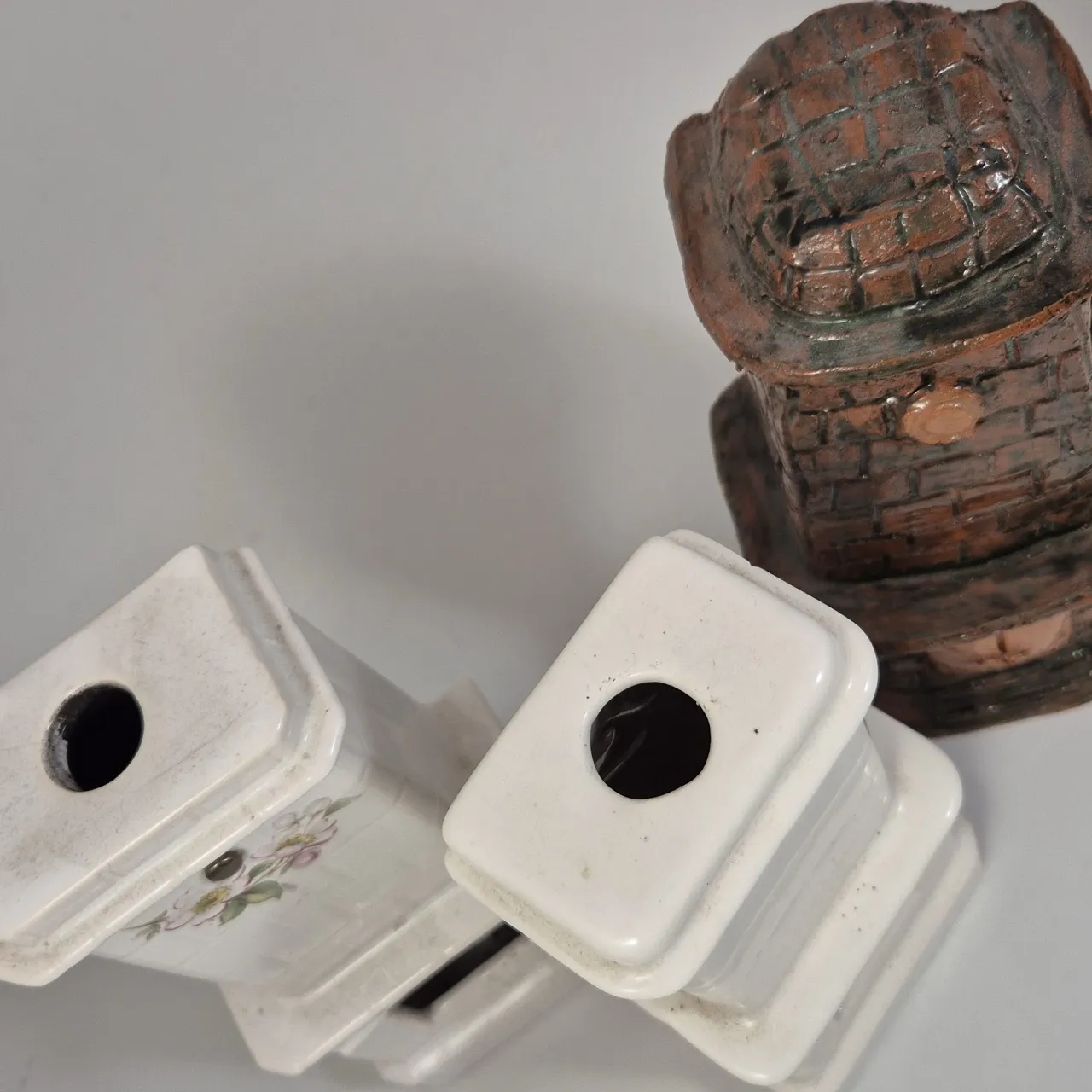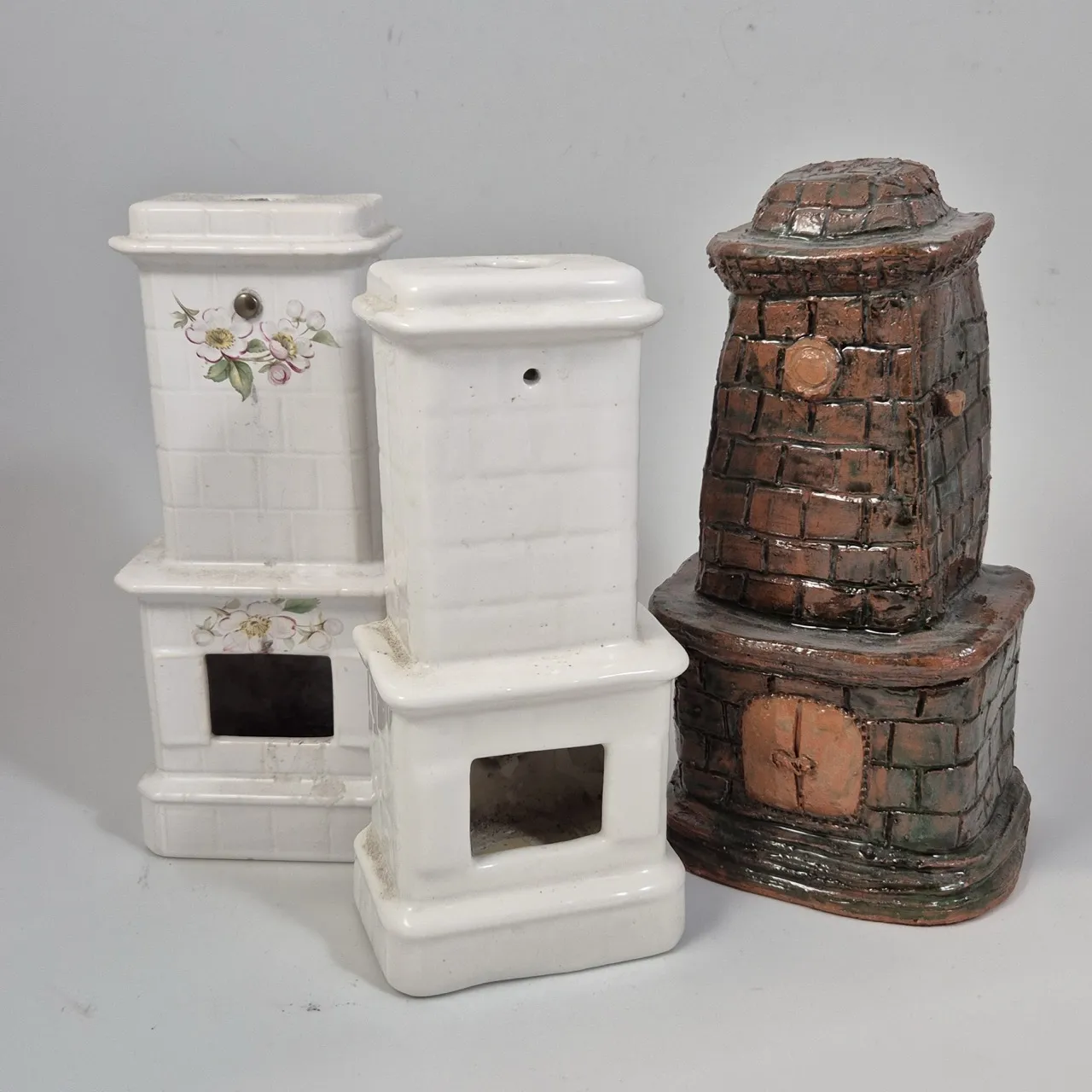 3st miniatyr kakelugnar, 2st en kan ha värmeljus i . H.22cm