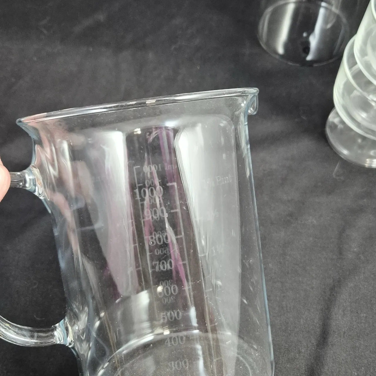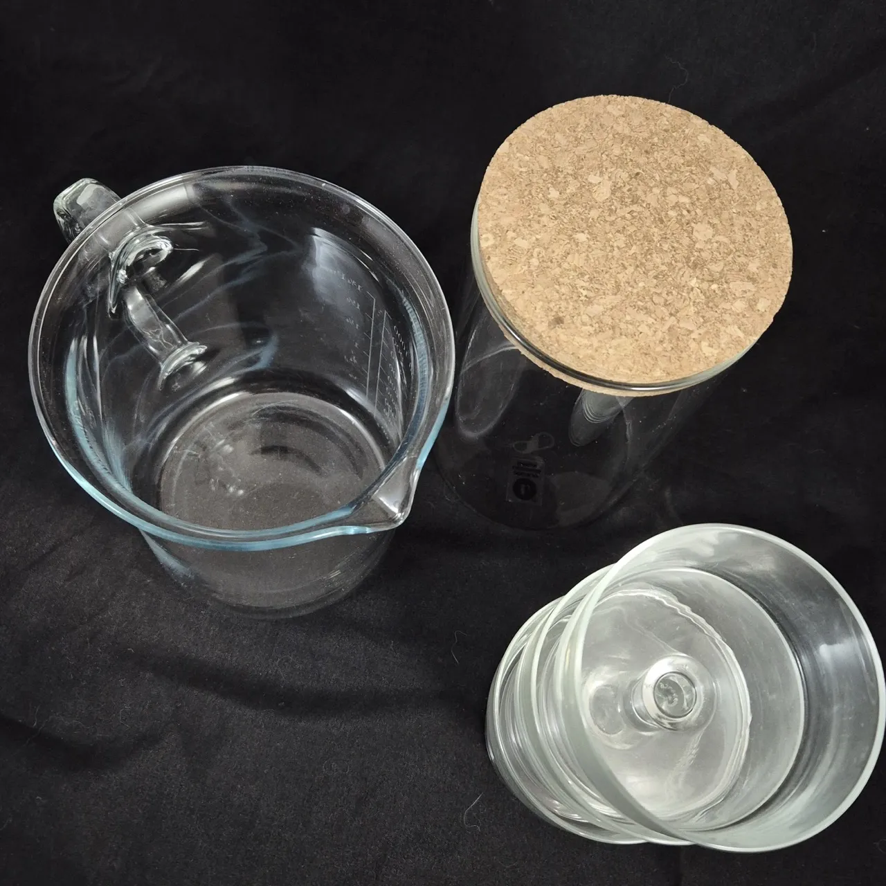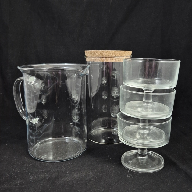 Glasburk med korklock, kanna i glas 1liter , 3st dessertskålar
