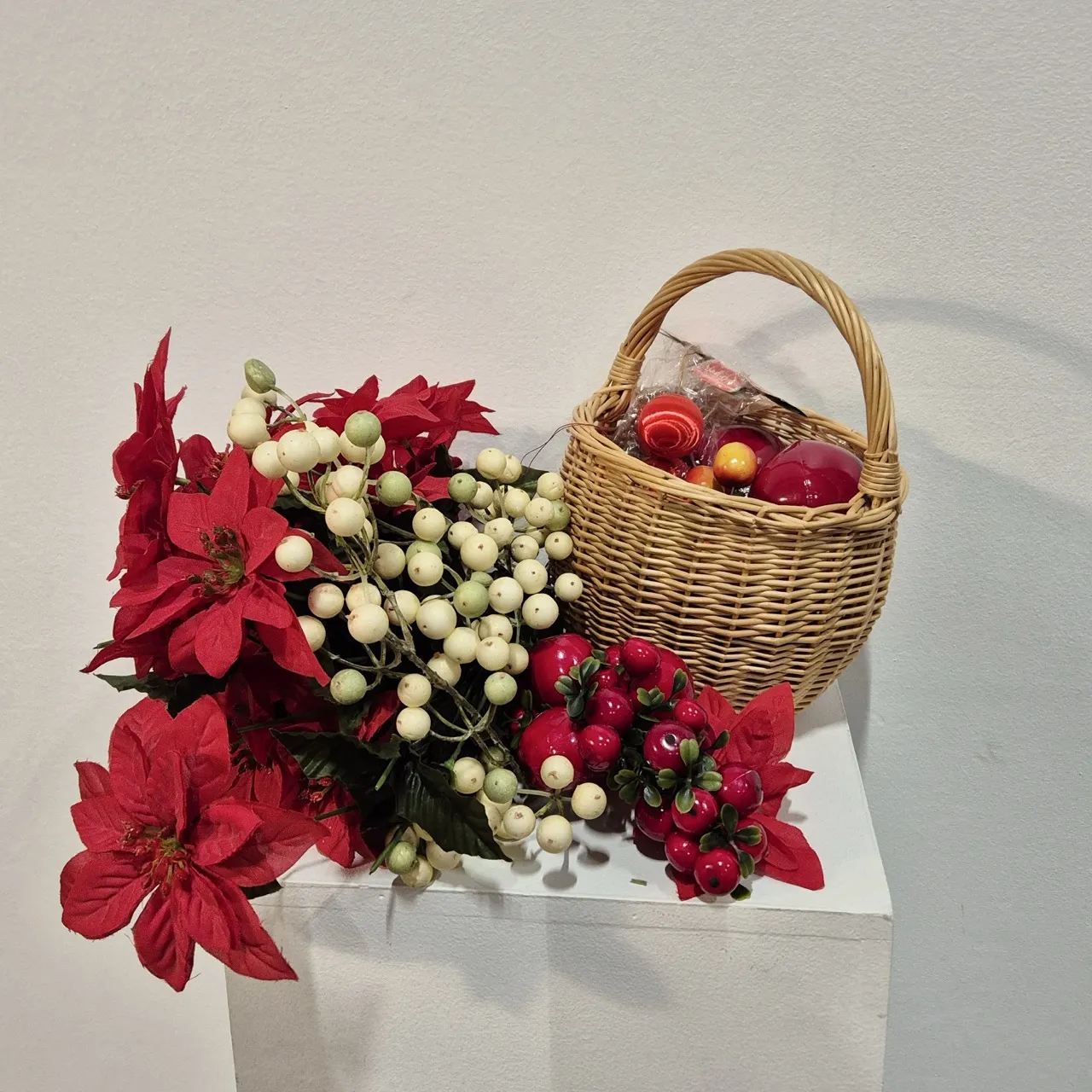 Julstjärnor i plast, äpplen, vitabärpinnar. mm.