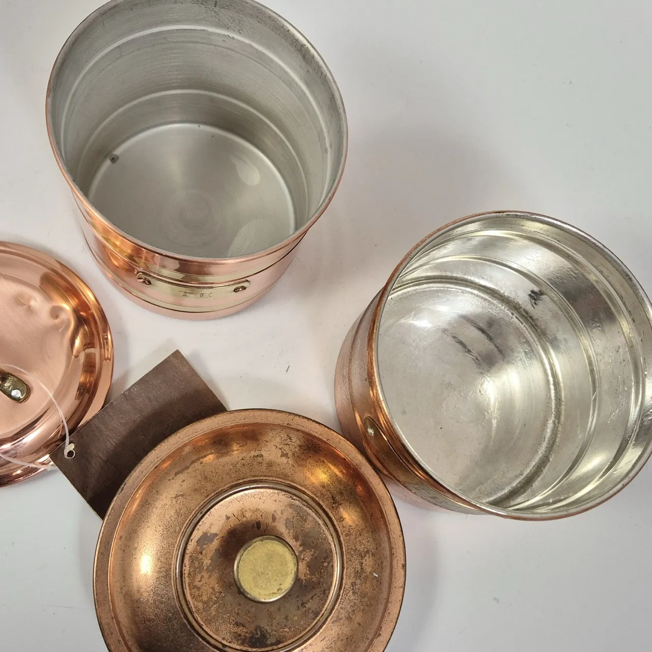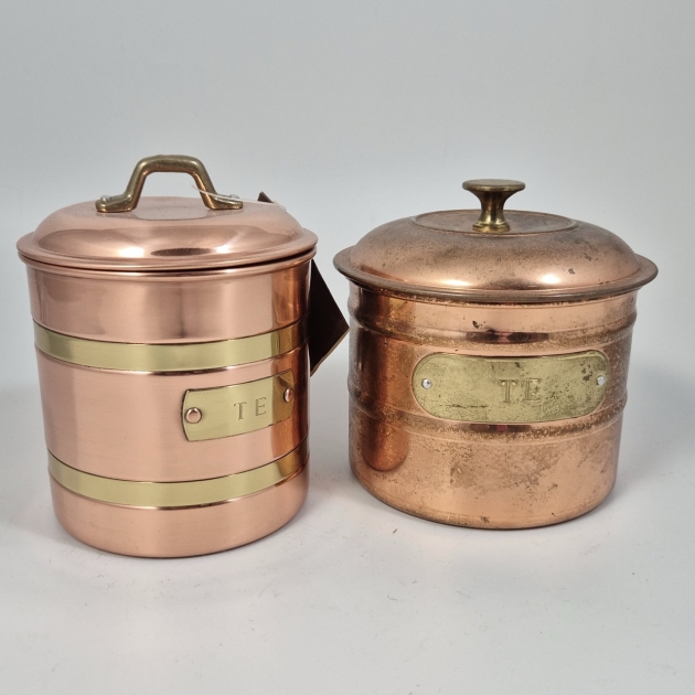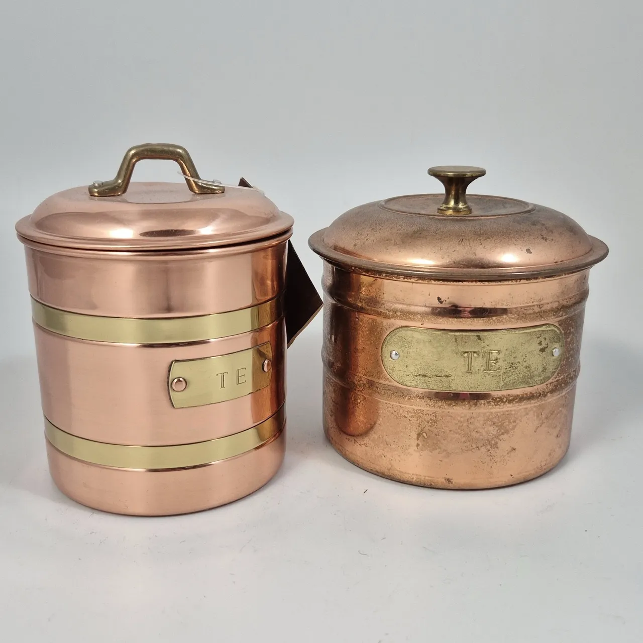 2st teburkar i koppar. Den blanka har en bula i locket. H. ca 14cm