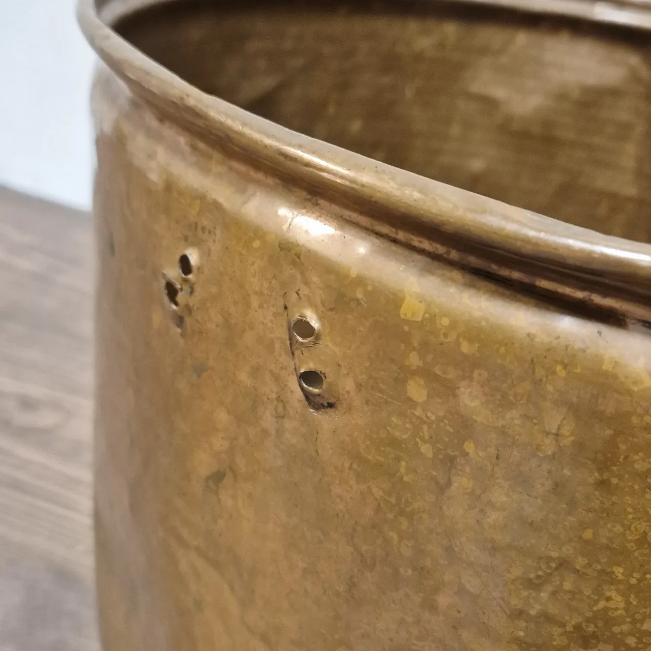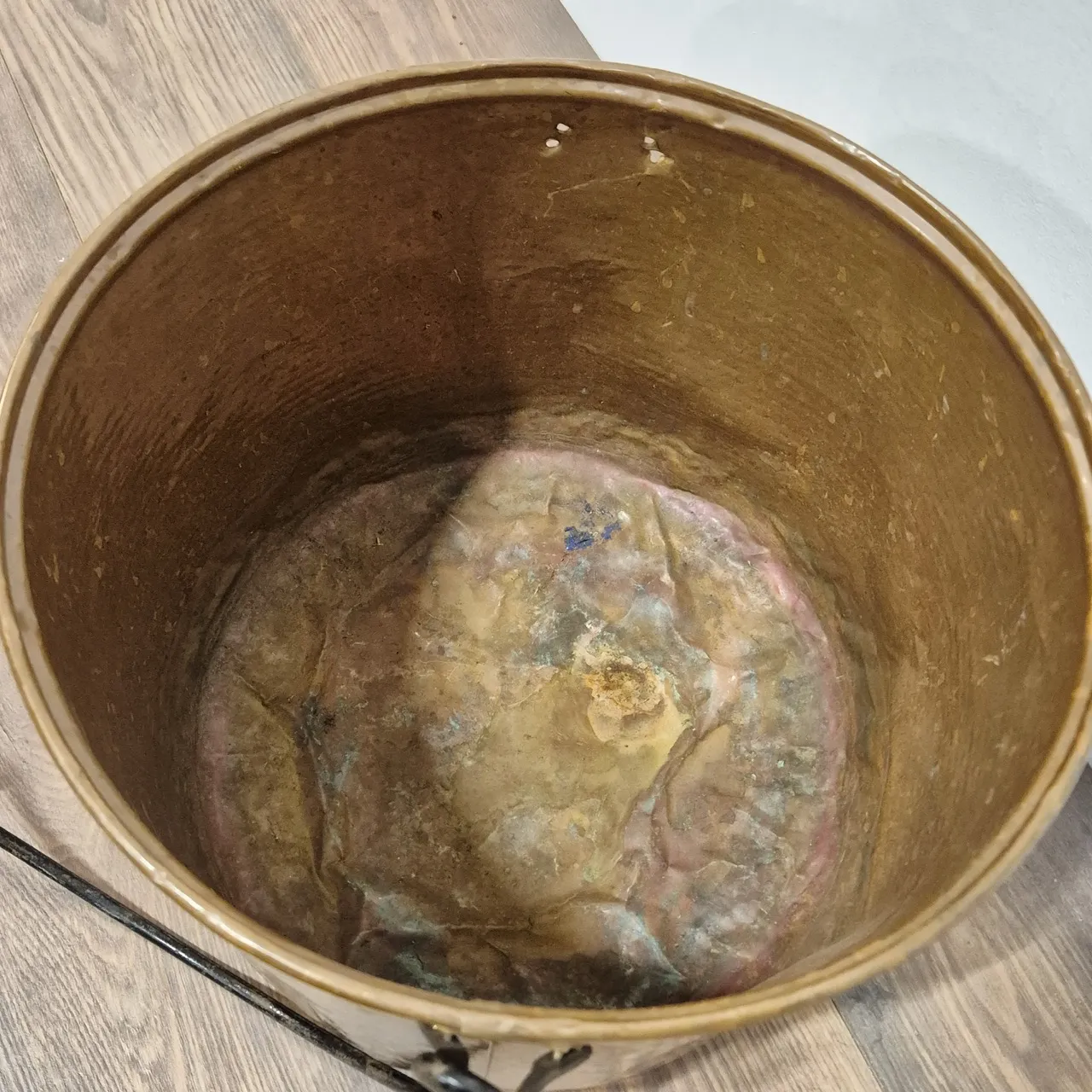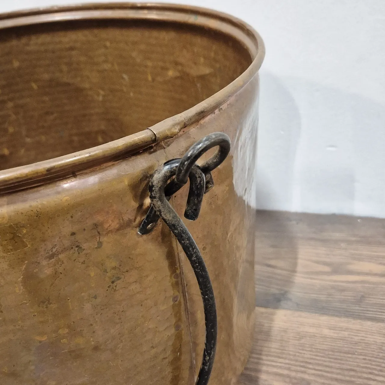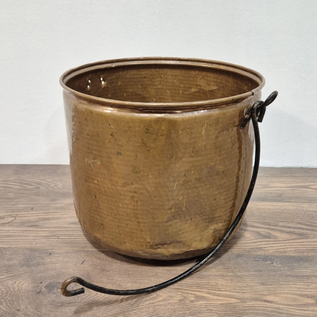 Stor kopparhink , saknar ett handtagsfäste, bucklig botten . H 32cm