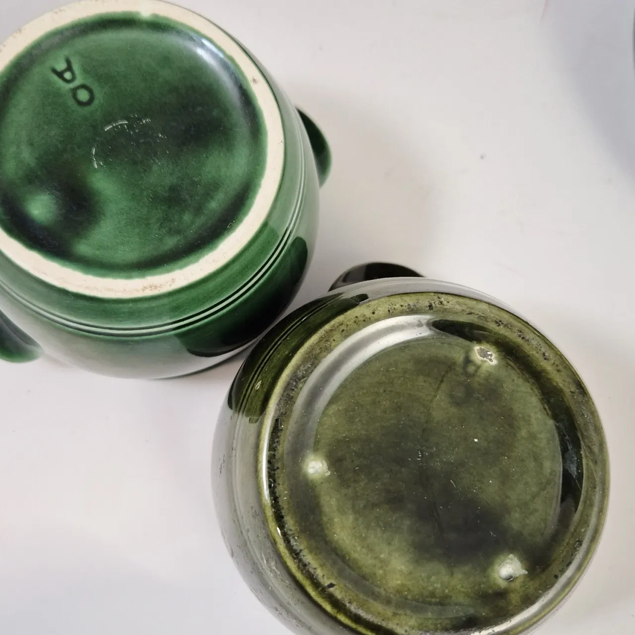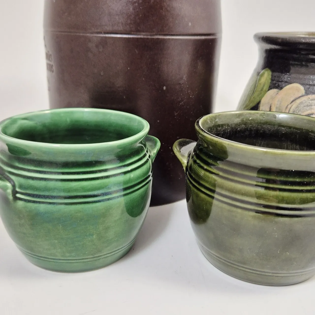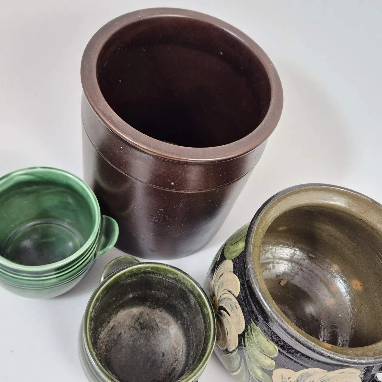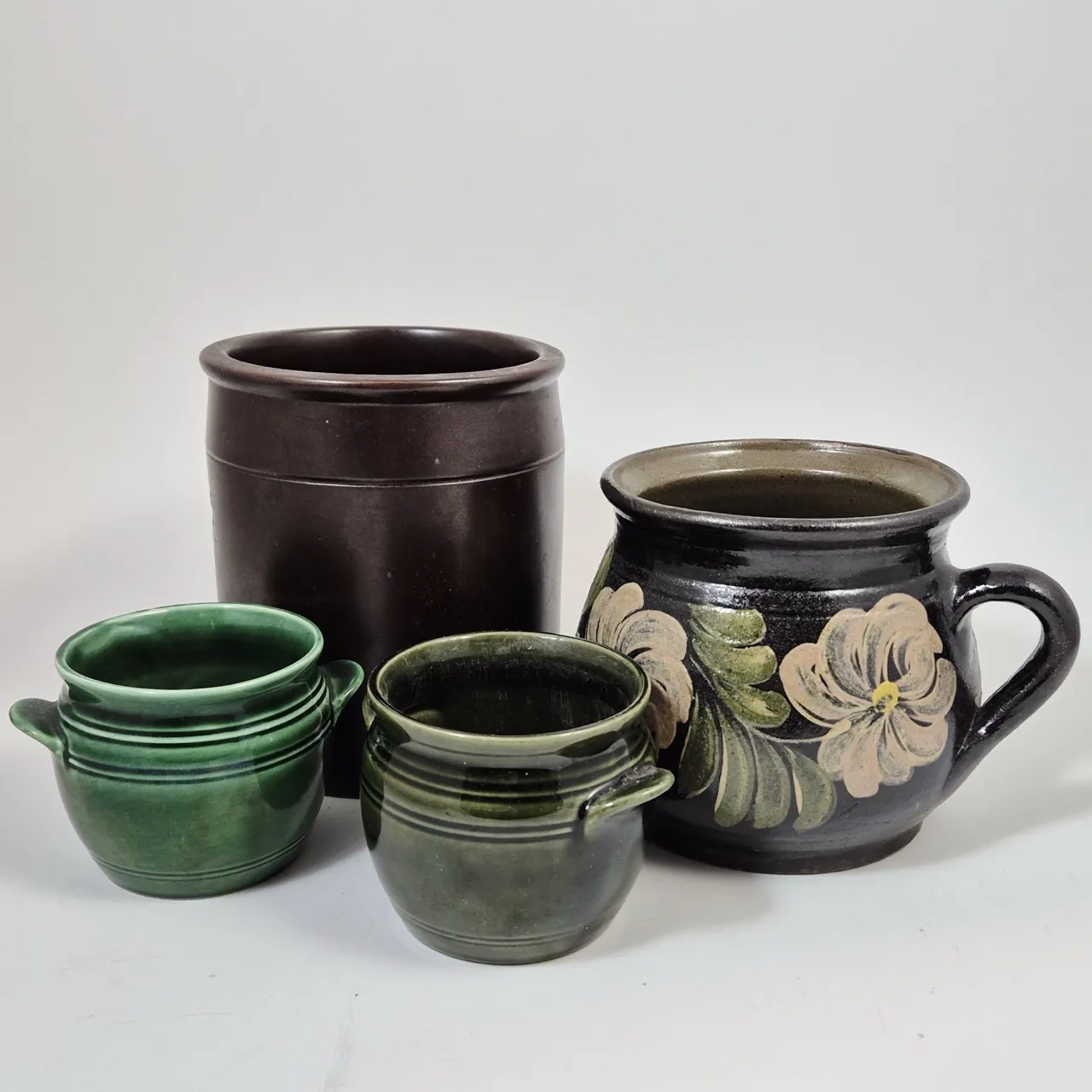 Höganäs kruka 2liter , 2st olika gröna småkrukor, Äldre målad kruka