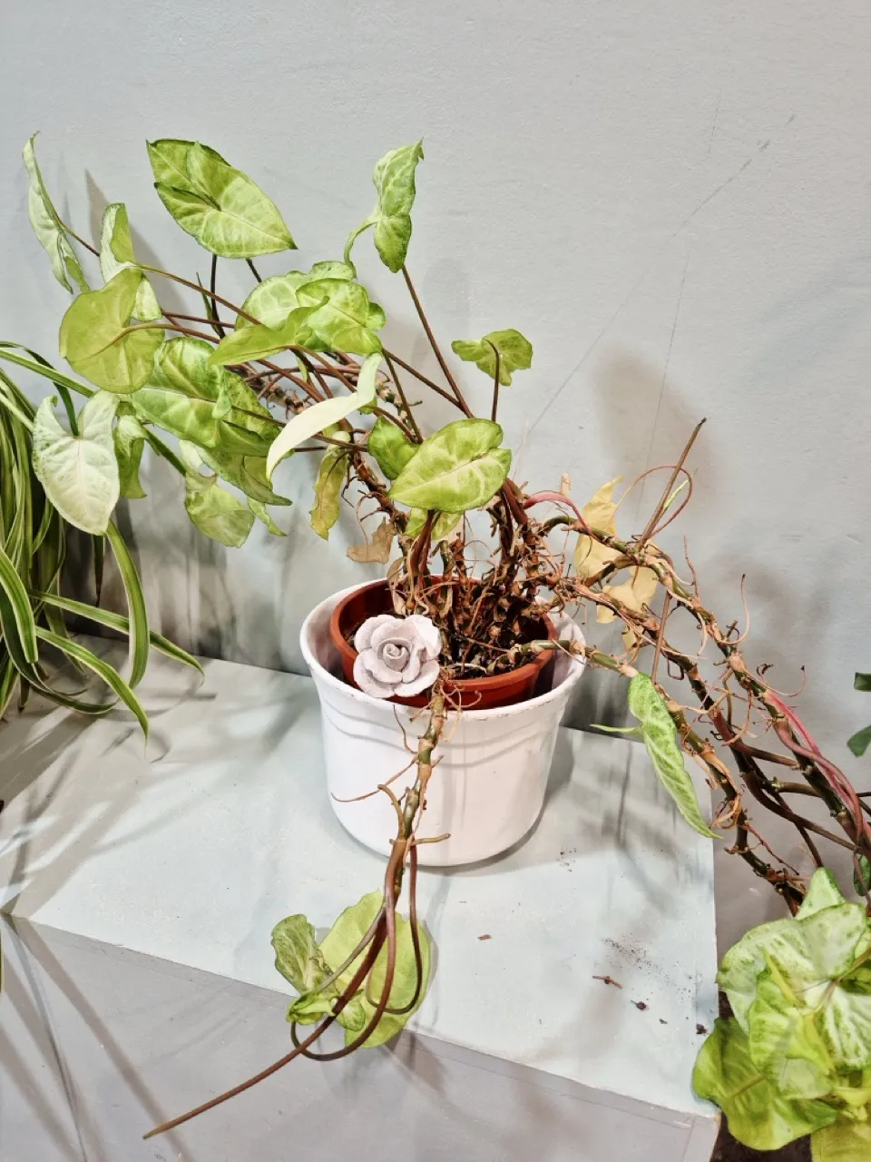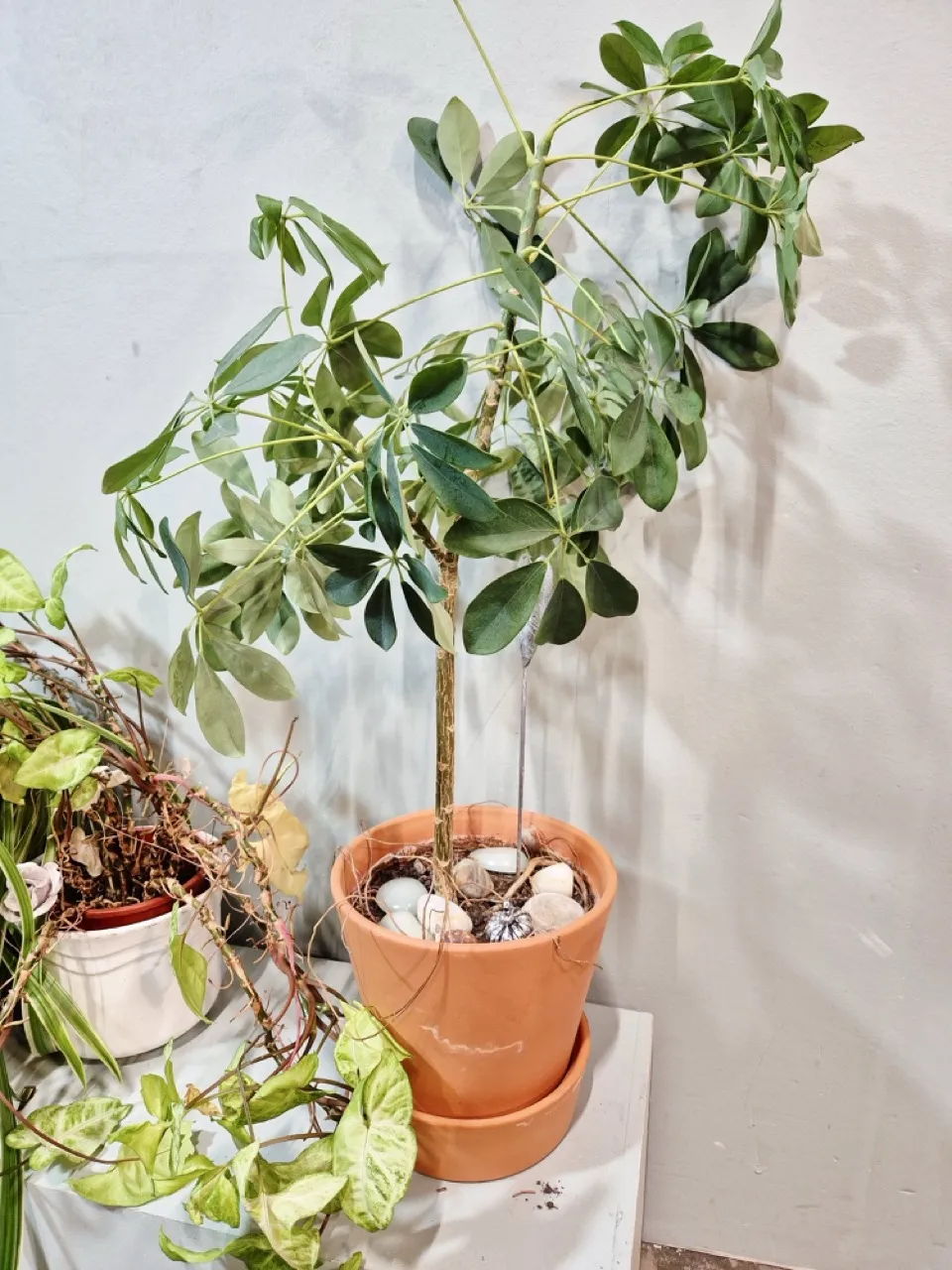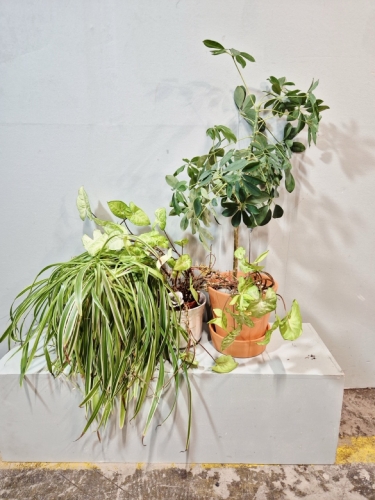1st paraplyaralia i lerkruka med fat H.80cm, 1st Syngonium i kruka, 1st Ampellilja i kruka .