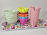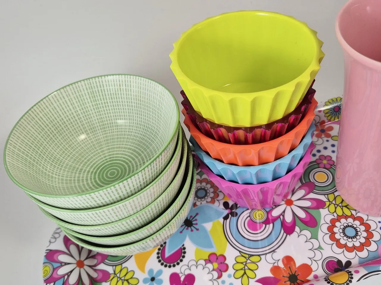 Bricka, vas Höganäs H.16cm , 5st skålar i porslin, 5 skålar i plast