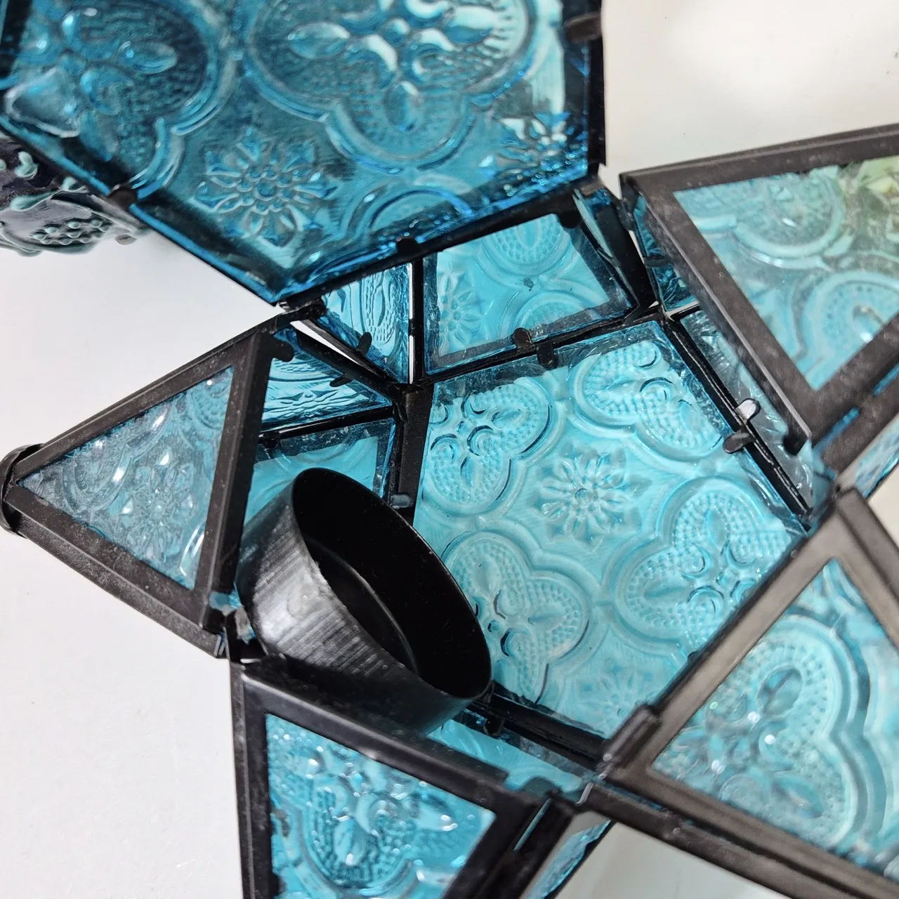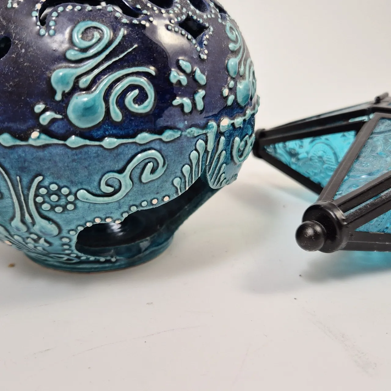 Hängande lykta glas och metall H. 18.5cm , ljuslykta keramik