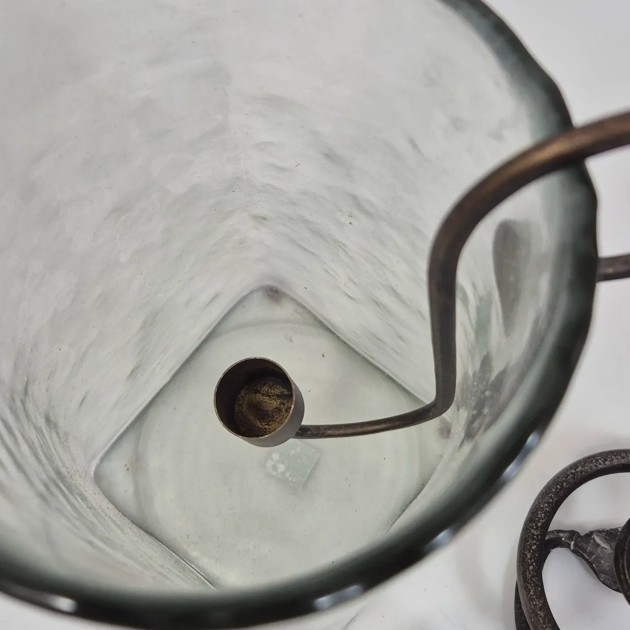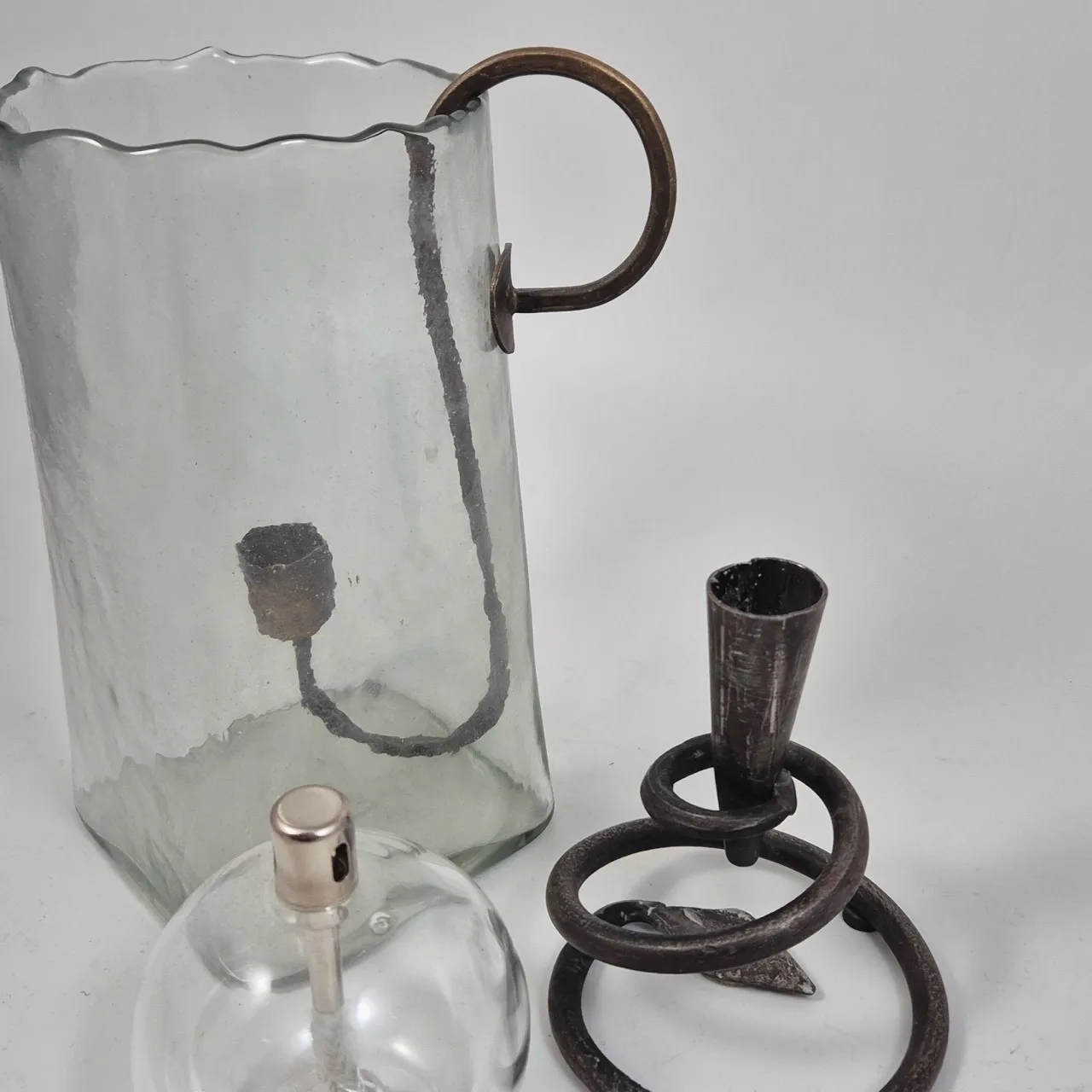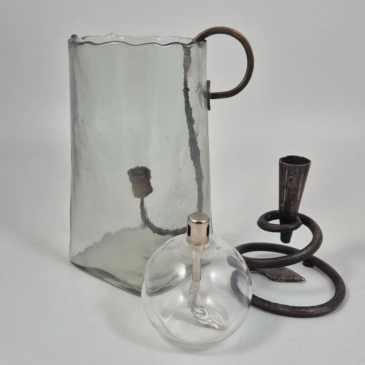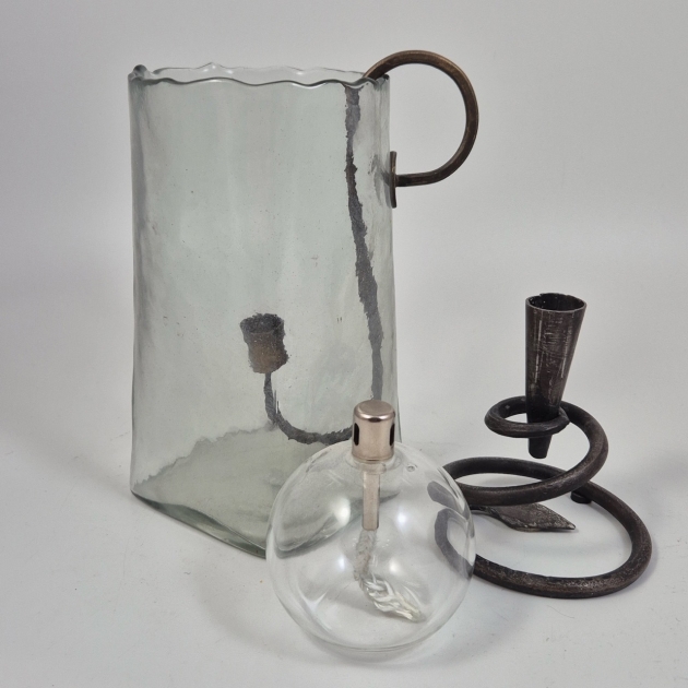 Ljusstake i vas H.20cm , liten oljelampa, smidesljusstake